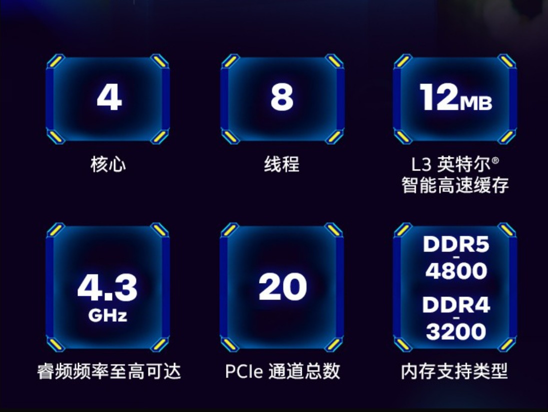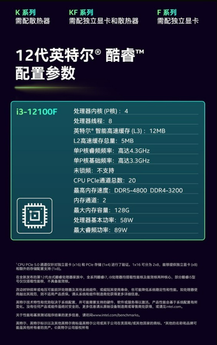 基本参数适用类型台式机CPU系列酷睿i3 12代系列制作工艺10纳米核心代号Alder LakeCPU架构Golden CovePCI Express版本PCIe 4.0、PCIe 5.0发布日期2022年Q1
