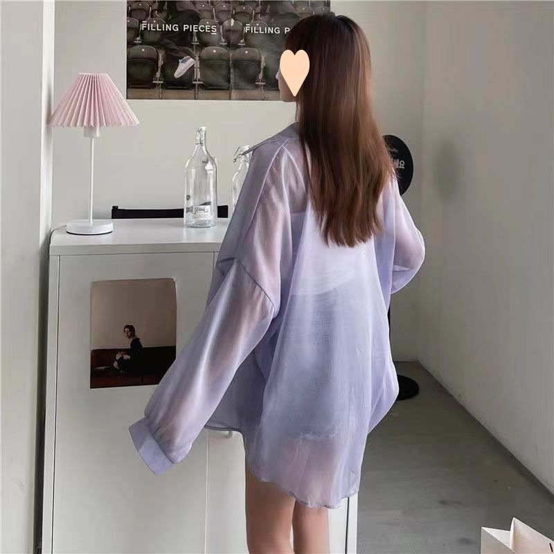 여성을 위한 반짝이는 진주빛 원사 쉬폰 긴팔 셔츠, 봄 여름 루즈하고 활용도가 높은 셔츠, 재킷, 에어컨 셔츠, 얇은 스타일스토어 가기