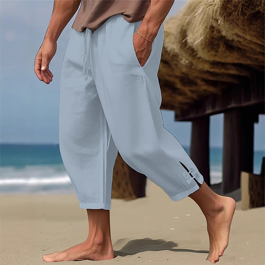 국경 간 아마존 남성 린넨 9부 바지 비치 바지 솔리드 컬러 바지 슬릿 통기성 캐주얼 데일리 휴가 바지스토어 가기