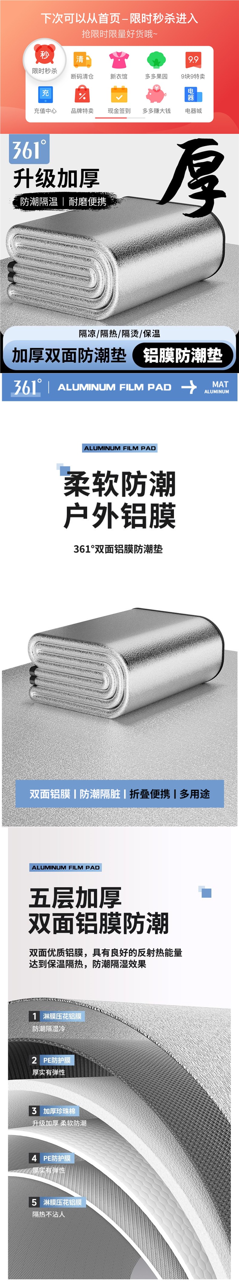 361 ° 야외 캠핑용 방습 매트, 두꺼운 텐트용 수면 매트, 가정용 바닥재, 접이식 피크닉 방습 매트스토어 가기