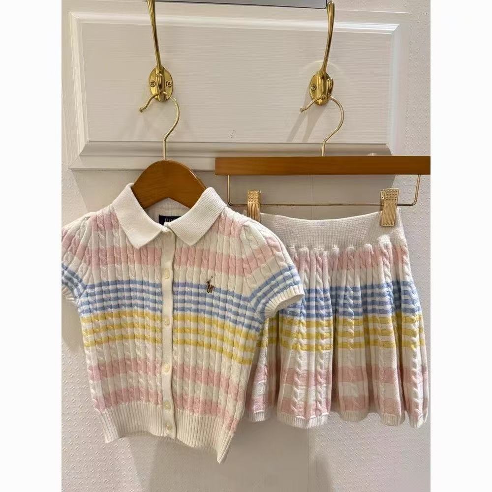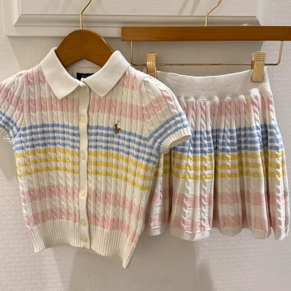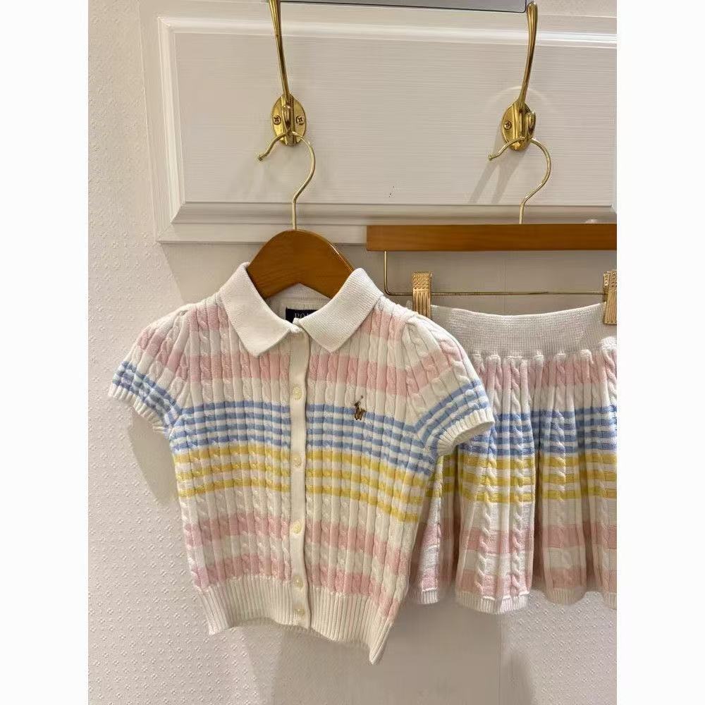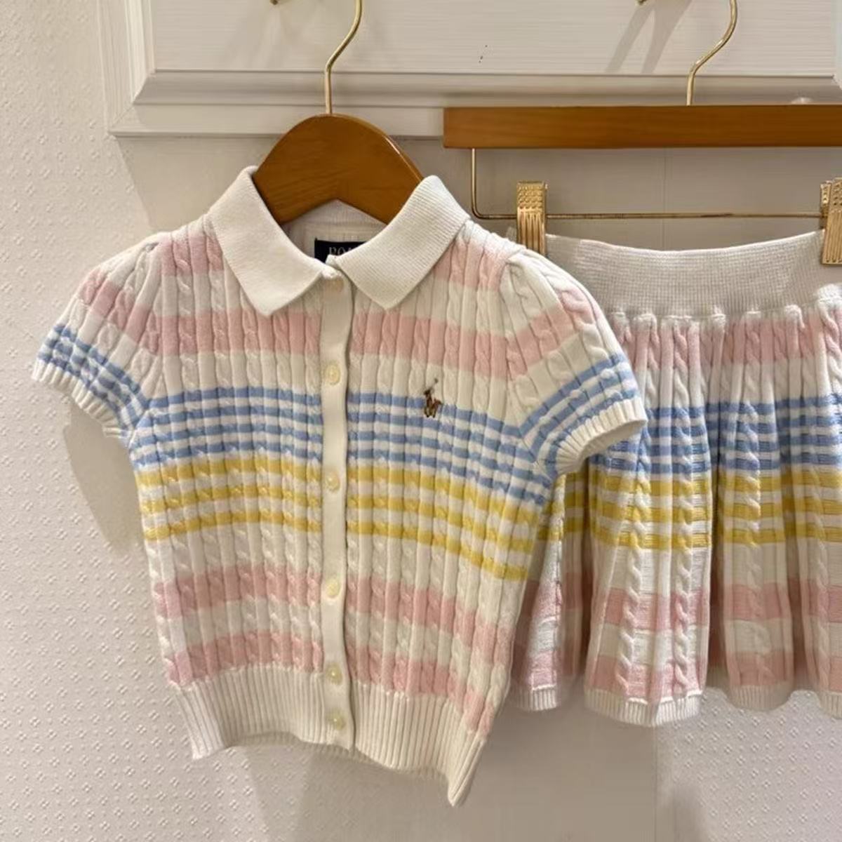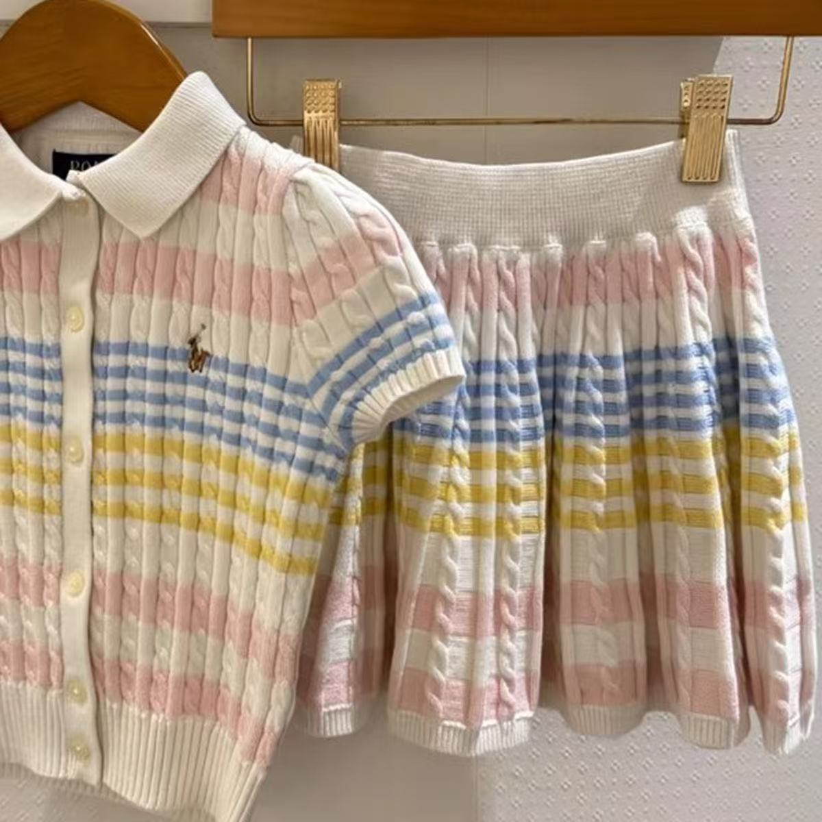 한국 아동복 2025 봄 여름 신상 3색 아이스크림 니트 슈트 여아 폴로 칼라 반팔 가디건 스커트