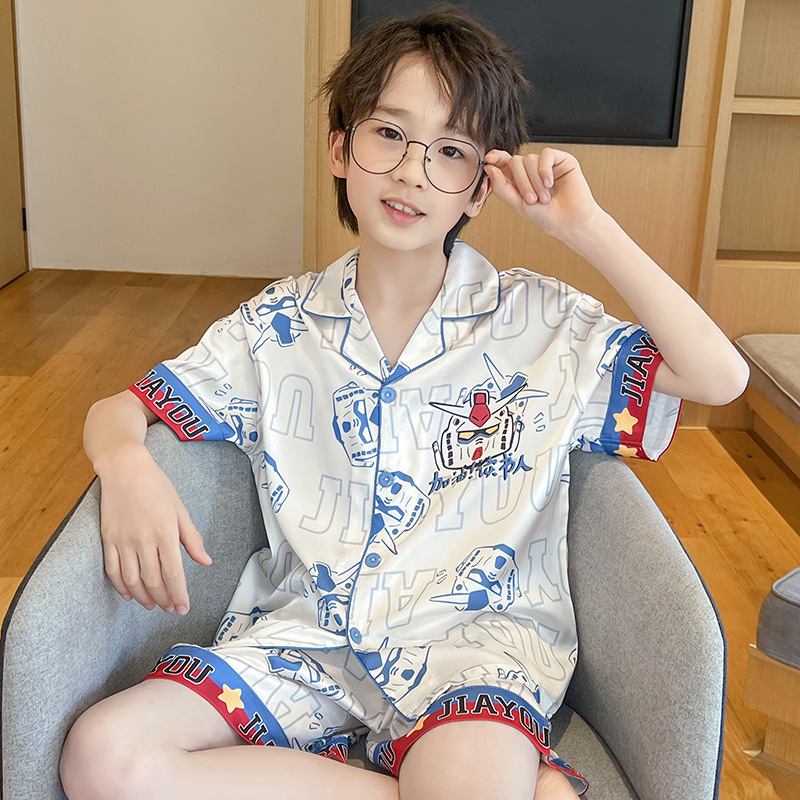 어린이 잠옷 여름 얼음 실크 얇은 반팔 만화 소년 여름 소년 아기 중대형 어린이 가정 의류 세트