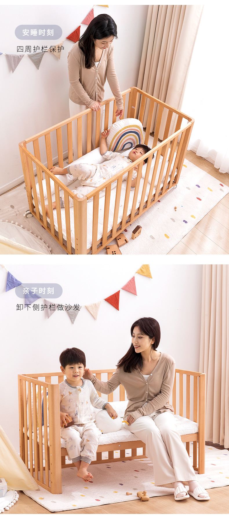 맞춤형 너도밤 나무 유아용 침대 단단한 나무 접합 침대 다기능 조절 가능한 단단한 나무 어린이 침대 소파 침대 아기 침대