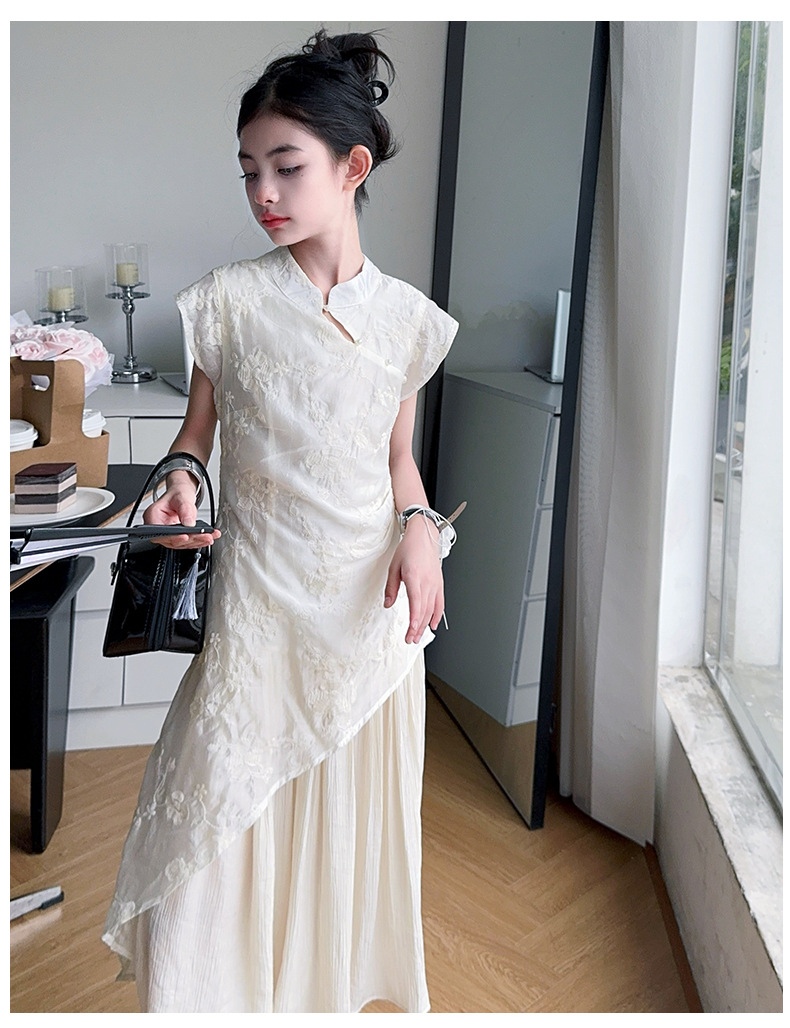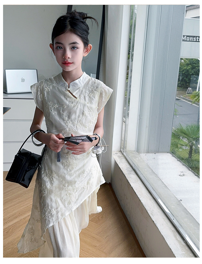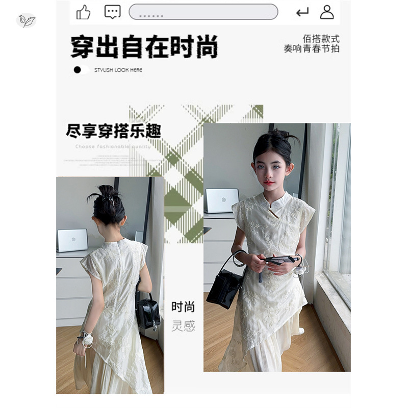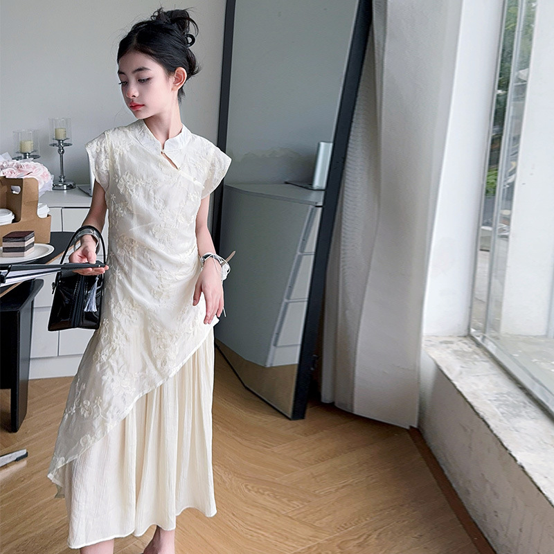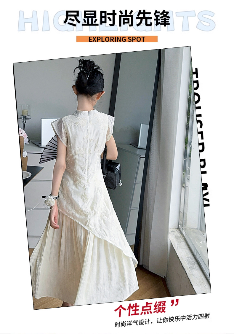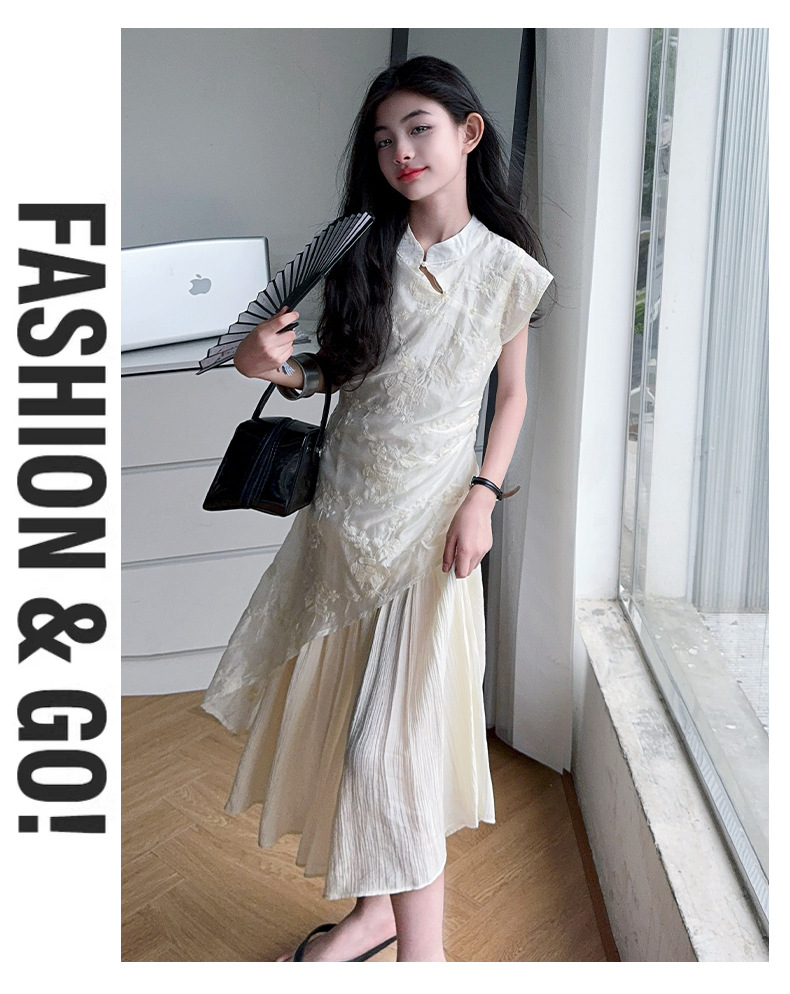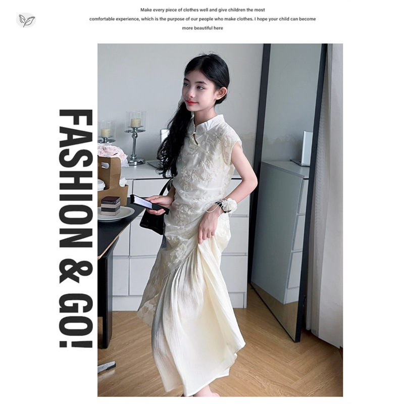 여아 드레스 여름 2025 새로운 스타일의 중국식 치파오 드레스, 큰 어린이 스타일 허리 긴 스커트, 어린이 스커트 유행