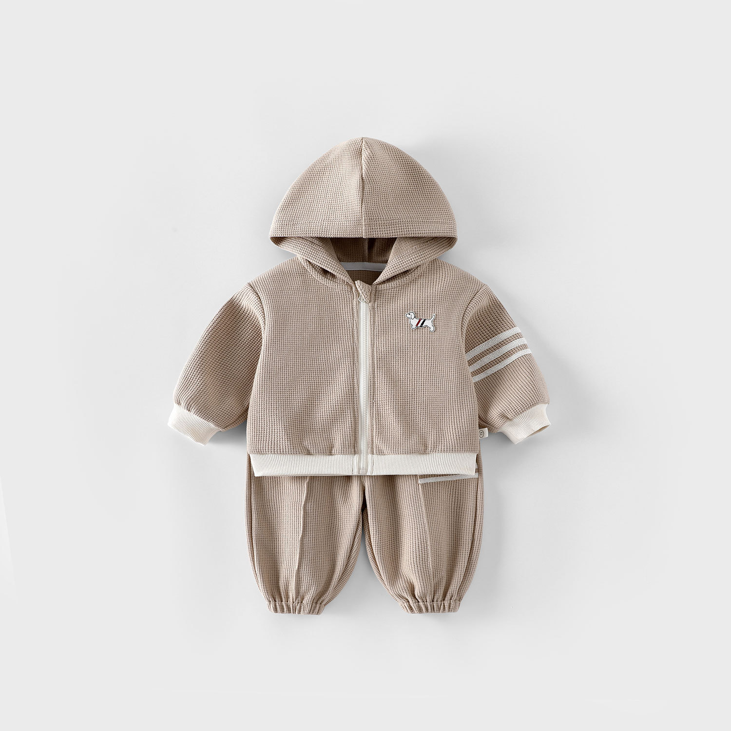 아동용 와플 슈트 2025 새로운 가을 소녀 라벨 후드 자켓 소년 한국 스타일 스웨트 팬츠 투피스 세트