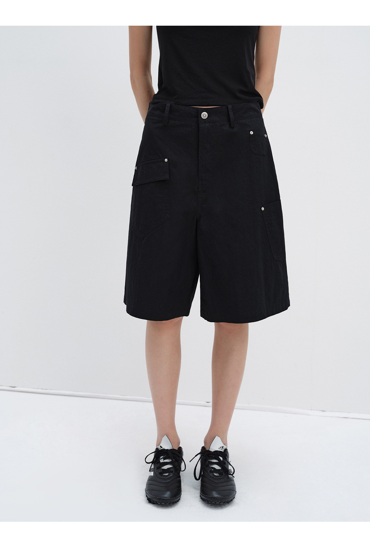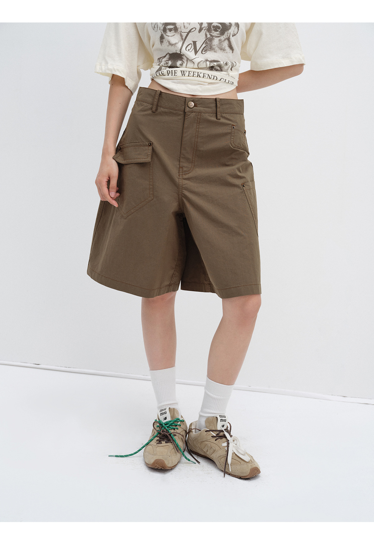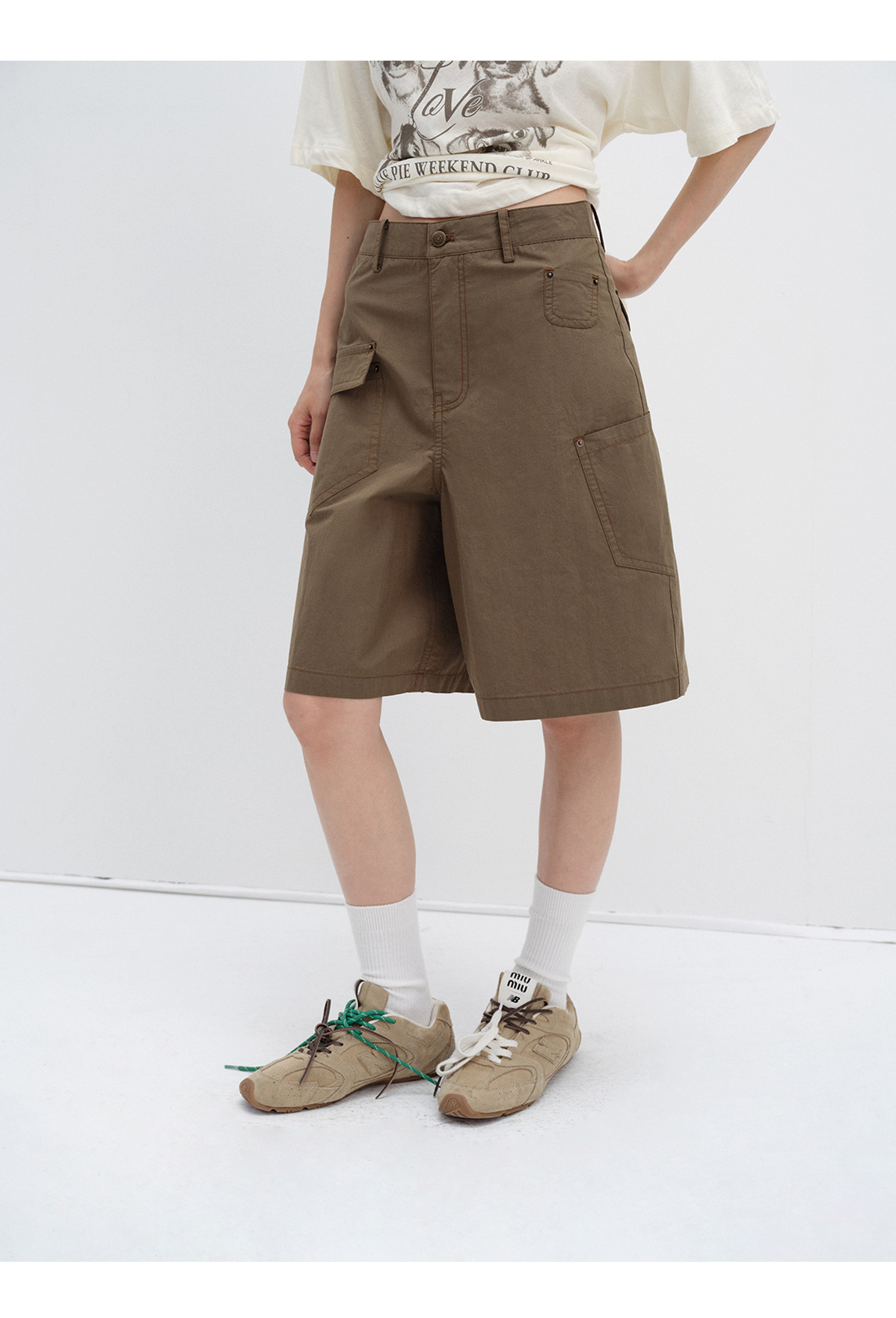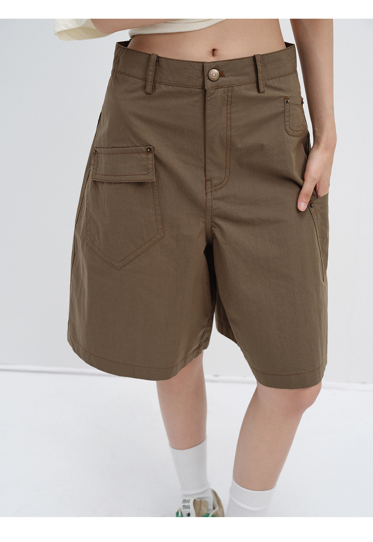 [시티] 신상 레트로 샌드워시 스터드 캐주얼 루즈한 다리 모양 수정 멀티 포켓 여성용 카고반바지 V8899