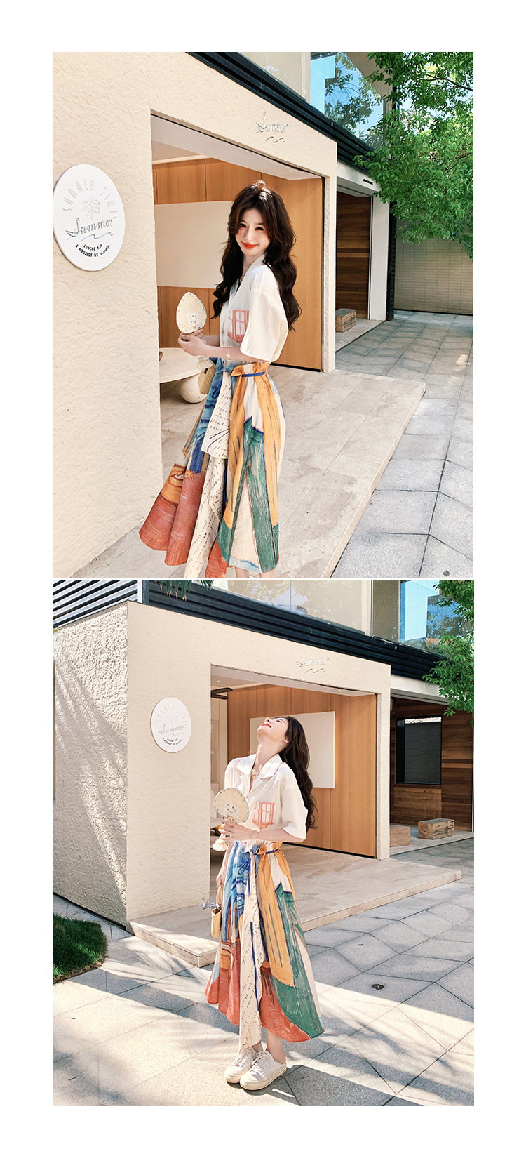 디자인 틈새 유화 프린트 스커트 캐주얼 슬리밍 셔츠 투피스 드레스 여성 여름 새 스타일