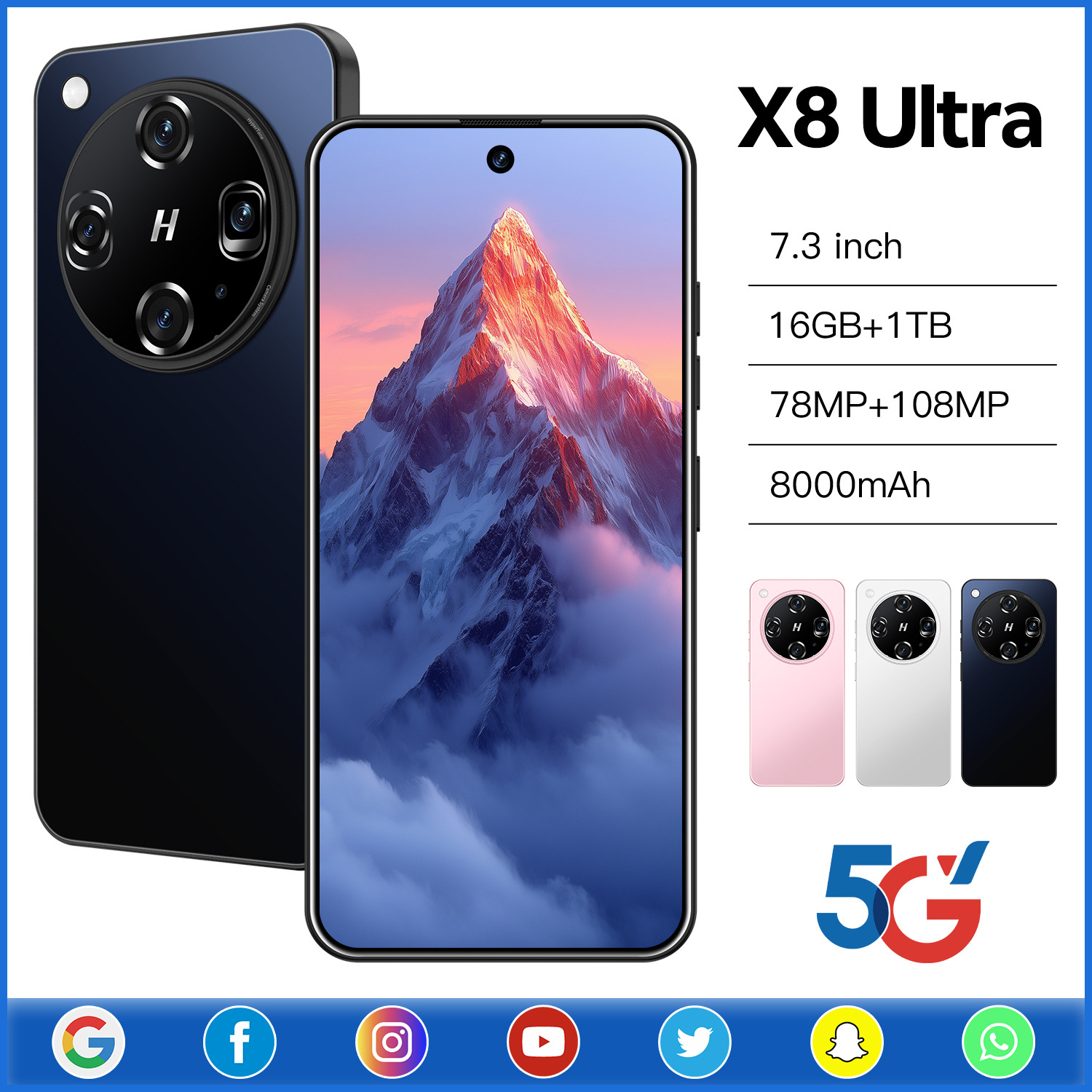 국경 간 새로운 X8 Ultra Android 스마트폰 7.3inch 천공 대형 화면 16+1T 국경 간 전자 상거래는 대리인으로 배송될 수 있습니다.
