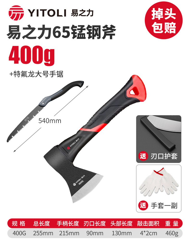• [톱, 도끼, 망치 3가지 용도] 플라스틱 코팅 손잡이 도끼 400G + 대형 접이식 톱(칼날 보호 커버 + 장갑 포함)