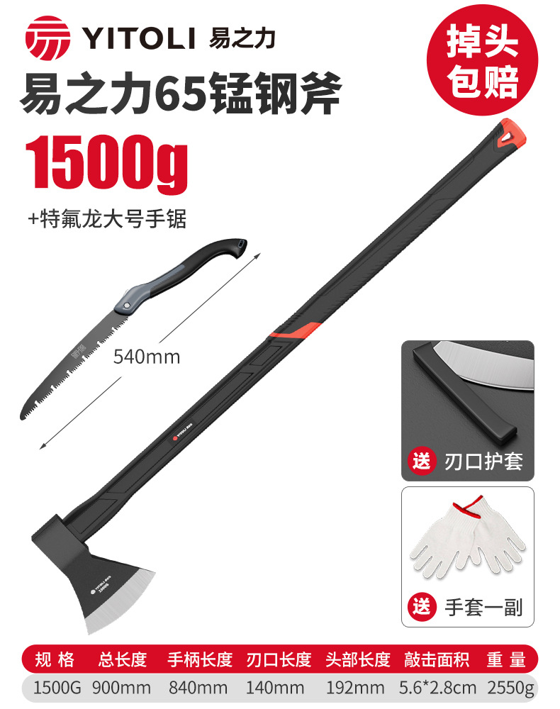 • [톱, 도끼, 망치 3가지 용도] 플라스틱 코팅 손잡이 도끼 1500G + 대형 접이식 톱(칼날 보호 커버 + 장갑 포함)