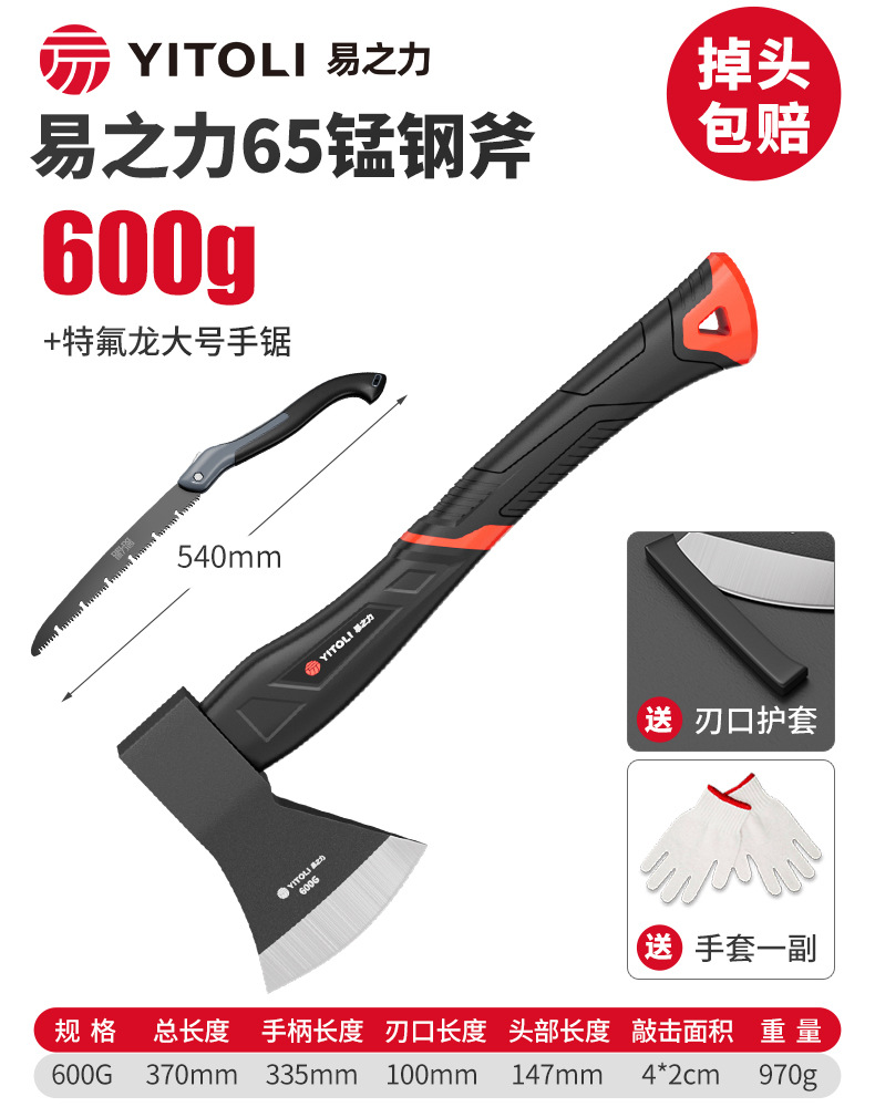 • [톱, 도끼, 망치 3가지 용도] 플라스틱 코팅 손잡이 도끼 600G + 대형 접이식 톱(칼날 보호 커버 + 장갑 포함)