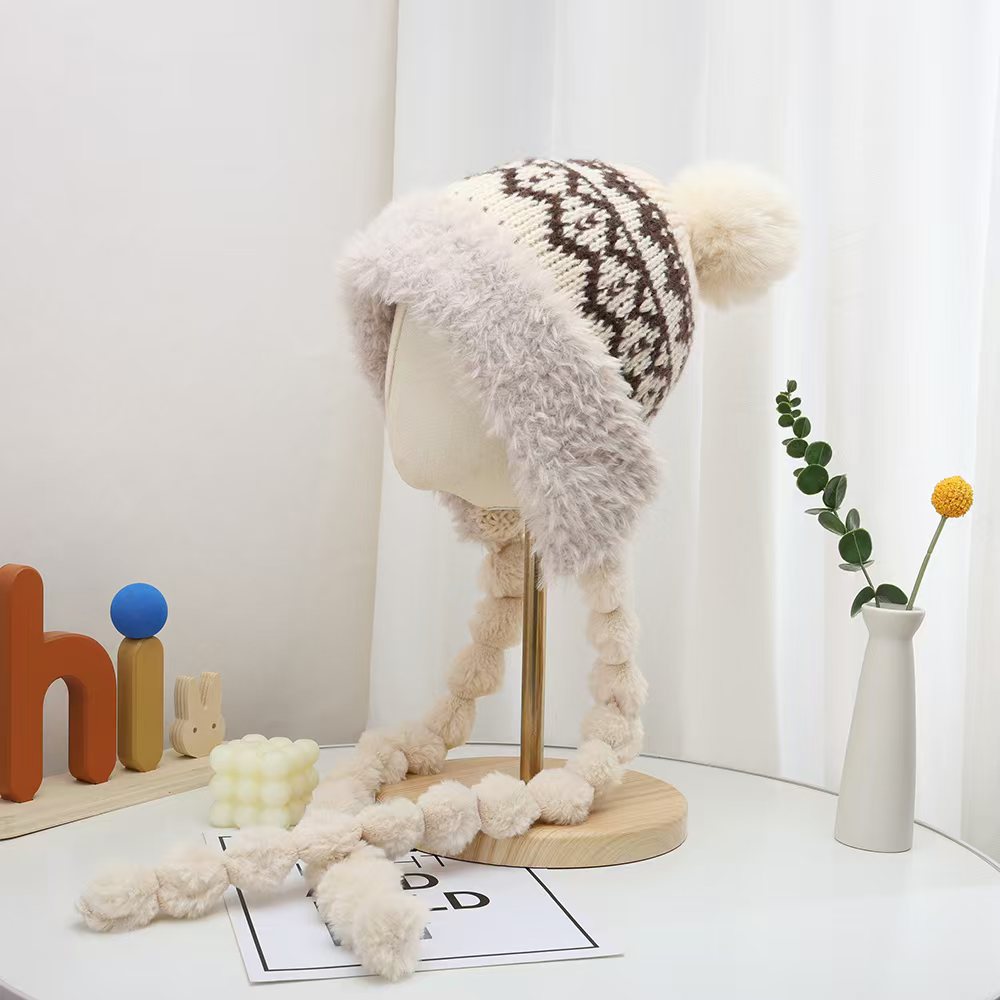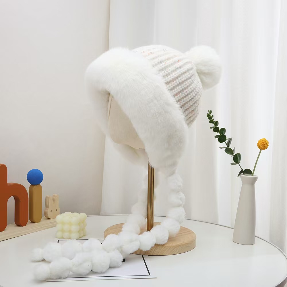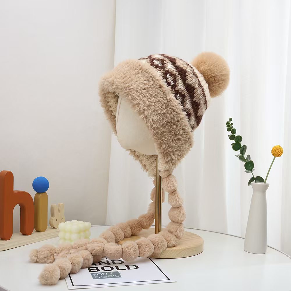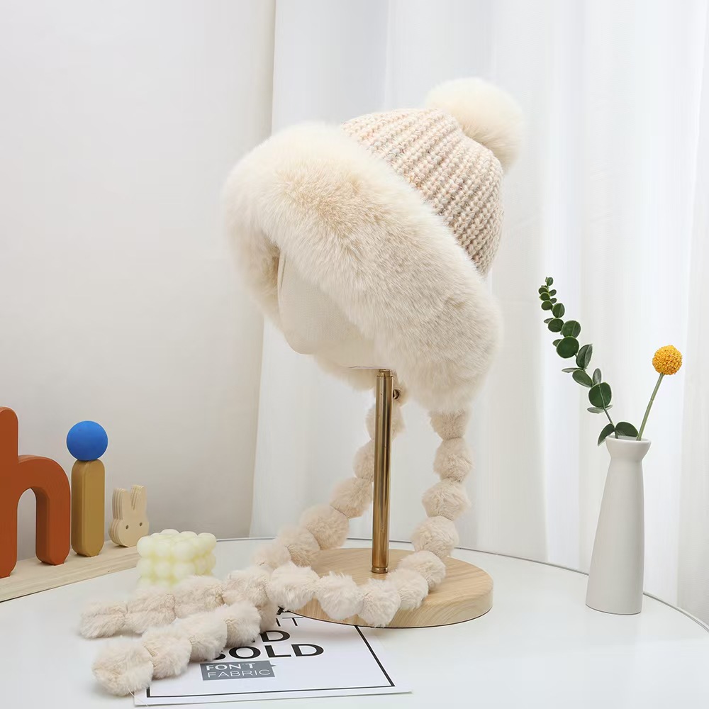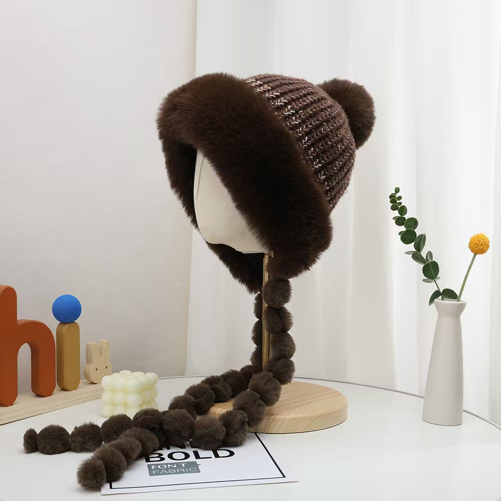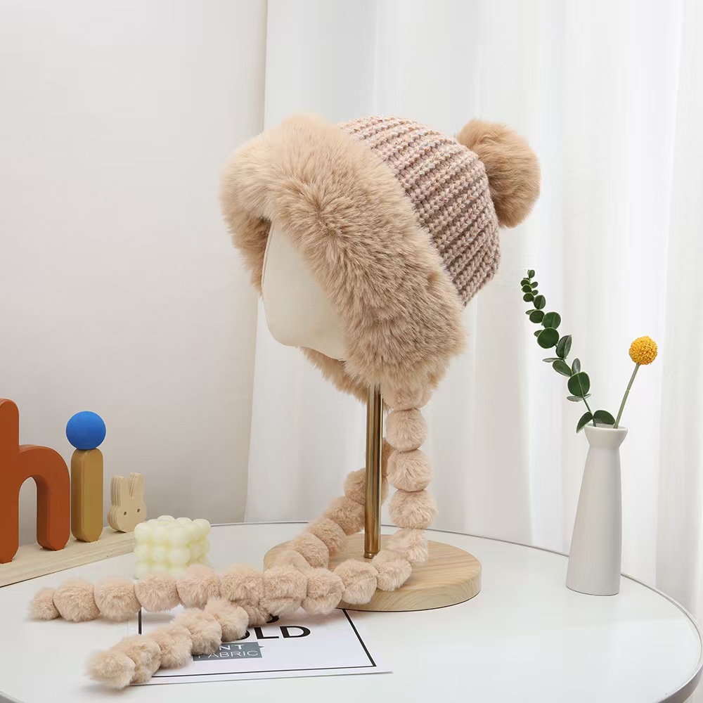 여성을 위한 겨울 따뜻한 귀 보호 컬러 로프 플러시 모자, 다용도 방풍 니트 모직 모자, 벨벳 및 두꺼운 사이클링 풀오버 모자