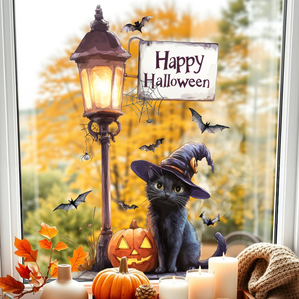 Yiyao JD3492 할로윈 새로운 공포 호박 마녀 모자 새끼 고양이 창 스티커 룸 유리 장식 정전기 스티커스토어 가기