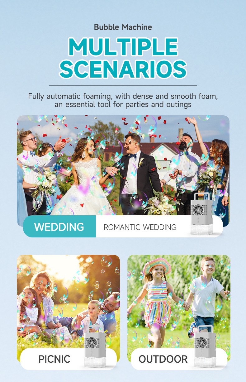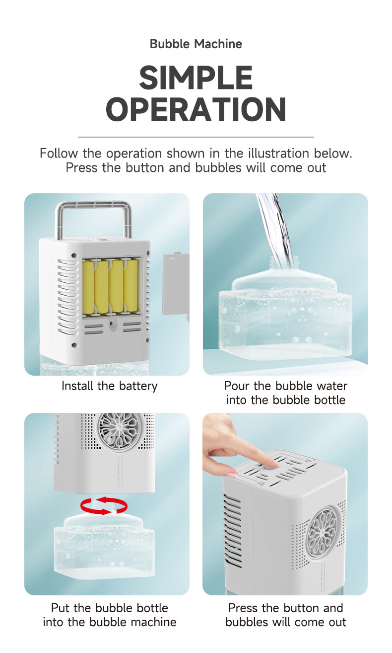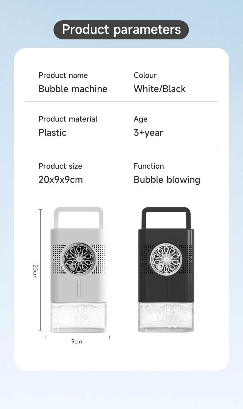 产品功能:双供电模式(USB直冲供电),(4节AA电池供电),带蓝红色灯光、400毫升大容量泡泡水盒。