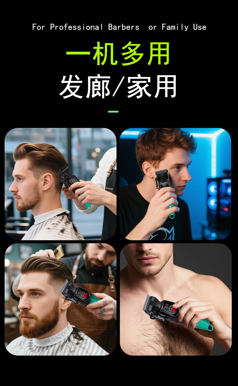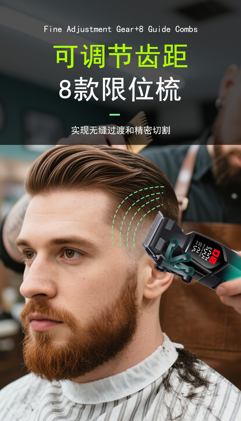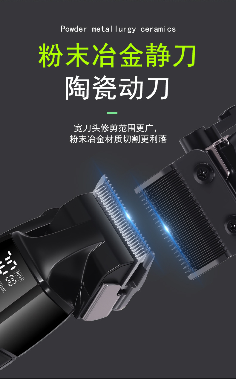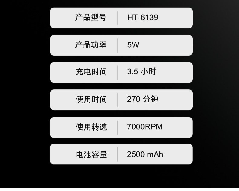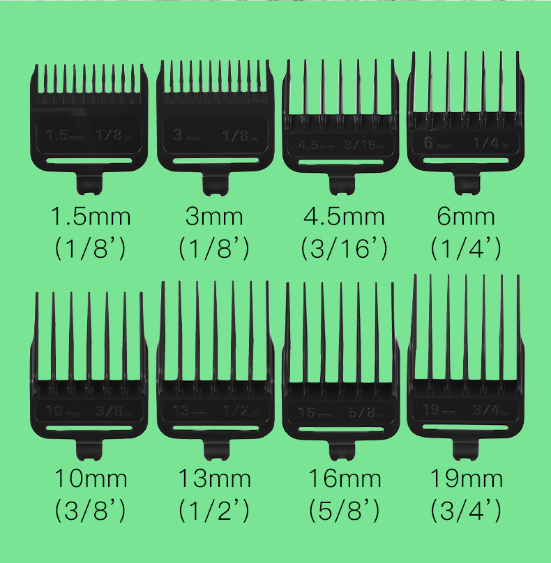 产品配置:理发器+限位梳(1.5/3/4.5/6/10/13/16/19MM)+清洁刷+润滑油+USB线+刀头保护盖+多国说明书