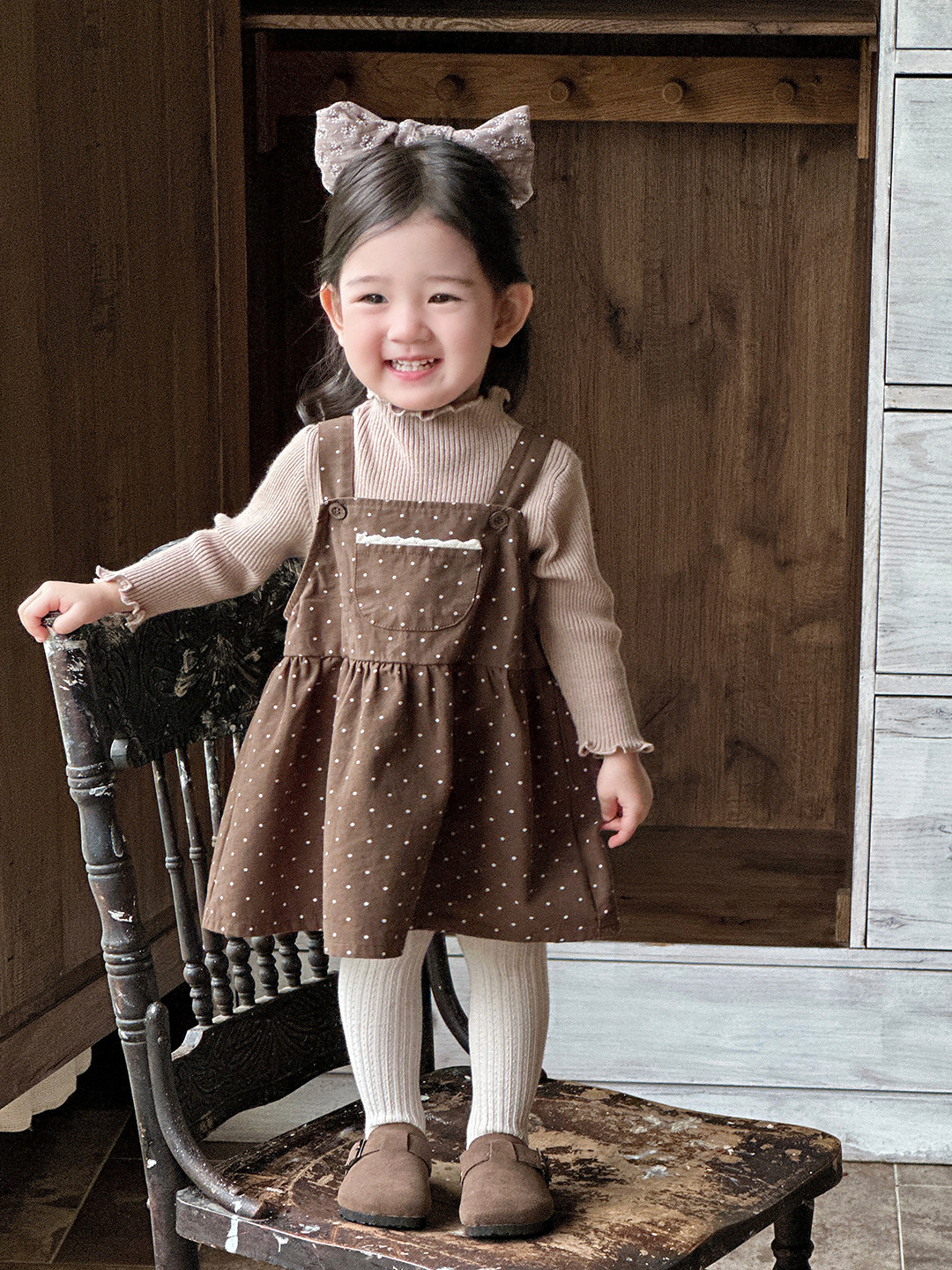 여자 아기 봄, 가을 정장 달콤한 폴카 도트 대형 포켓 드레스 귀 바닥 스웨터 조끼 드레스 투피스 세트