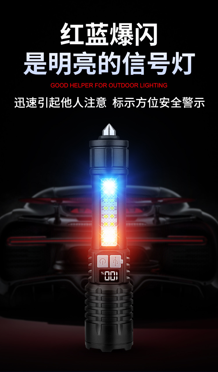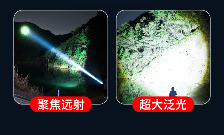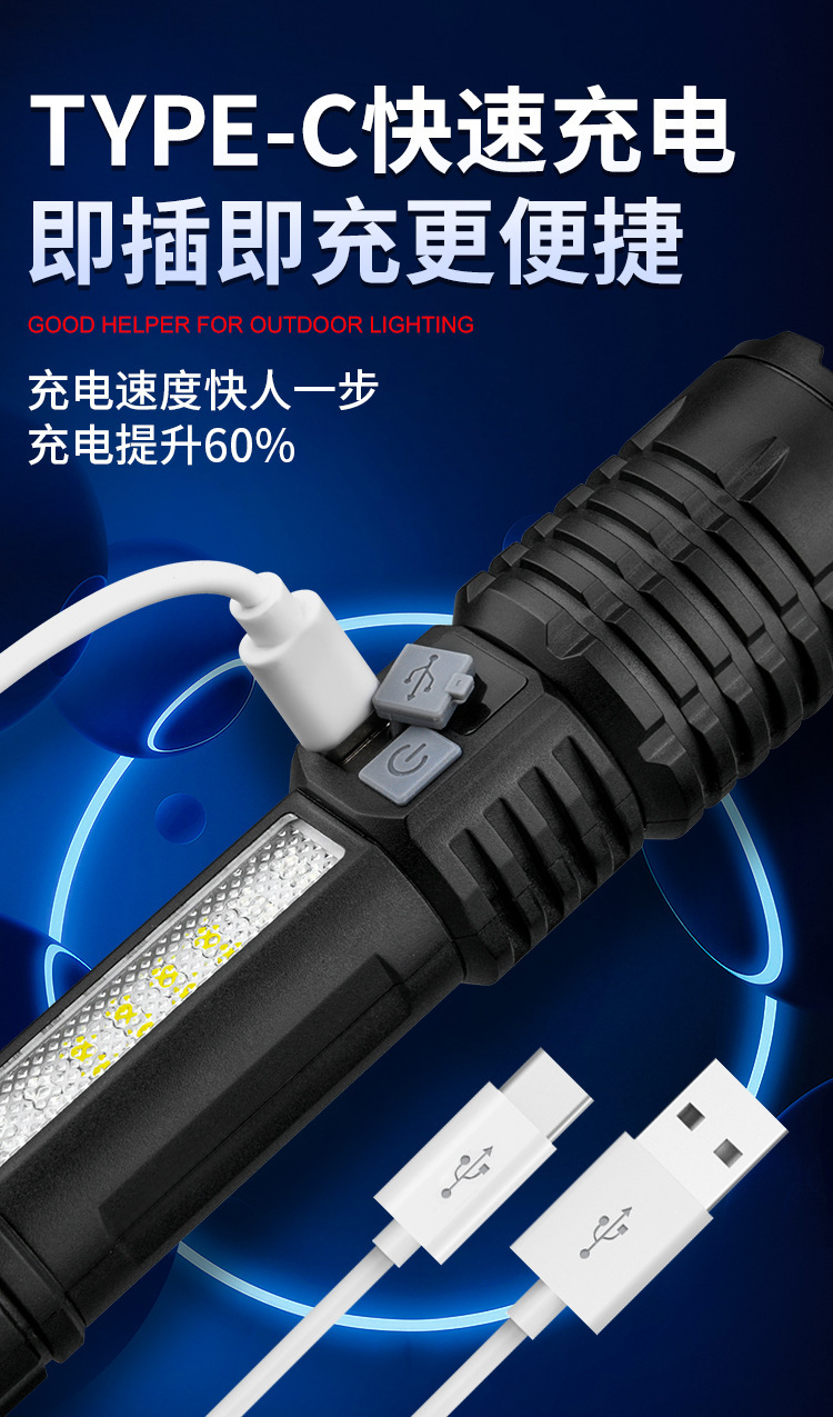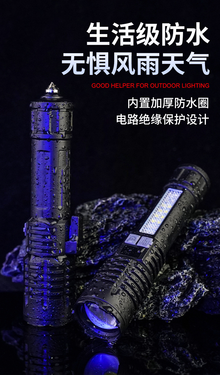 새로운 개폐식 밝은 손전등 충전식 야외 줌 장거리 빨간색과 파란색 플래시 다기능 LED 손전등