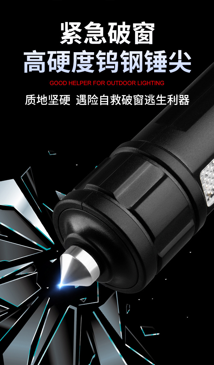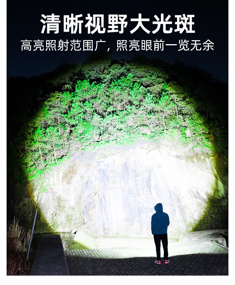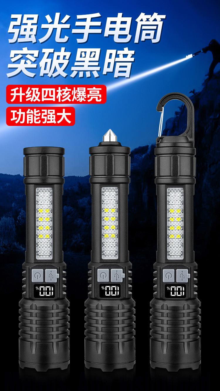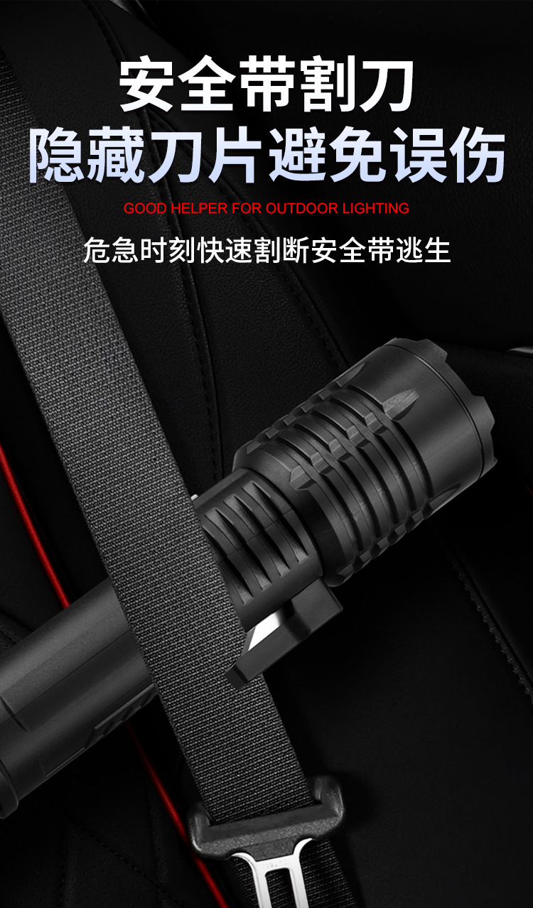새로운 개폐식 밝은 손전등 충전식 야외 줌 장거리 빨간색과 파란색 플래시 다기능 LED 손전등