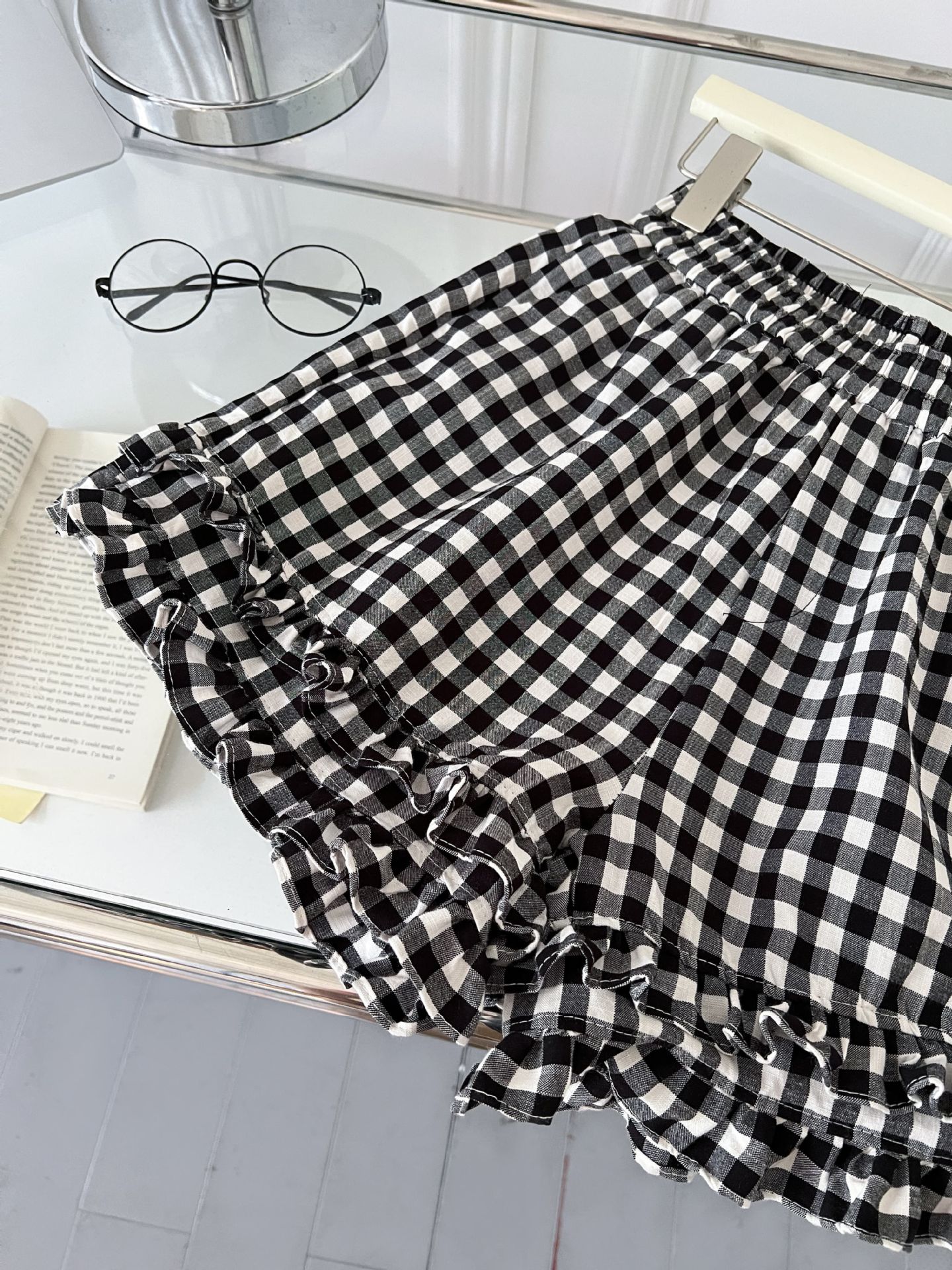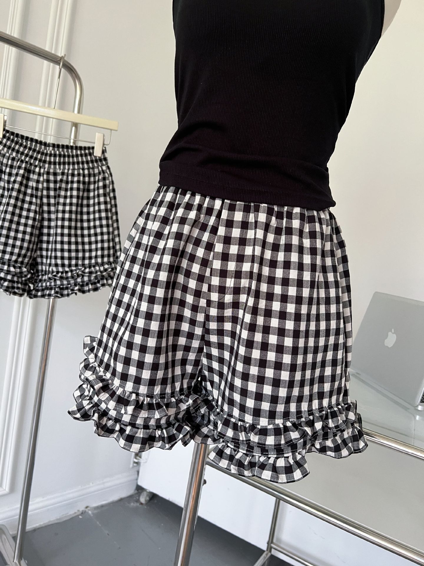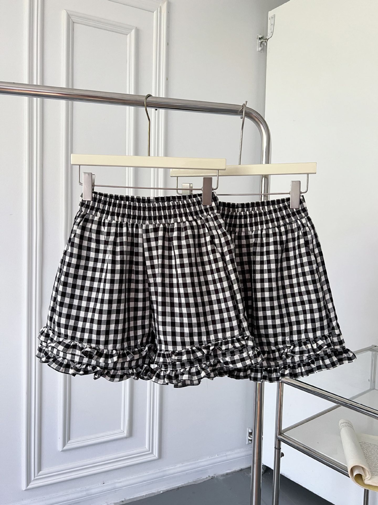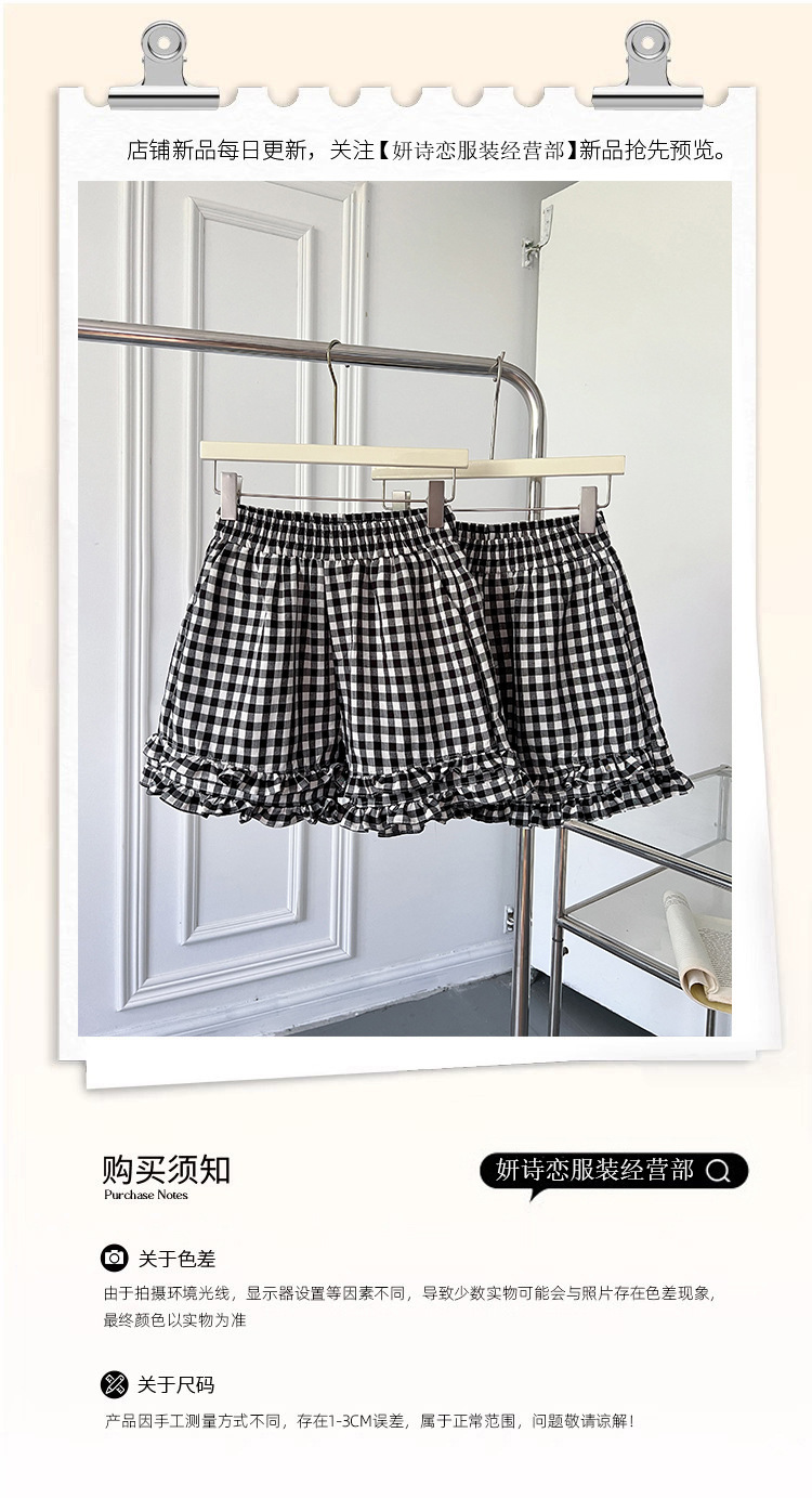 여성을위한 흑백 격자 무늬 프릴 반바지 여름 2025 새로운 탄성 허리 대학 스타일 스트레이트 와이드 레그 하의 핫 바지스토어 가기