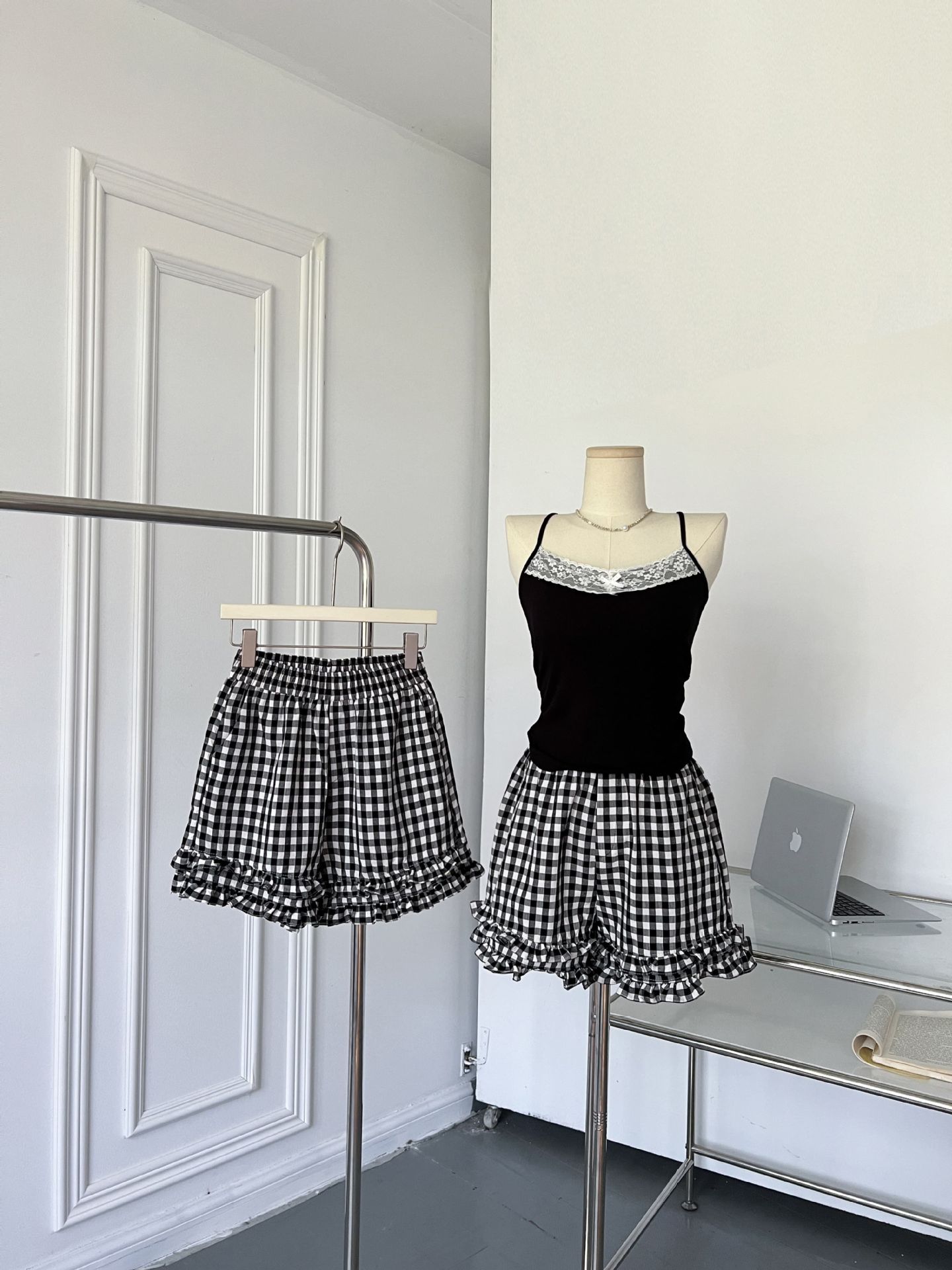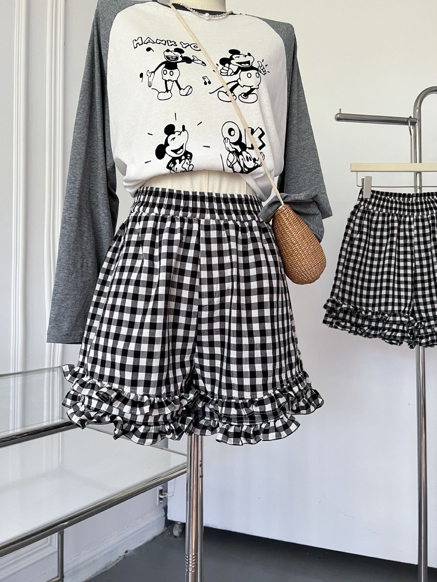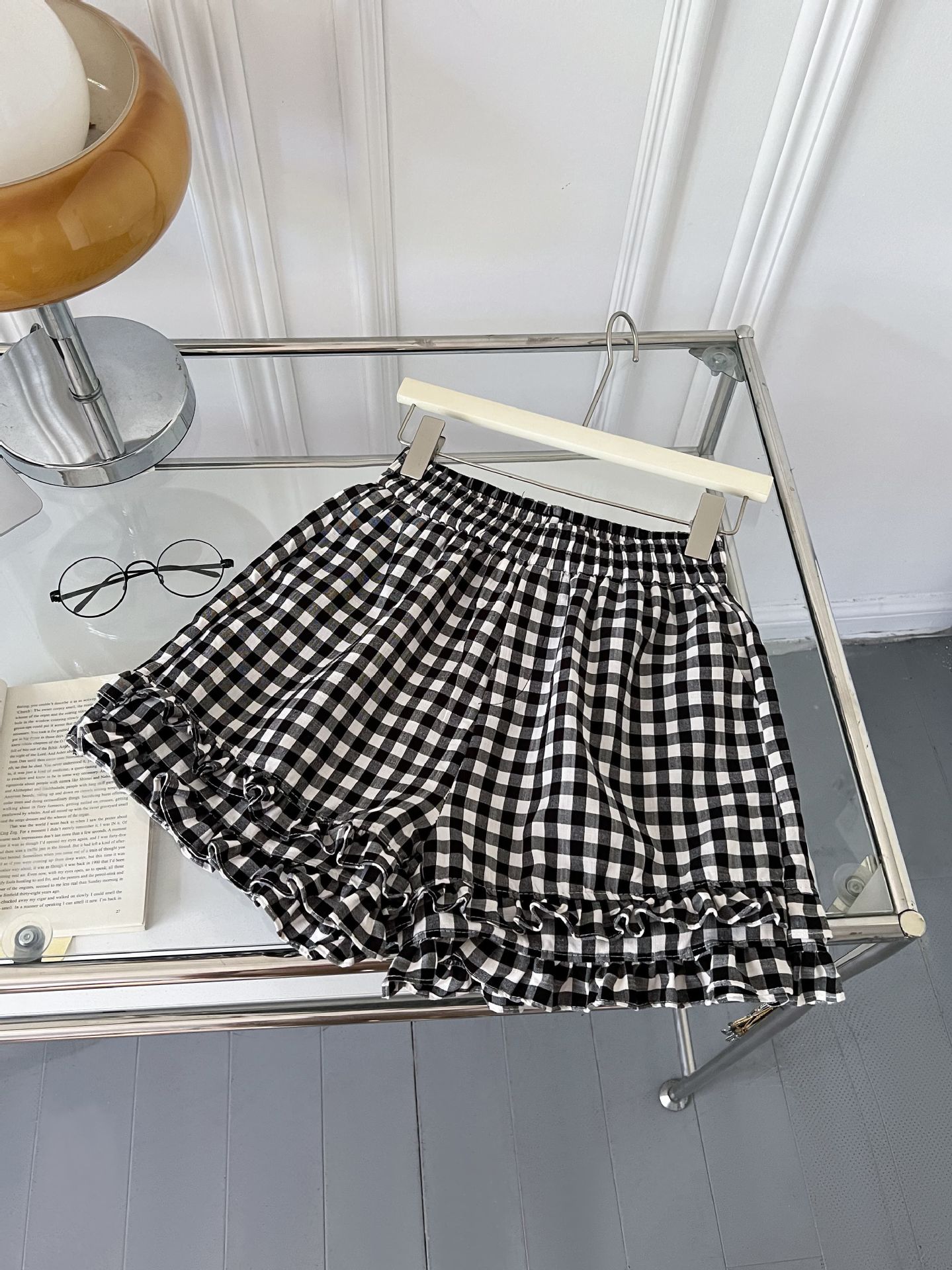 여성을위한 흑백 격자 무늬 프릴 반바지 여름 2025 새로운 탄성 허리 대학 스타일 스트레이트 와이드 레그 하의 핫 바지스토어 가기