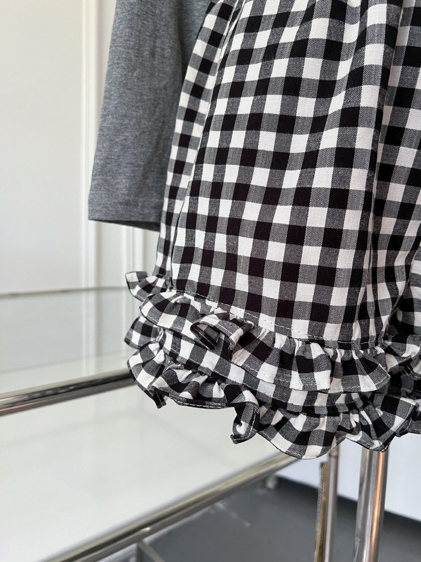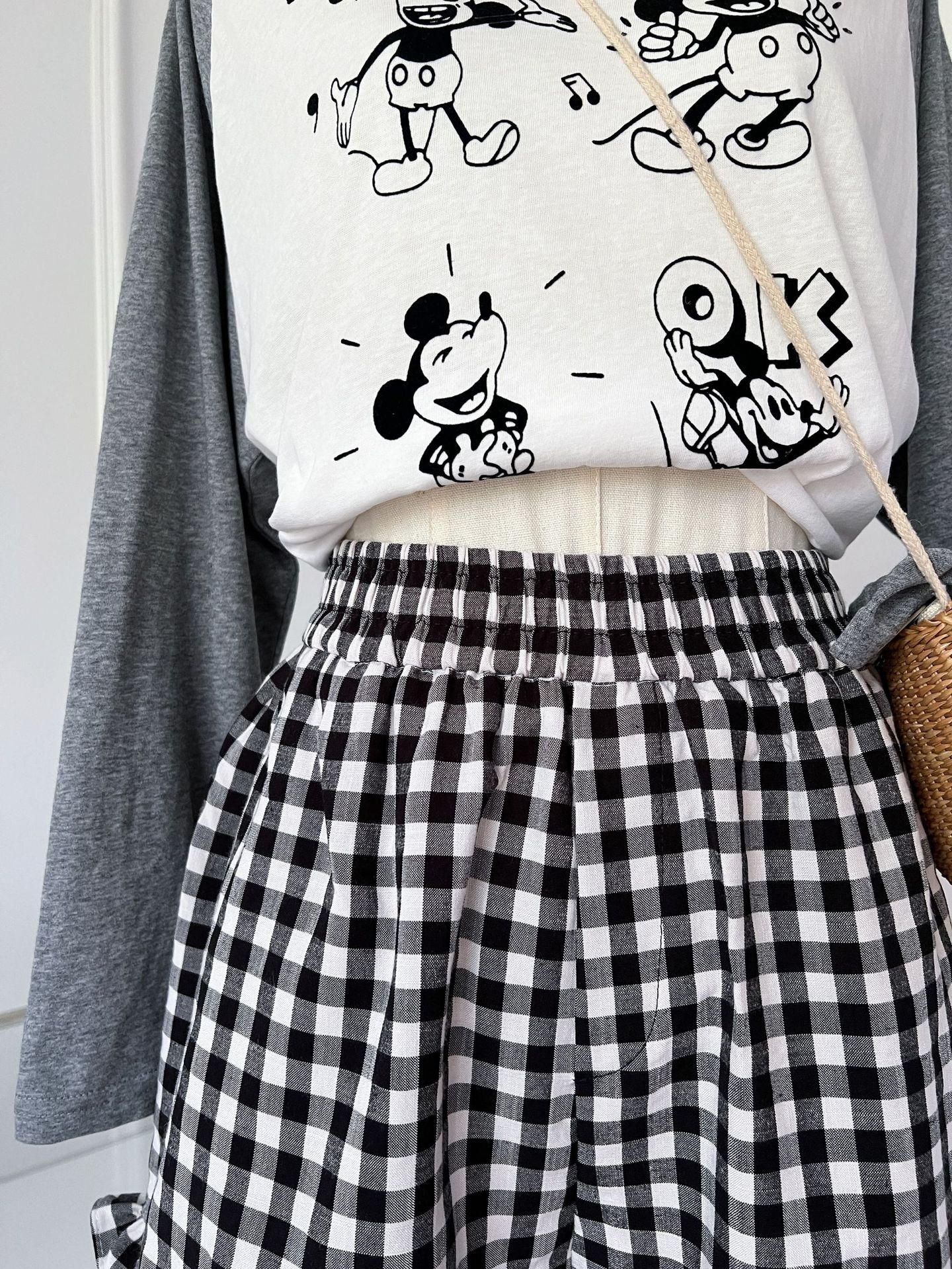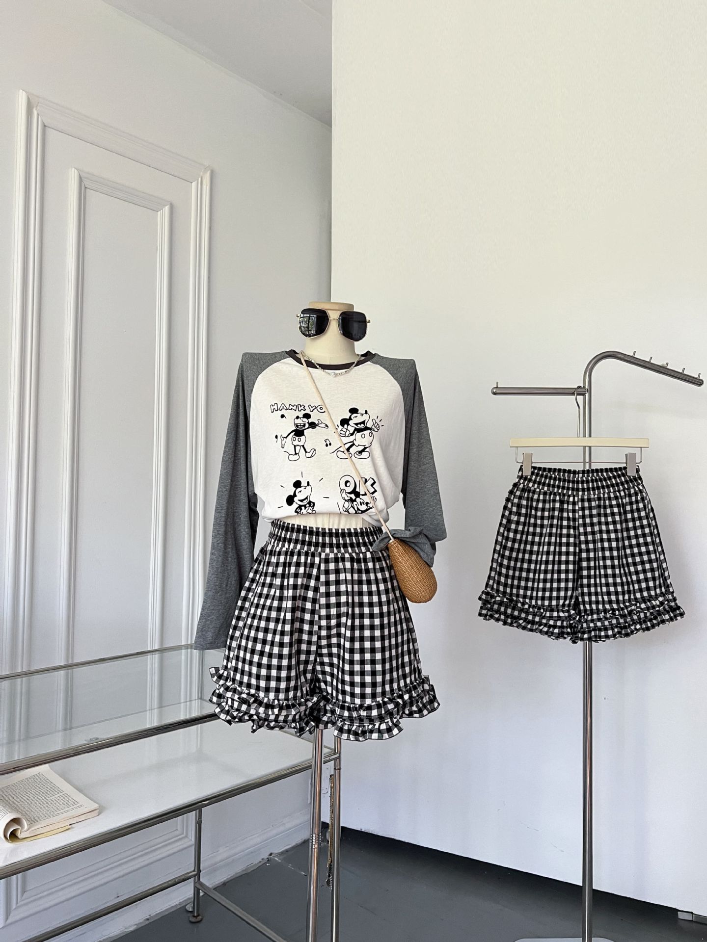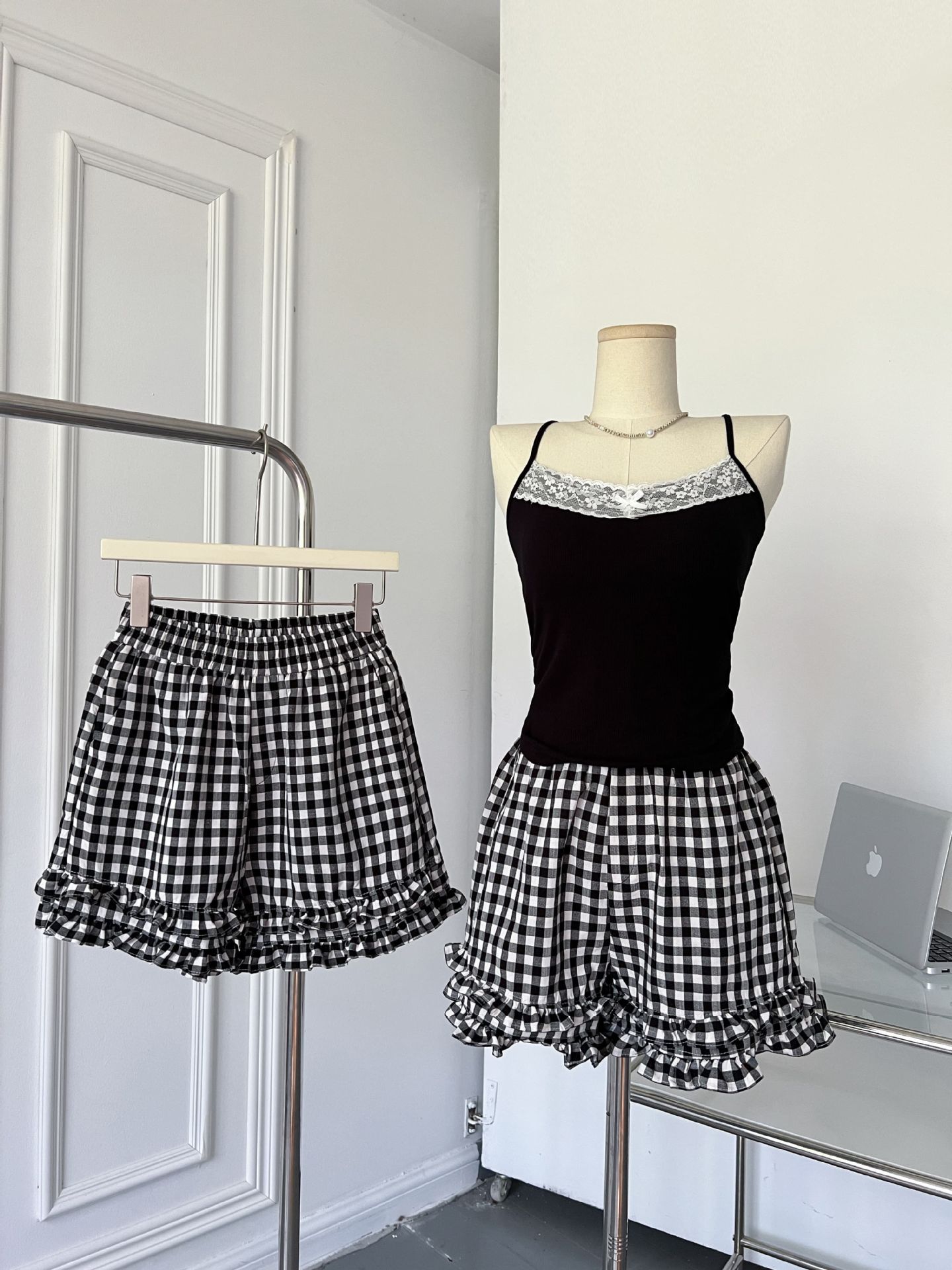 여성을위한 흑백 격자 무늬 프릴 반바지 여름 2025 새로운 탄성 허리 대학 스타일 스트레이트 와이드 레그 하의 핫 바지스토어 가기