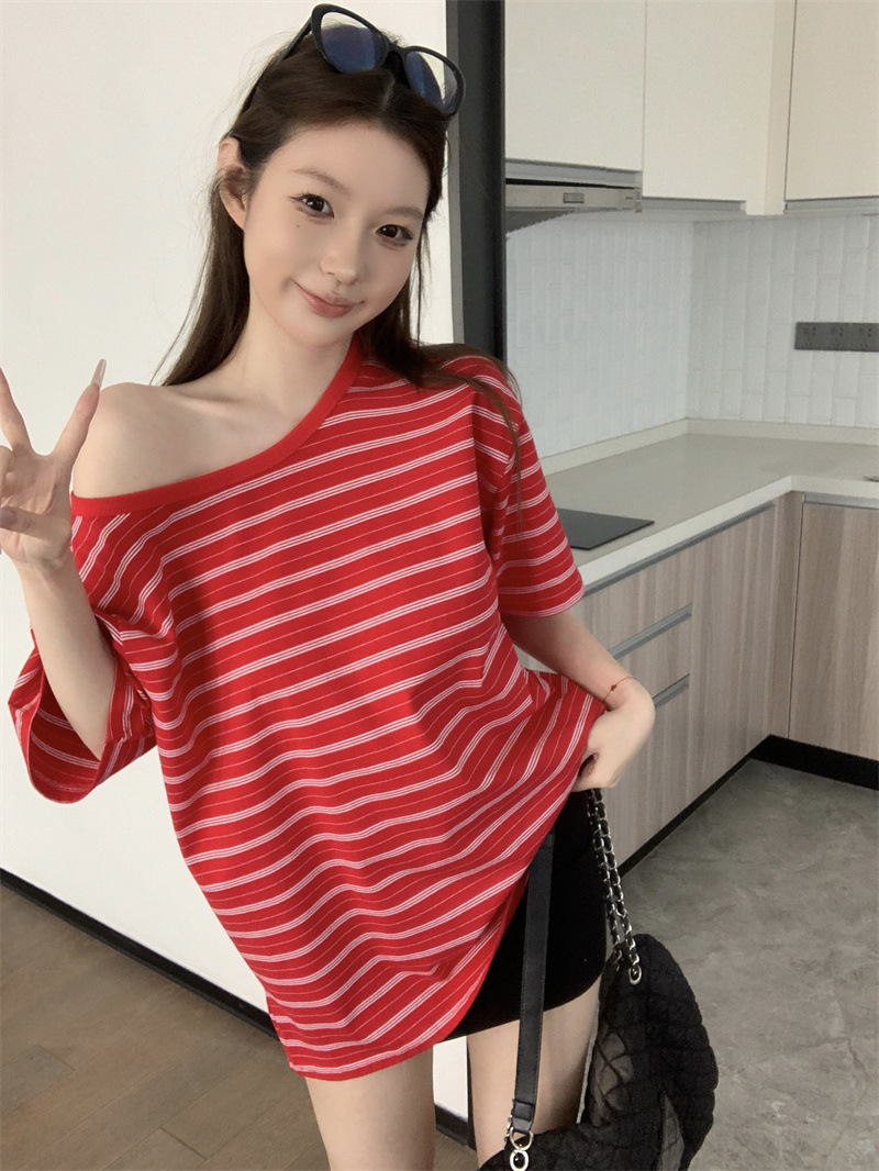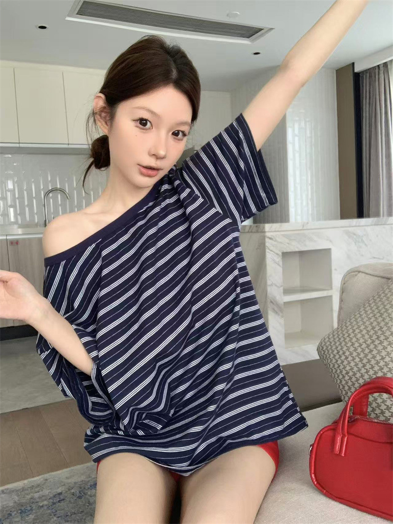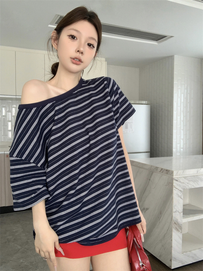 여성을위한 미국 대비 색 줄무늬 경사 어깨 반팔 티셔츠 여름 2025 새로운 기능 느슨한 슬리밍 다목적 풀오버 탑