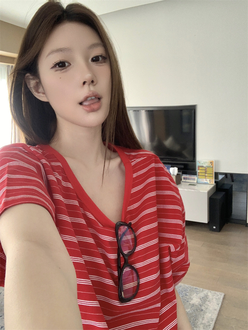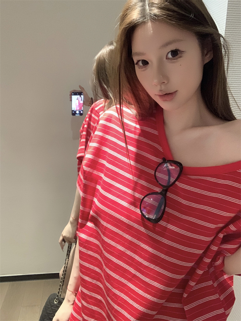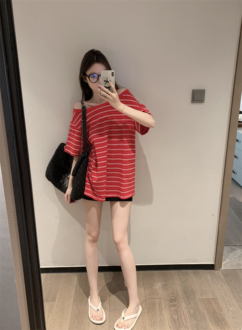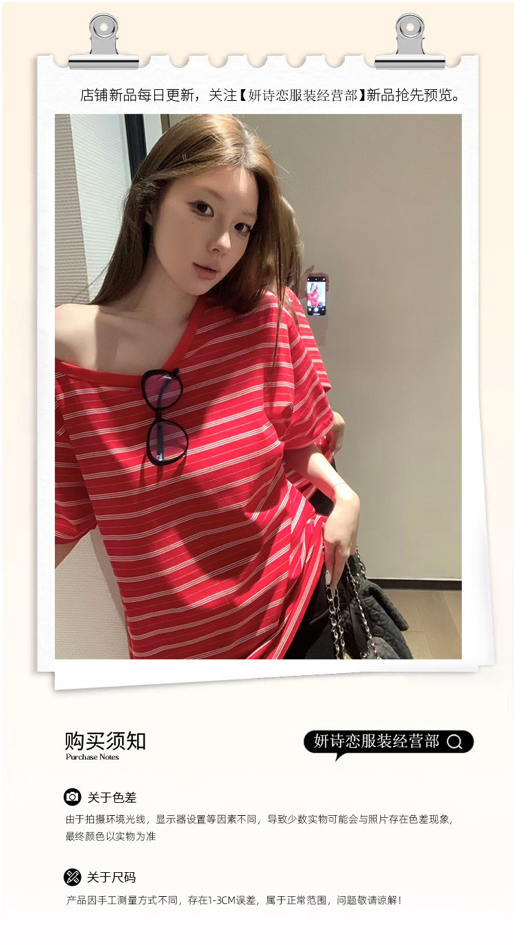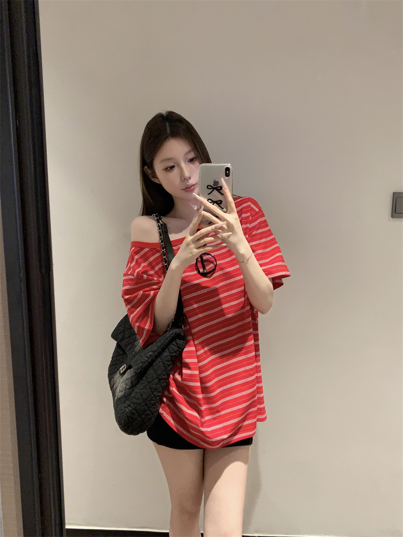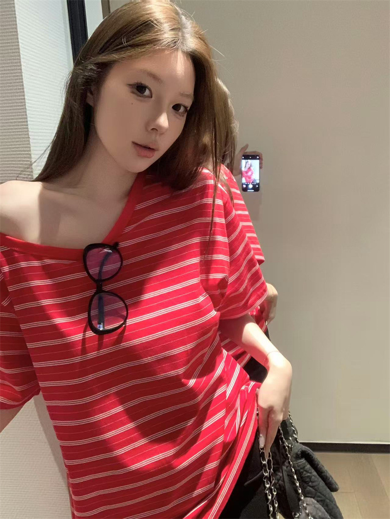 여성을위한 미국 대비 색 줄무늬 경사 어깨 반팔 티셔츠 여름 2025 새로운 기능 느슨한 슬리밍 다목적 풀오버 탑스토어 가기