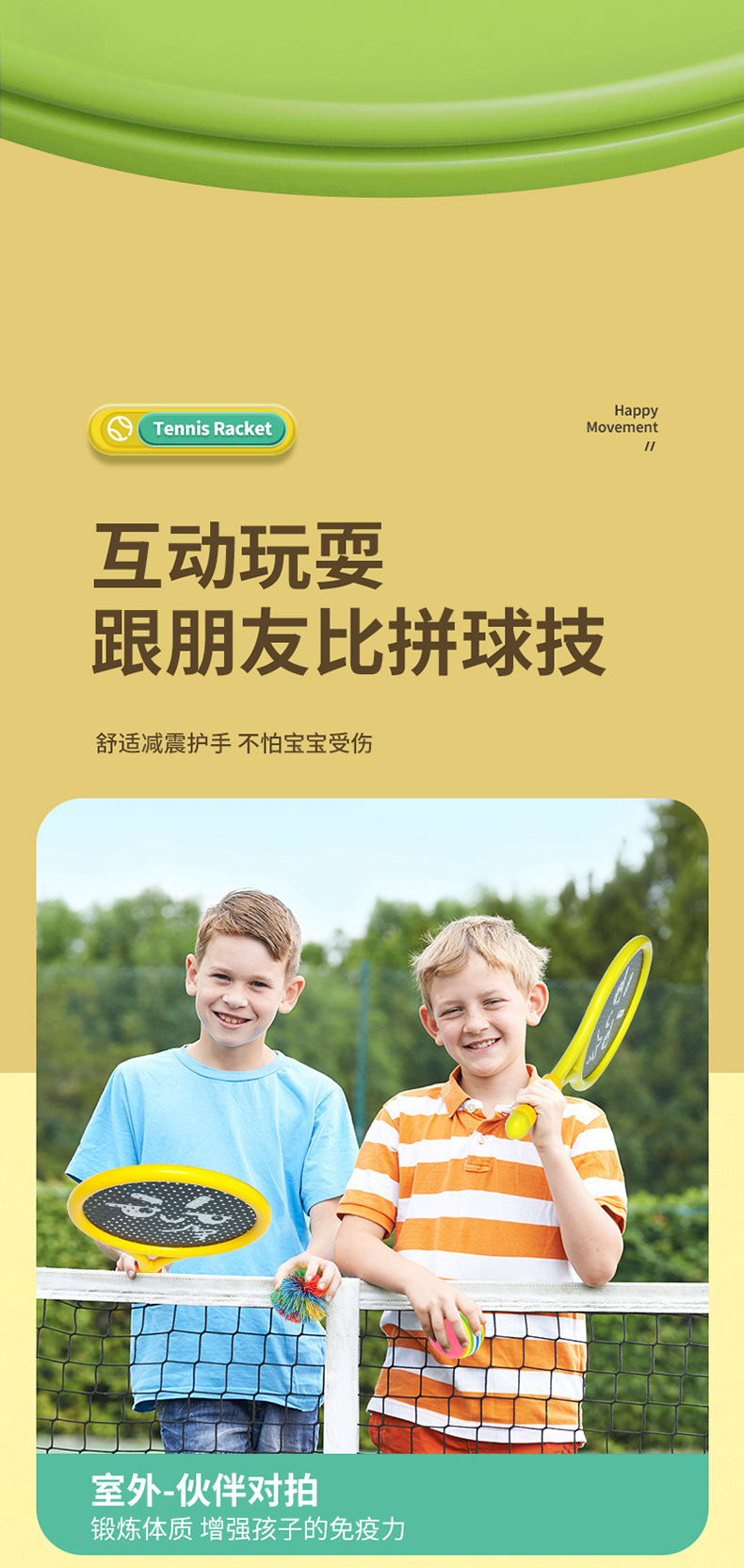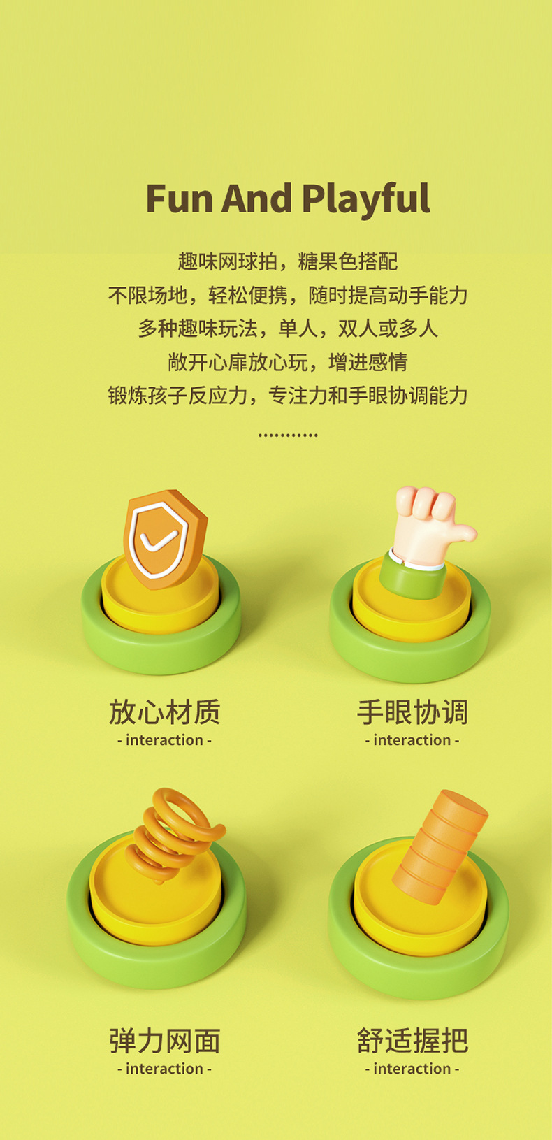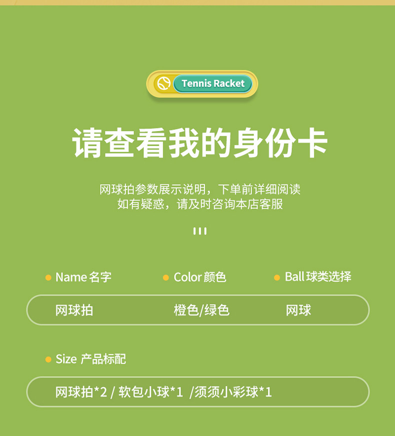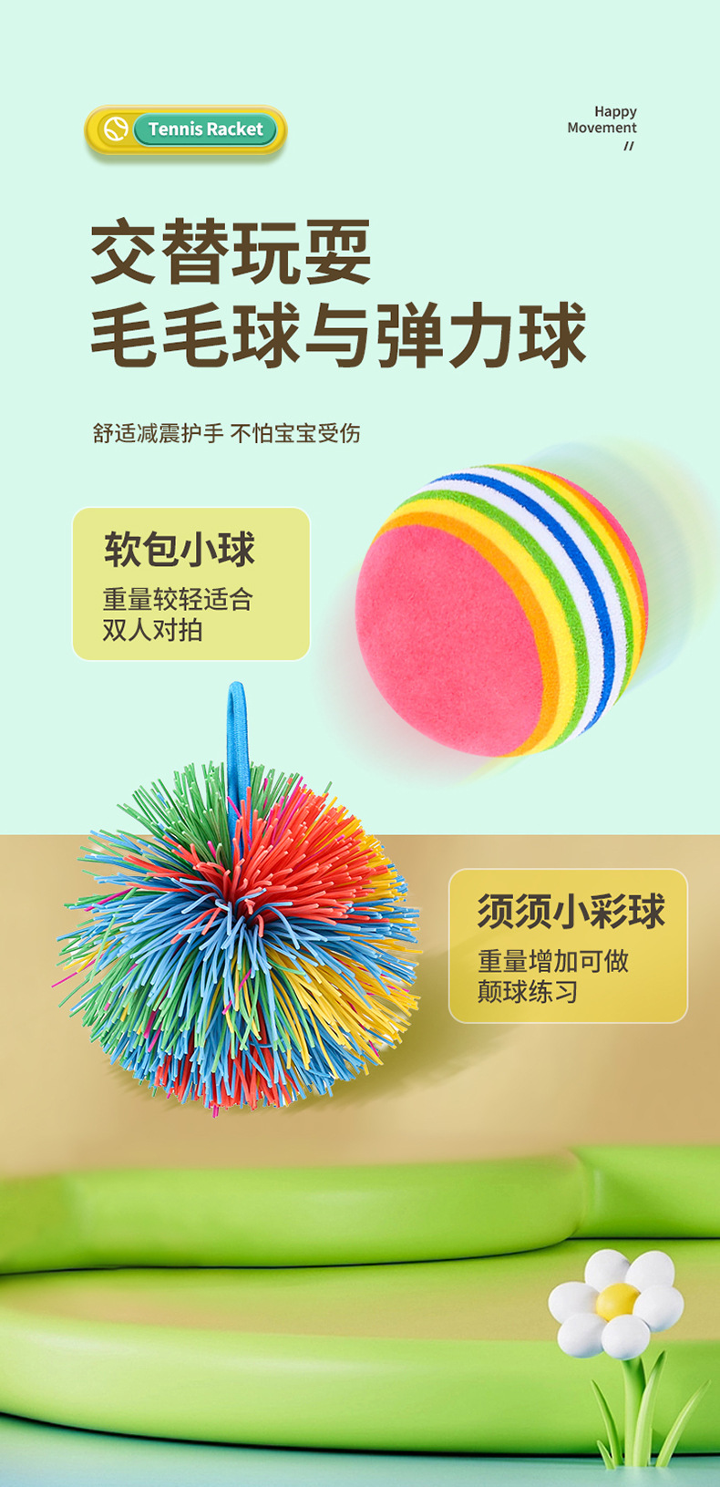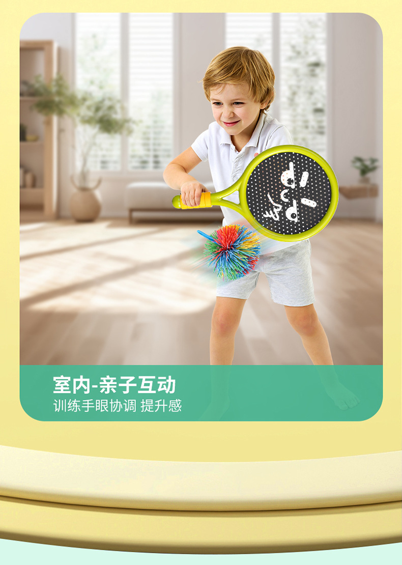 • 노란색과 녹색 미끄럼 방지 라켓(라켓 2개) + 무지개 공 1개 + 털 공 1개