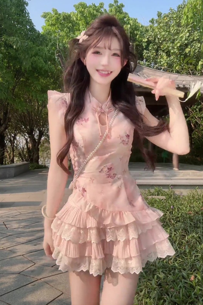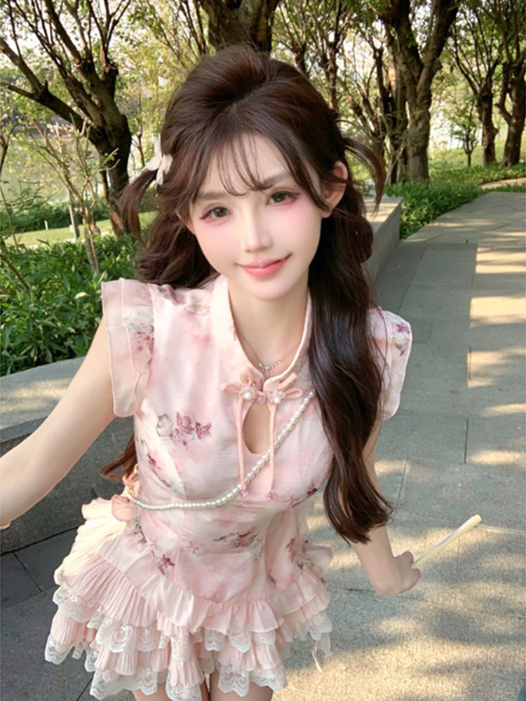 새로운 중국 스타일 복고풍 스타일 작은 플라잉 슬리브 중공 불규칙한 인쇄 탑 여성 여름 달콤한 케이크 스커트 투피스 양복 스커트스토어 가기