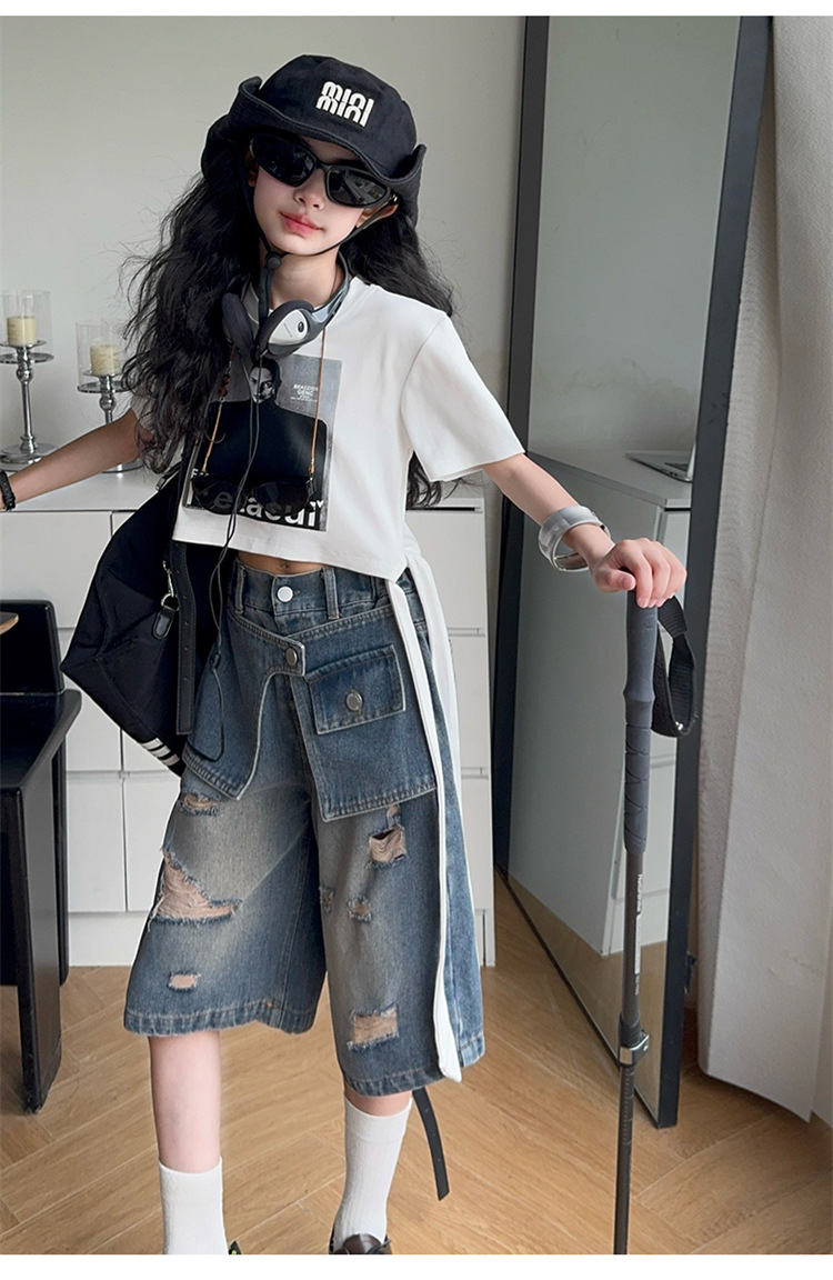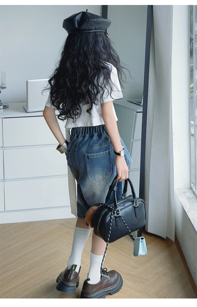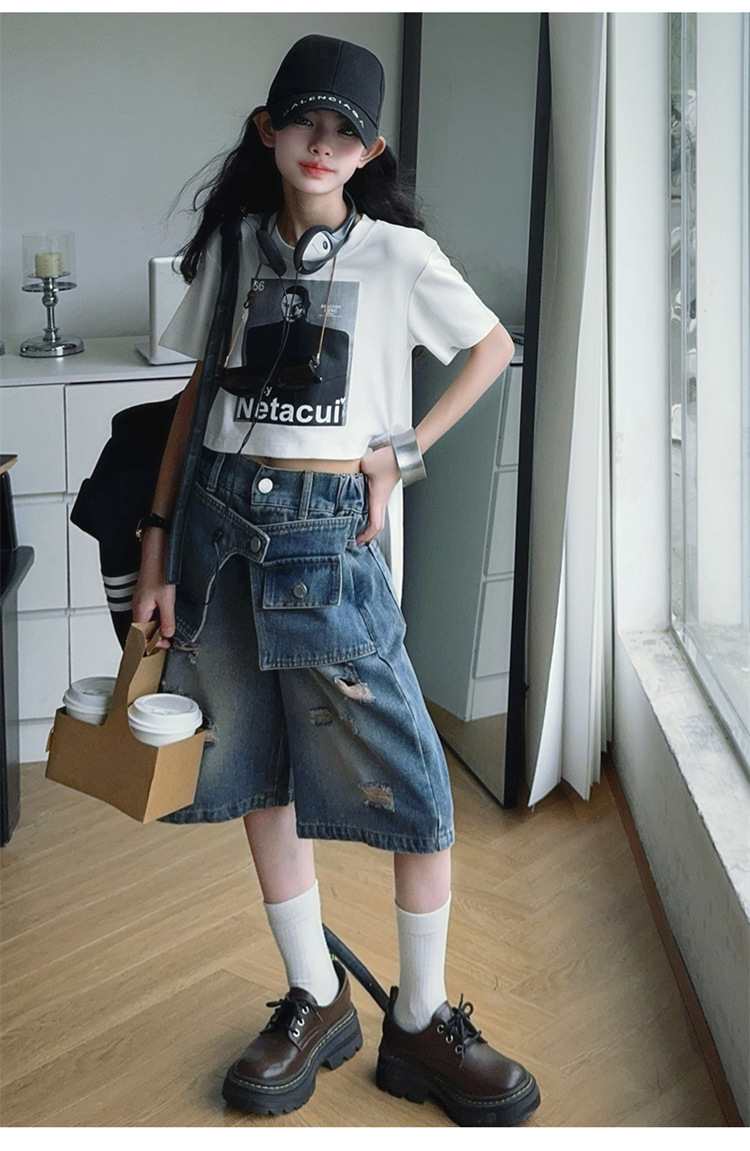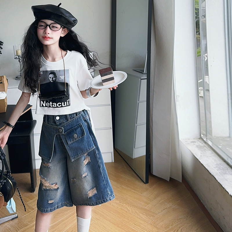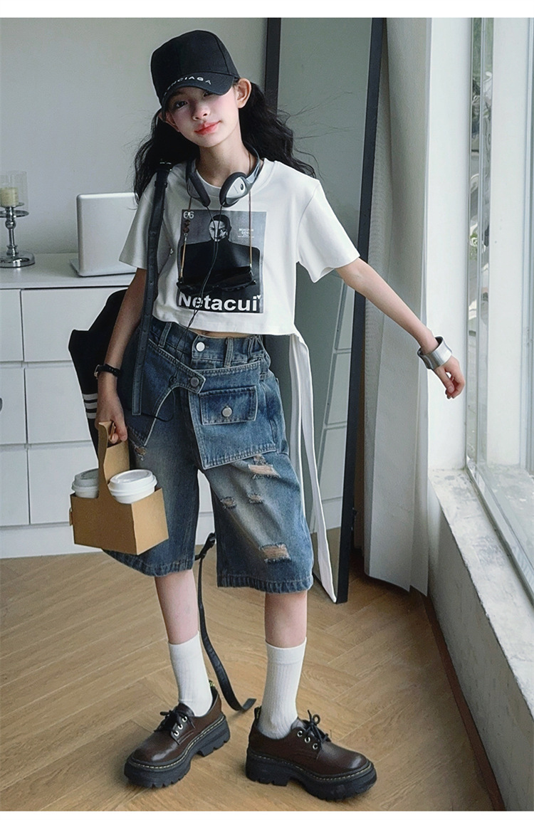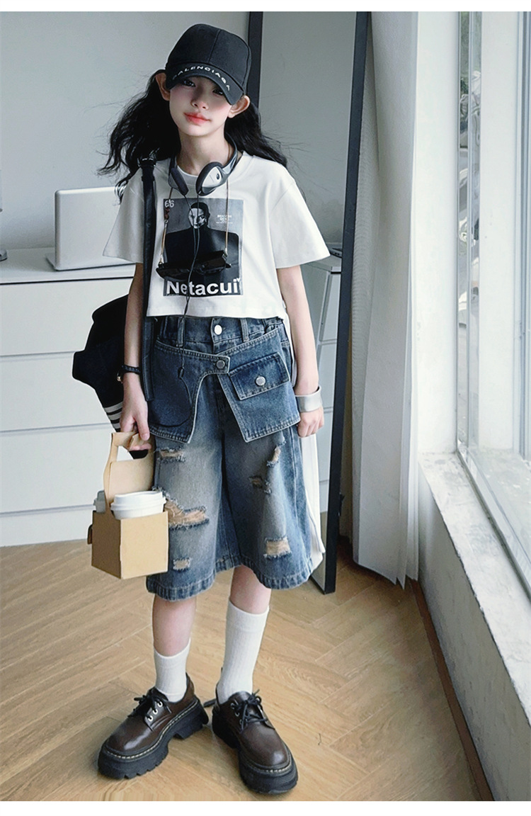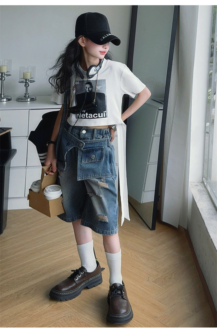 여자 티셔츠와 청바지 정장 2025 여름 신작 어린이 미국 반팔 t 패션 중간 바지 여름 투피스 세트스토어 가기