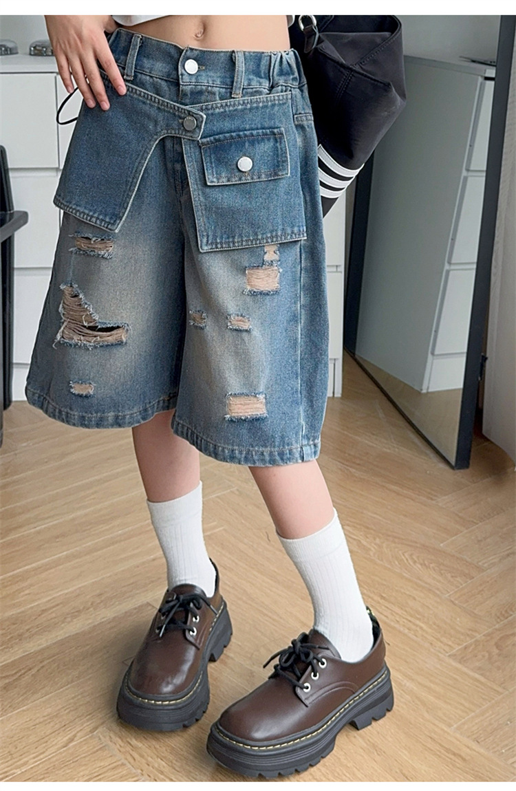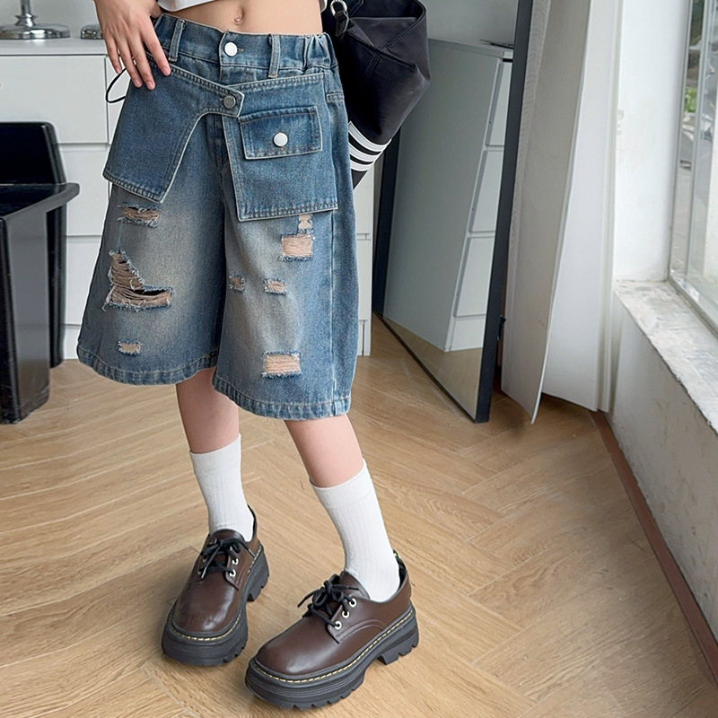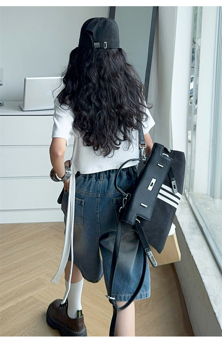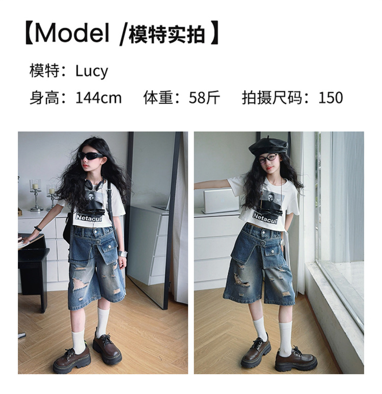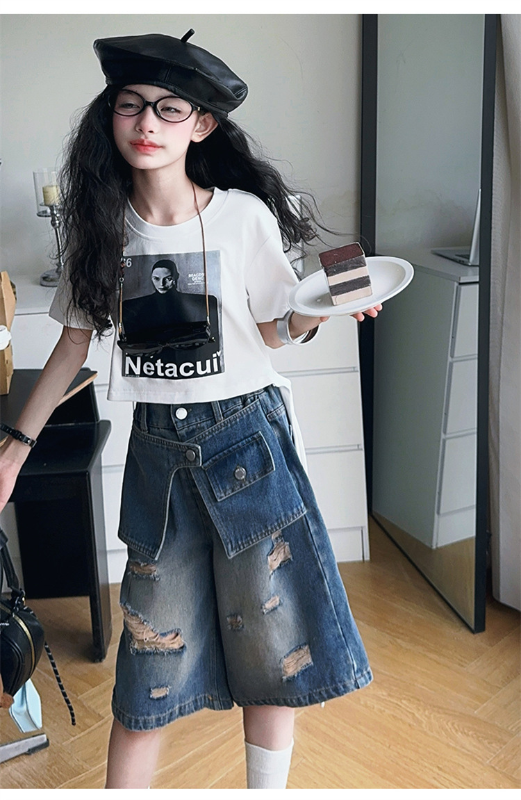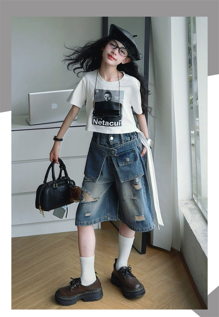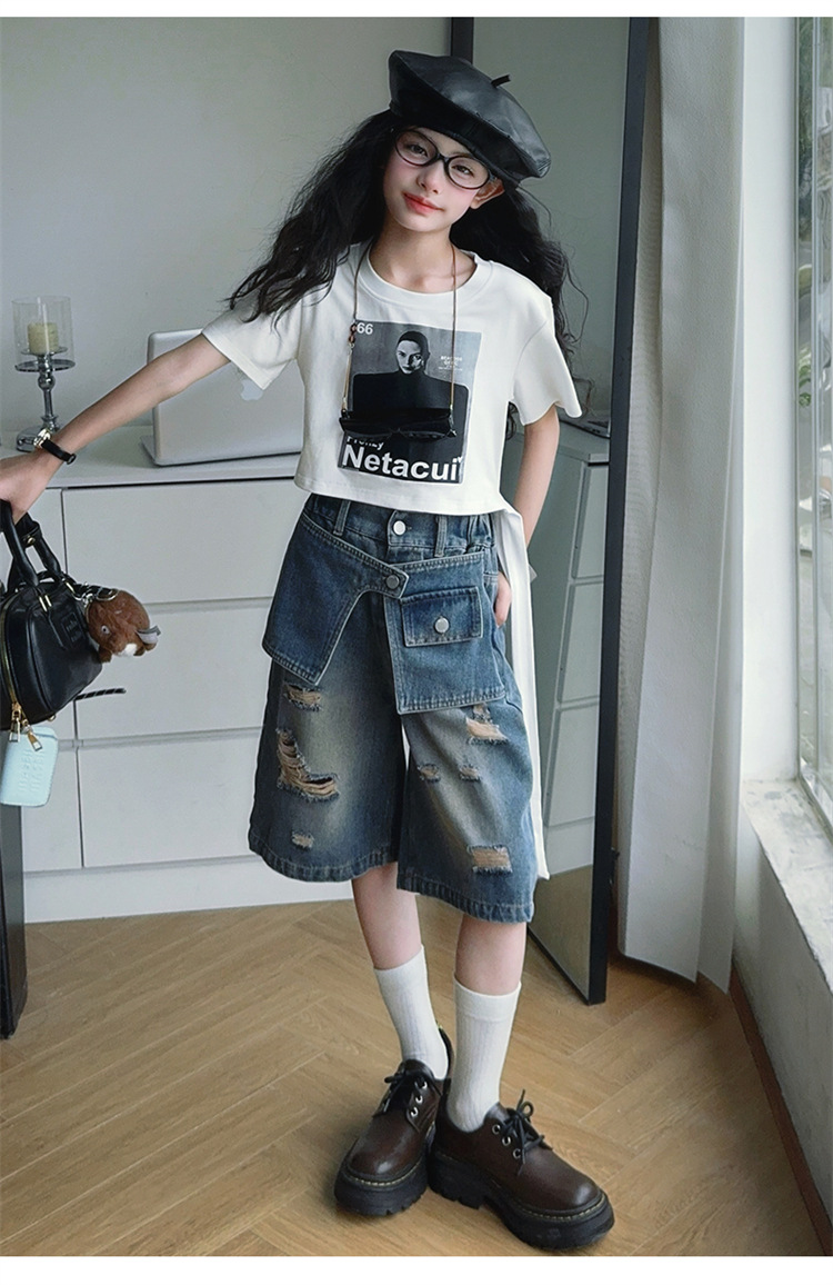 여자 티셔츠와 청바지 정장 2025 여름 신작 어린이 미국 반팔 t 패션 중간 바지 여름 투피스 세트스토어 가기