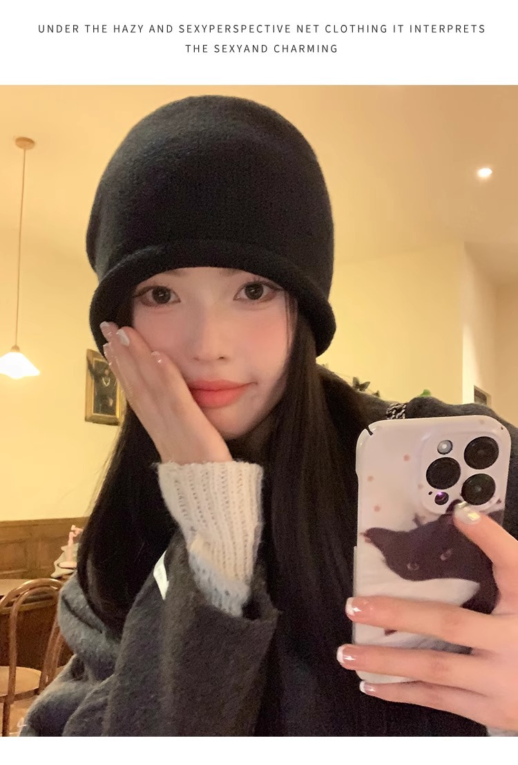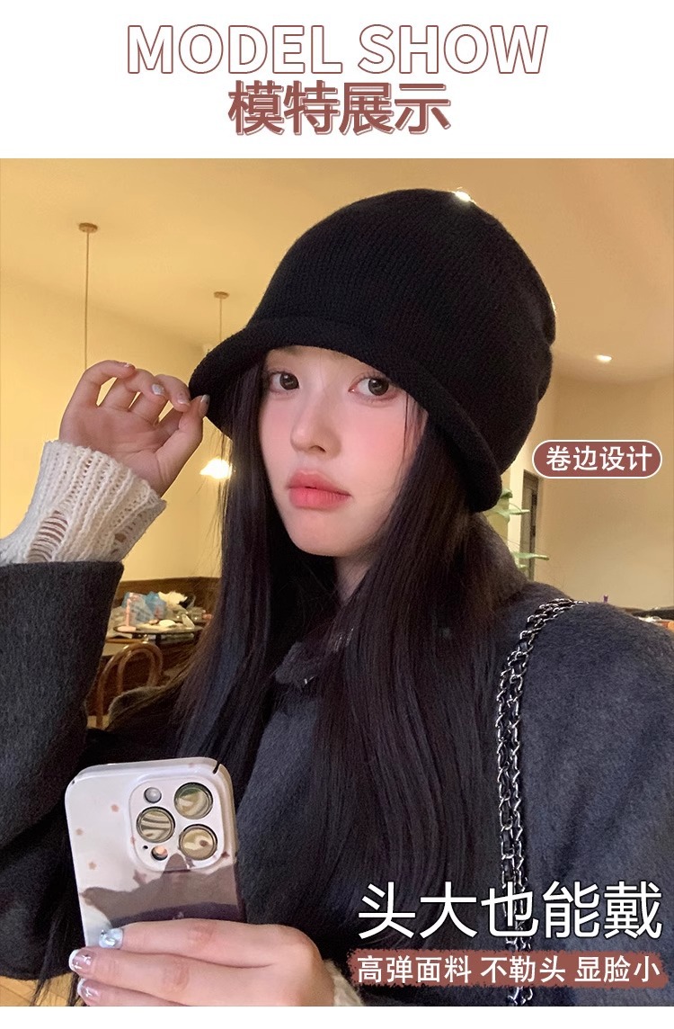 모자 여성 가을 겨울 모직 모자 큰 머리 둘레 작은 얼굴 보여주는 방한 모자 졸라매는 끈 푹신한 모자 롤업 니트 모자 캐주얼 모자