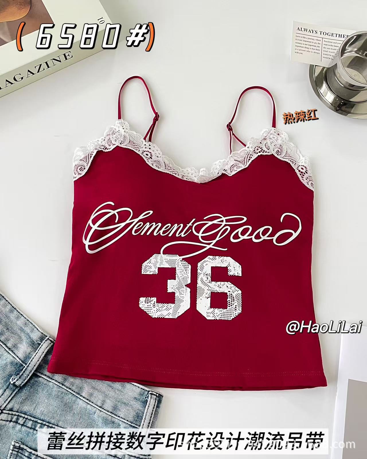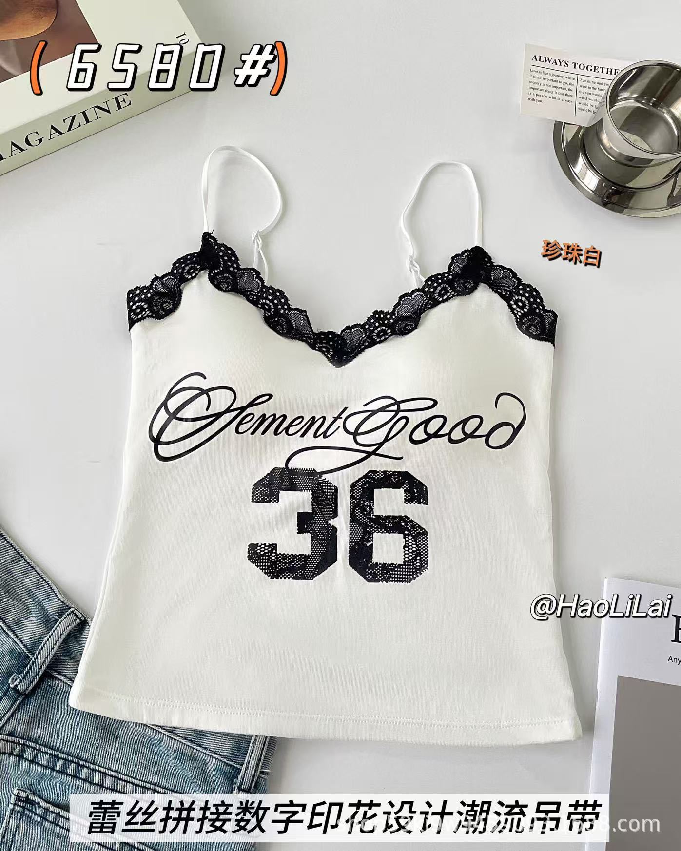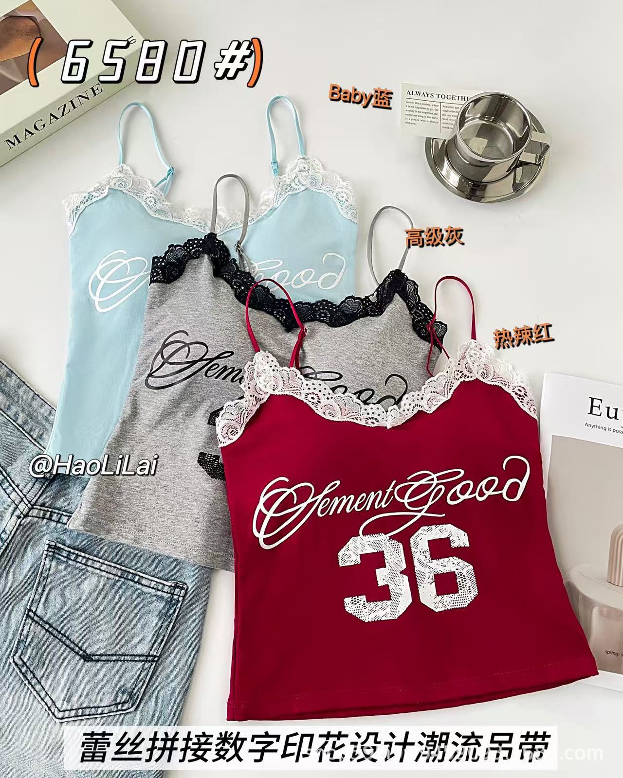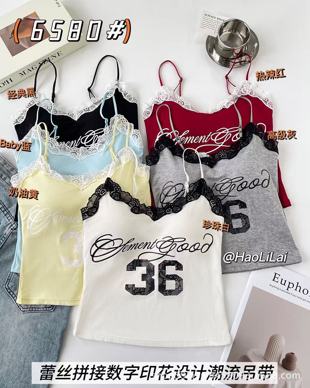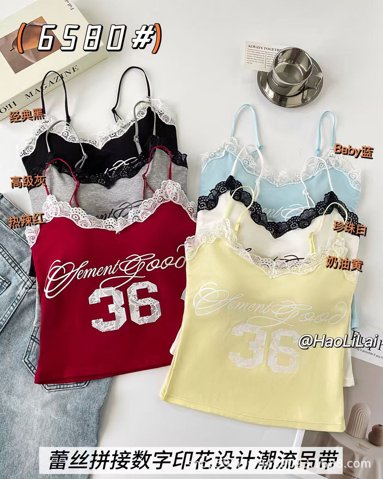6580 # 여름 신상 레이스 스플라이싱 디지털 프린트 스트리트 트렌드는 외부 및 내부 착용을 위한 가슴 패드가 내장된 작은 조끼입니다.스토어 가기