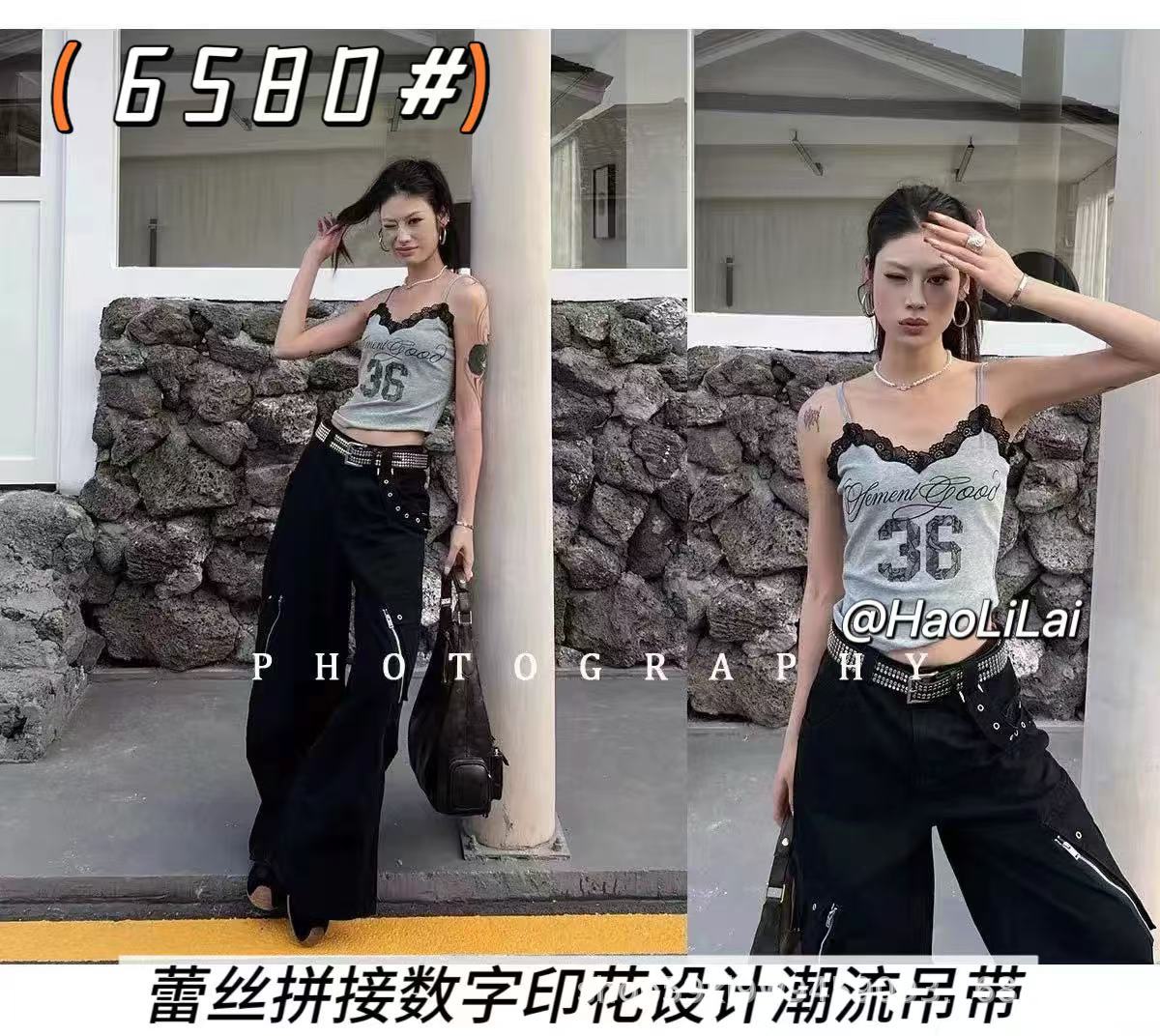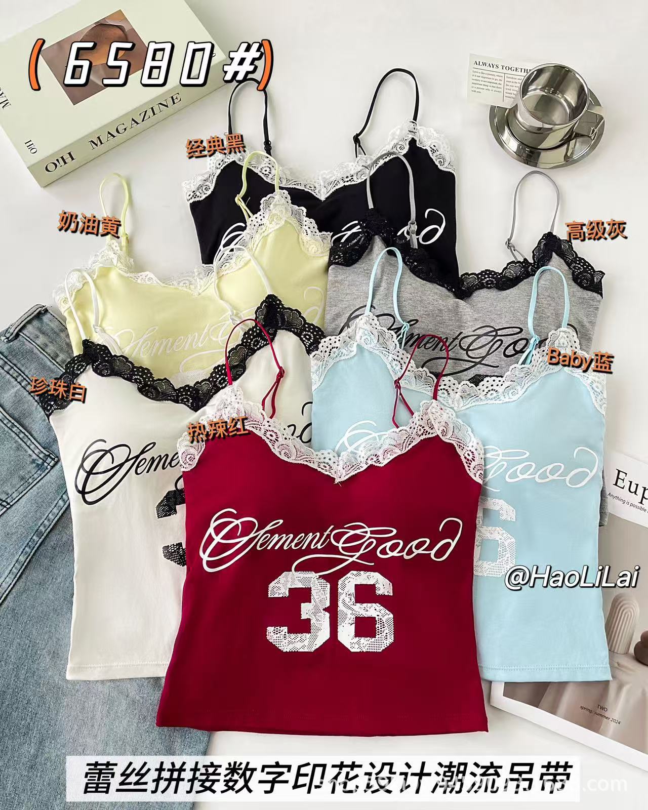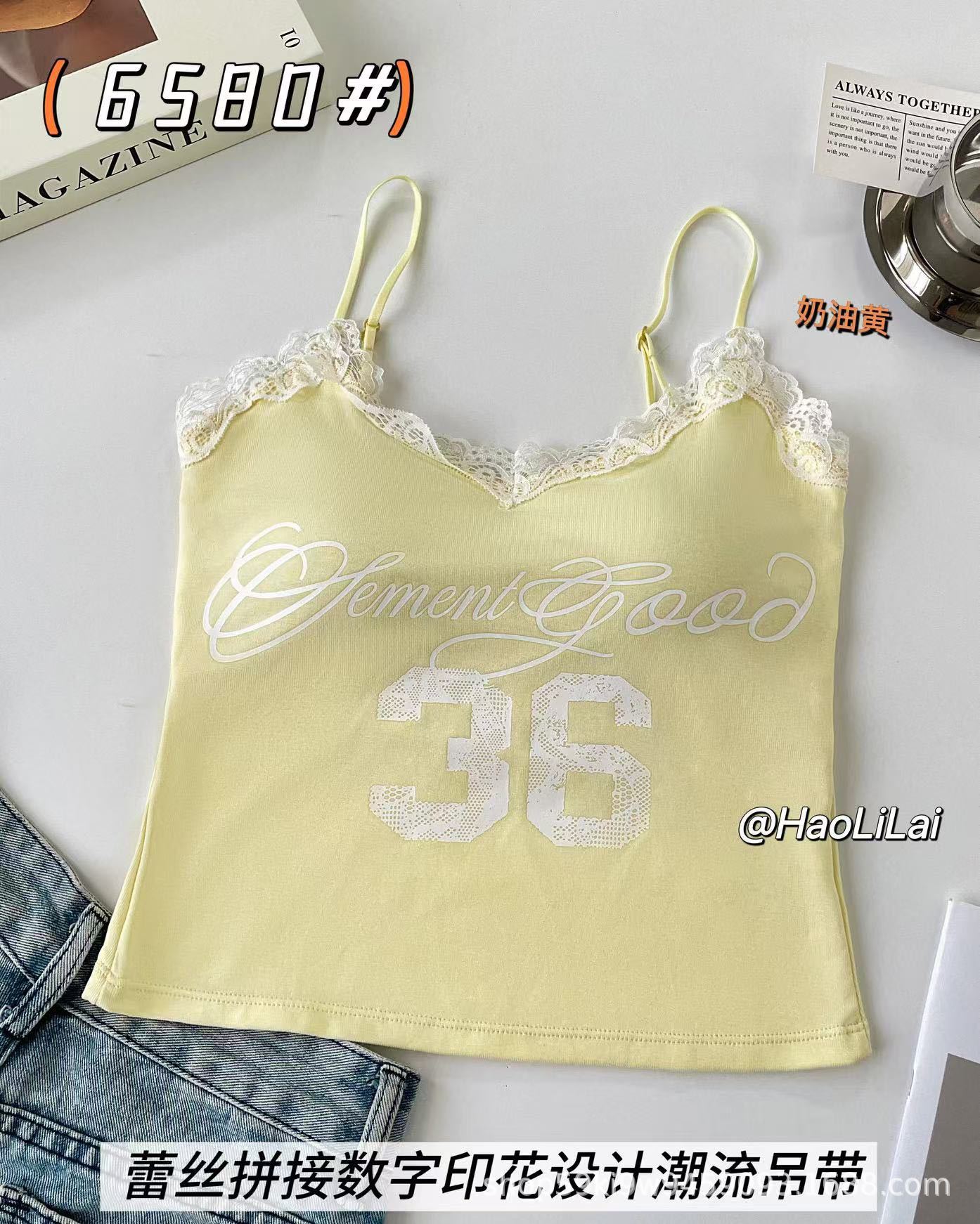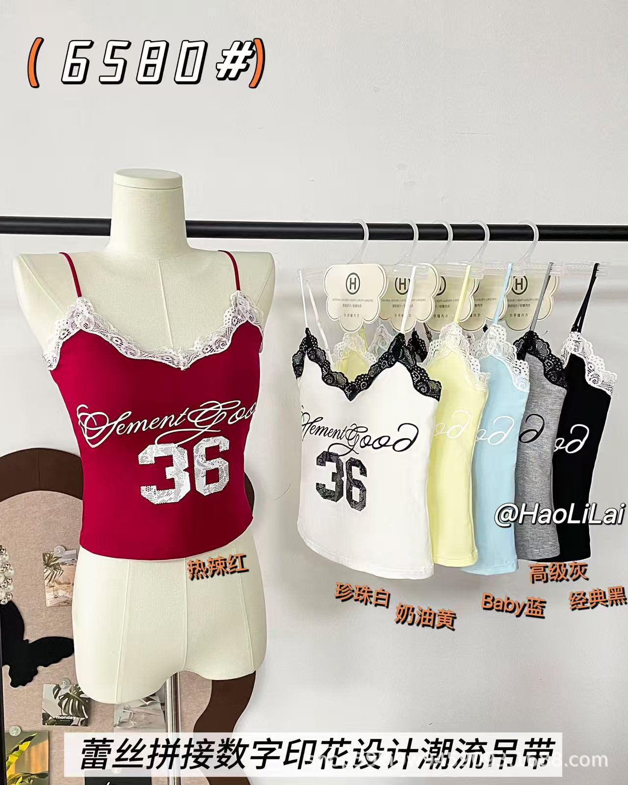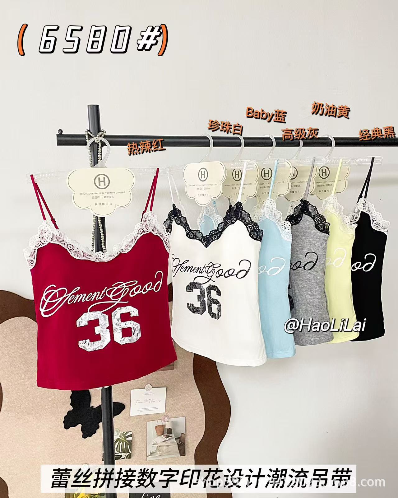 6580 # 여름 신상 레이스 스플라이싱 디지털 프린트 스트리트 트렌드는 외부 및 내부 착용을 위한 가슴 패드가 내장된 작은 조끼입니다.스토어 가기