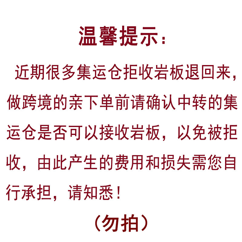 近期很多集运仓拒收岩板退回来,做跨境的亲下单前请确认中转的集运仓是否可以收货、以免被拒收,由此产生的费用和损失需您自行承担,请知悉!