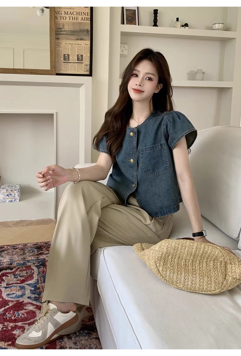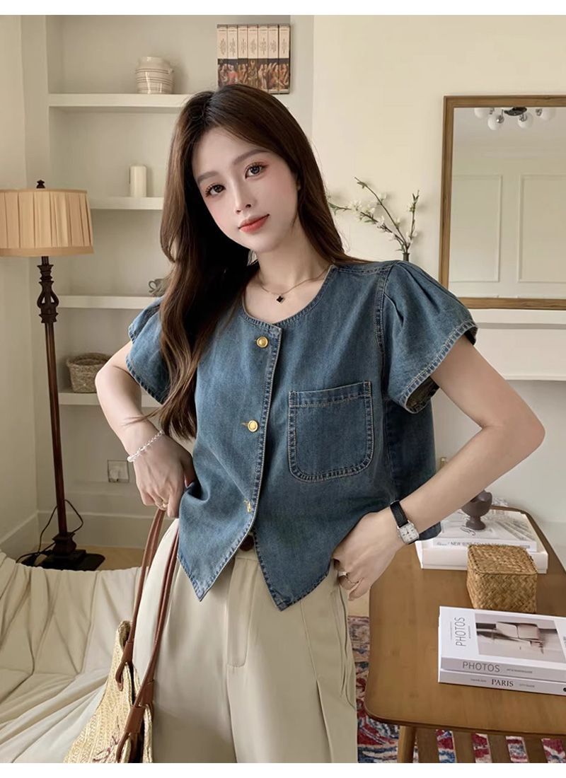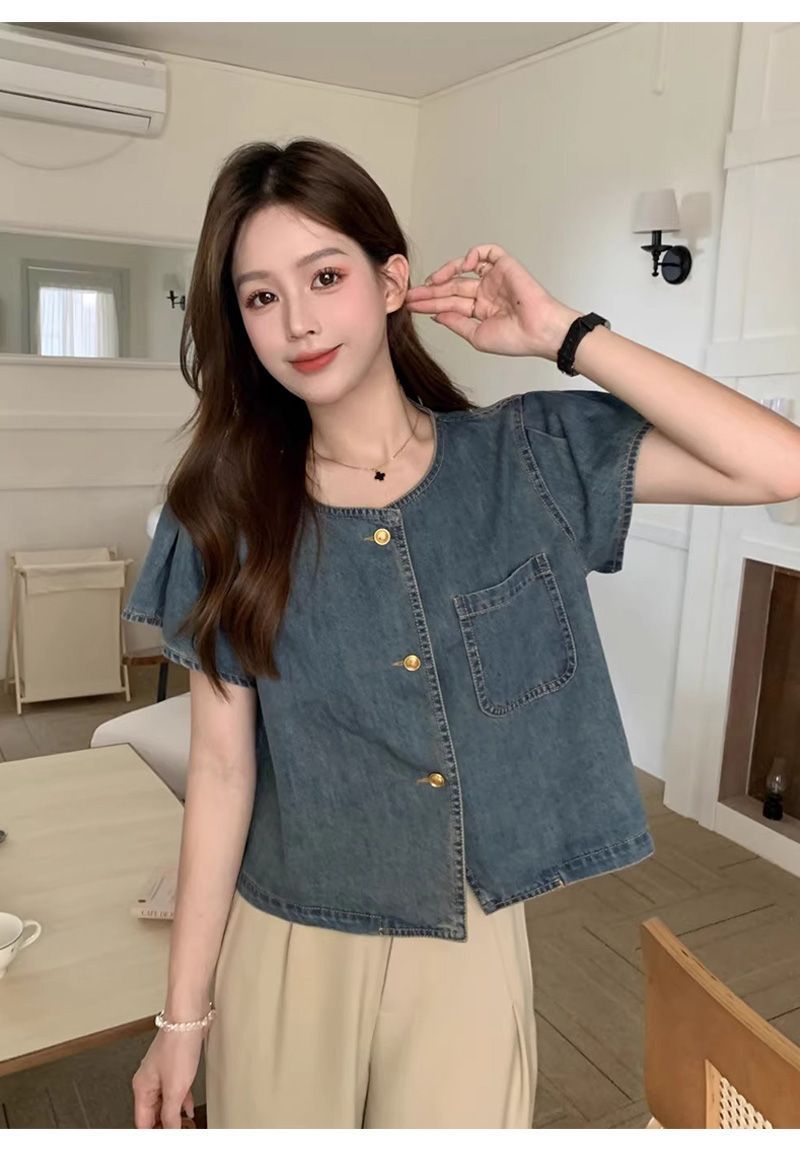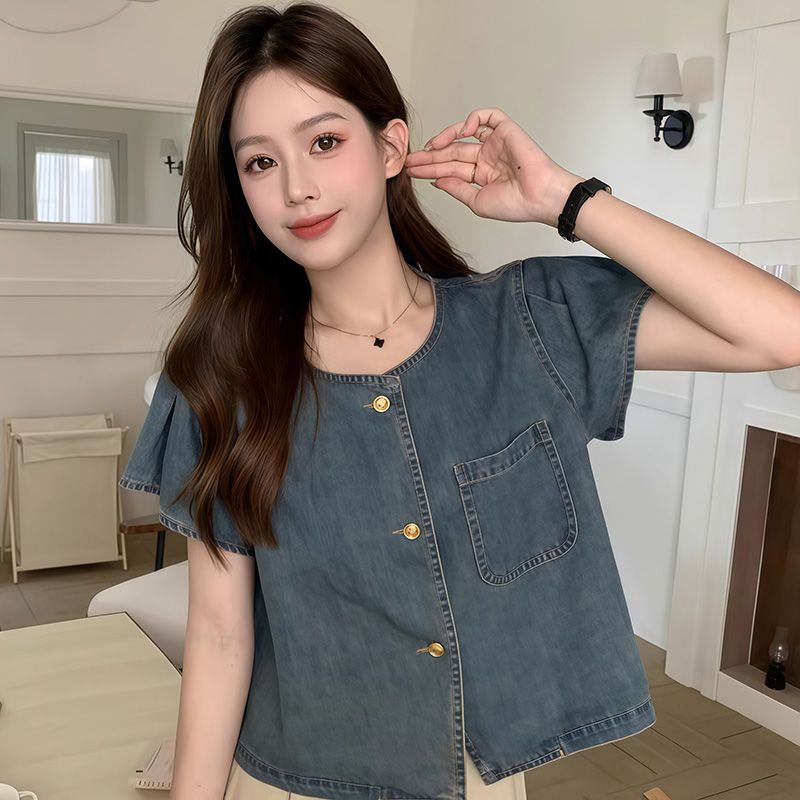 여성을위한 레트로 반팔 데님 셔츠 여름 2025 새로운 느슨한 라운드 넥 얇은 코트 틈새 짧은 탑스토어 가기