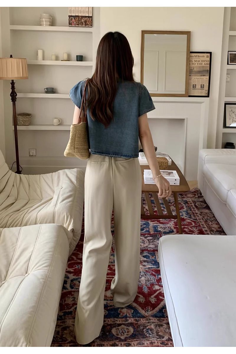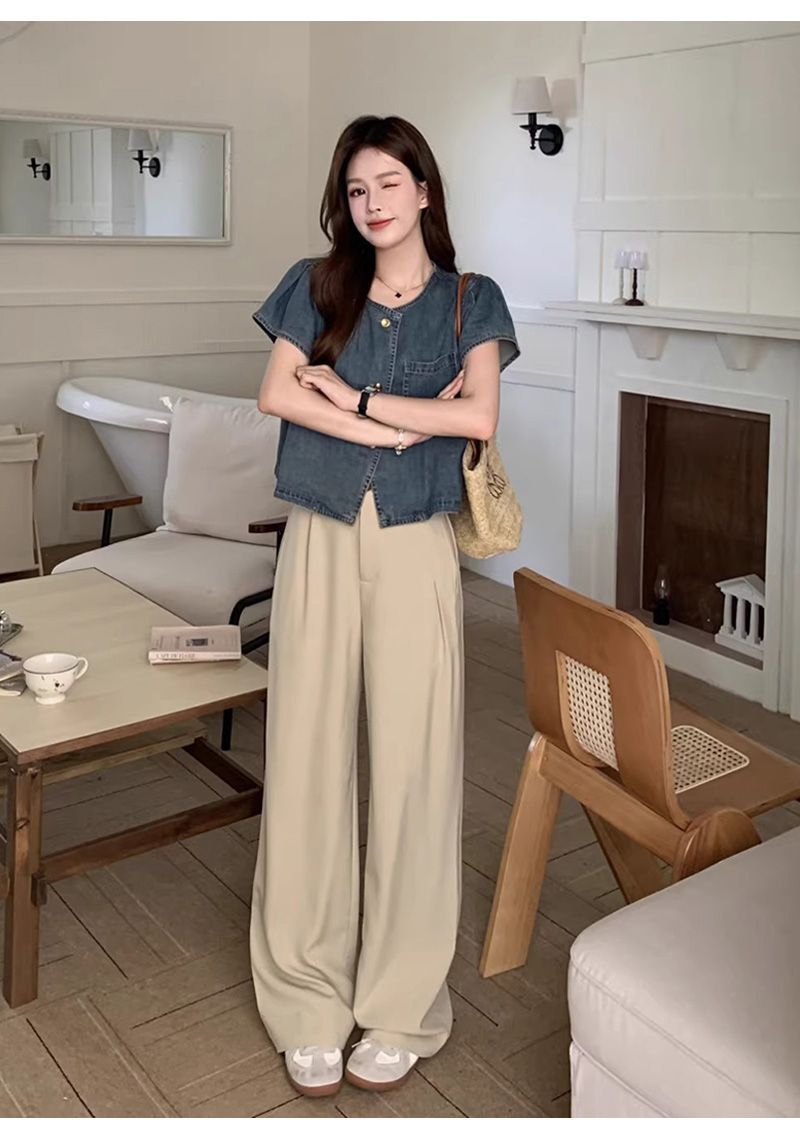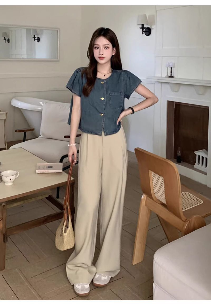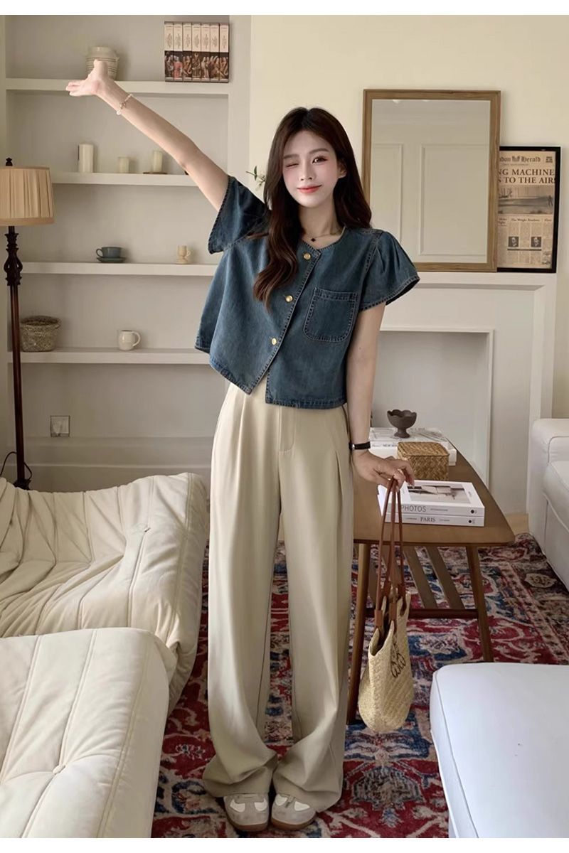 여성을위한 레트로 반팔 데님 셔츠 여름 2025 새로운 느슨한 라운드 넥 얇은 코트 틈새 짧은 탑스토어 가기