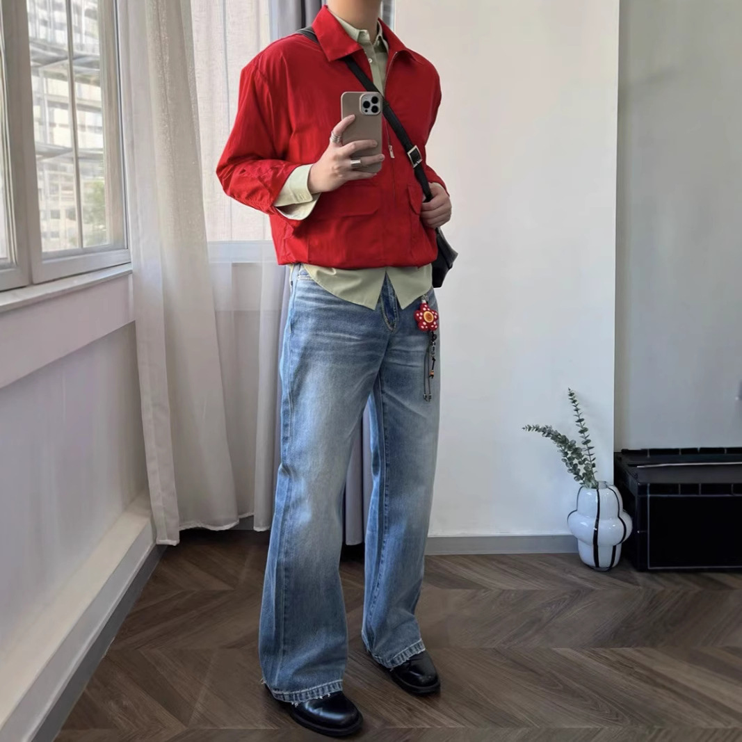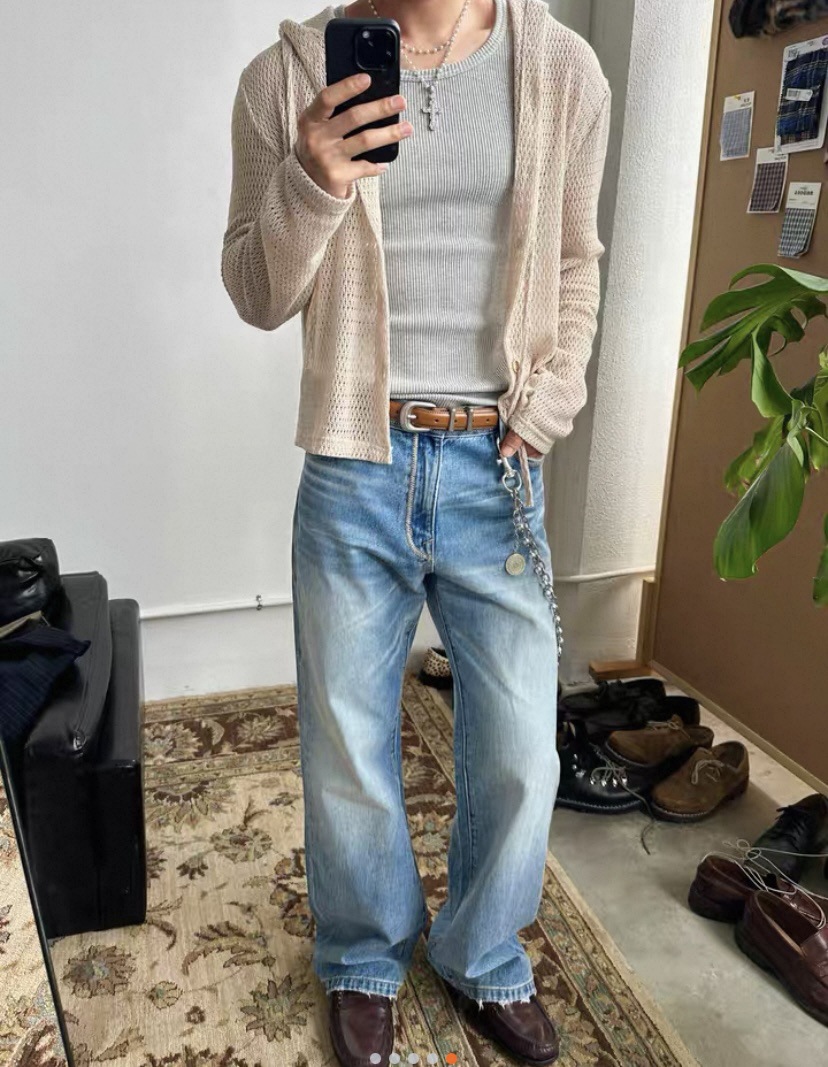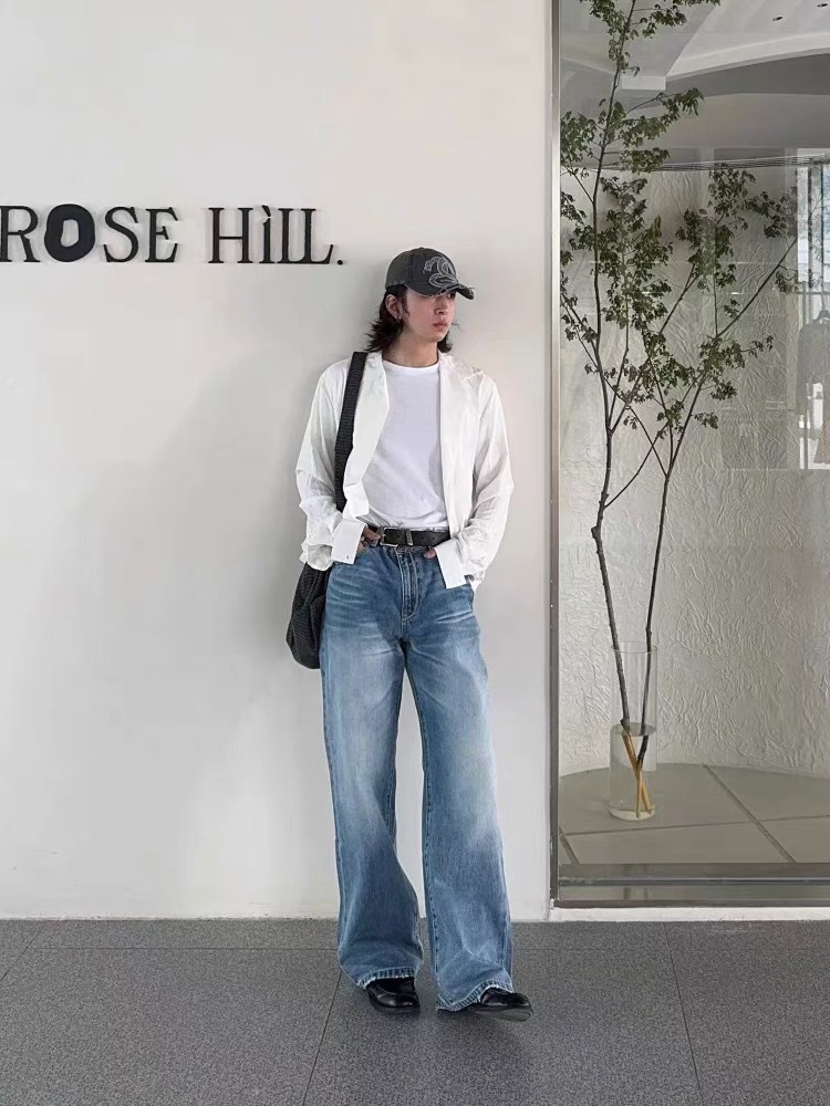 미국식 클린핏 연청 데님 스트레이트 루즈핏 워싱 내추럴 캣스터치 아이스 블루 핸드스티치 데님 팬츠스토어 가기