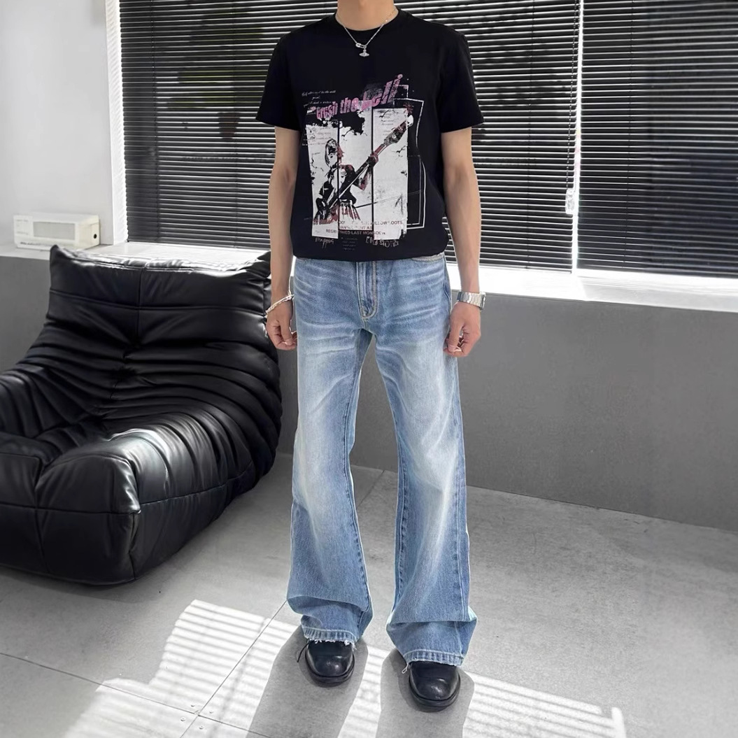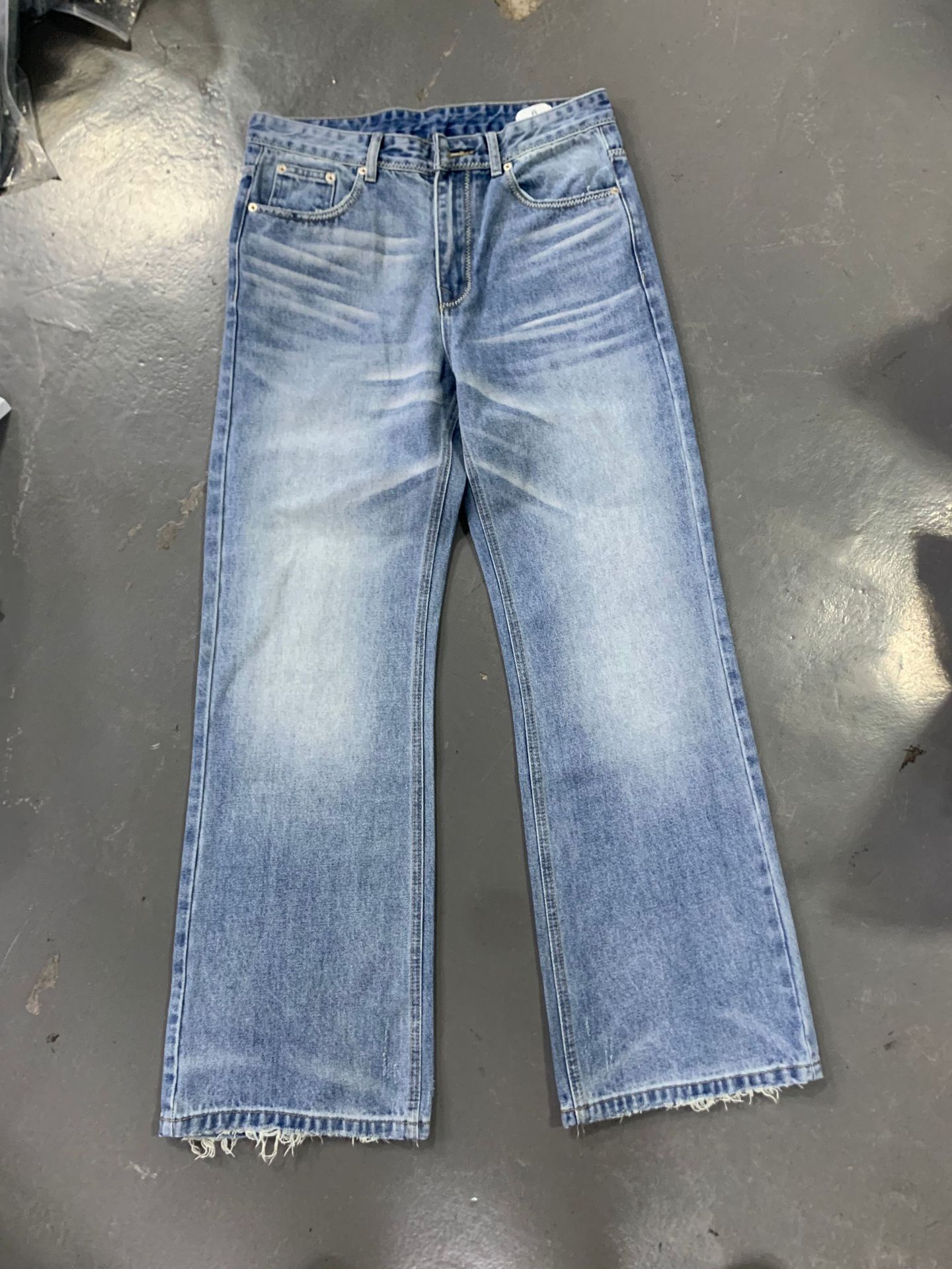 미국식 클린핏 연청 데님 스트레이트 루즈핏 워싱 내추럴 캣스터치 아이스 블루 핸드스티치 데님 팬츠