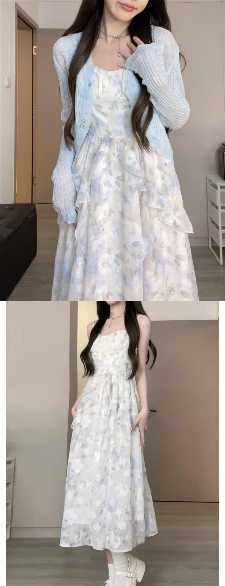 여성을위한 달콤한 스타일 프릴 쉬폰 꽃 스커트 정장 여름 얇은 태양 보호 카디건 달콤한 허리 서스펜더 드레스스토어 가기