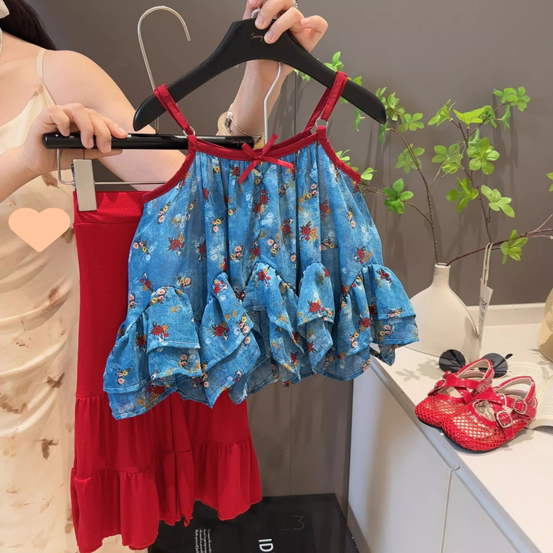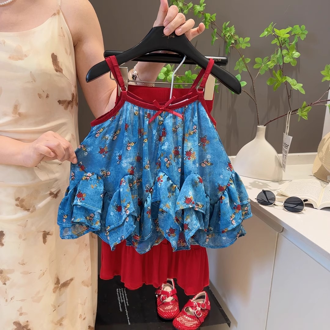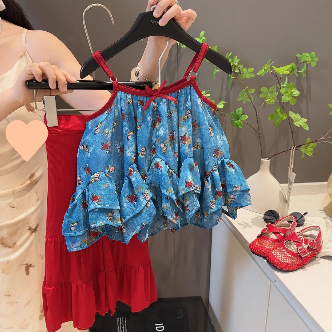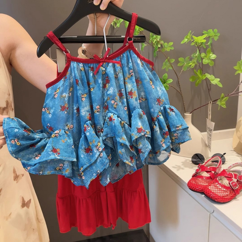 여자 여름 휴가 스타일 서스펜더 슈트 2025 새로운 어린이 베이비 쉬폰 프릴 탑 마이크로 플레어 바지 한국어스토어 가기
