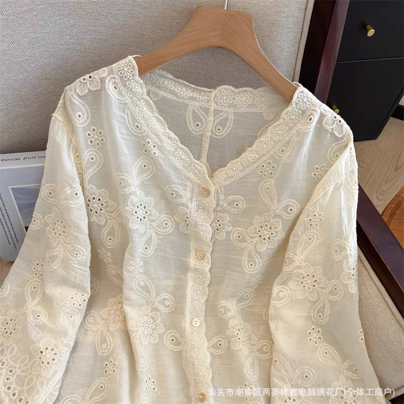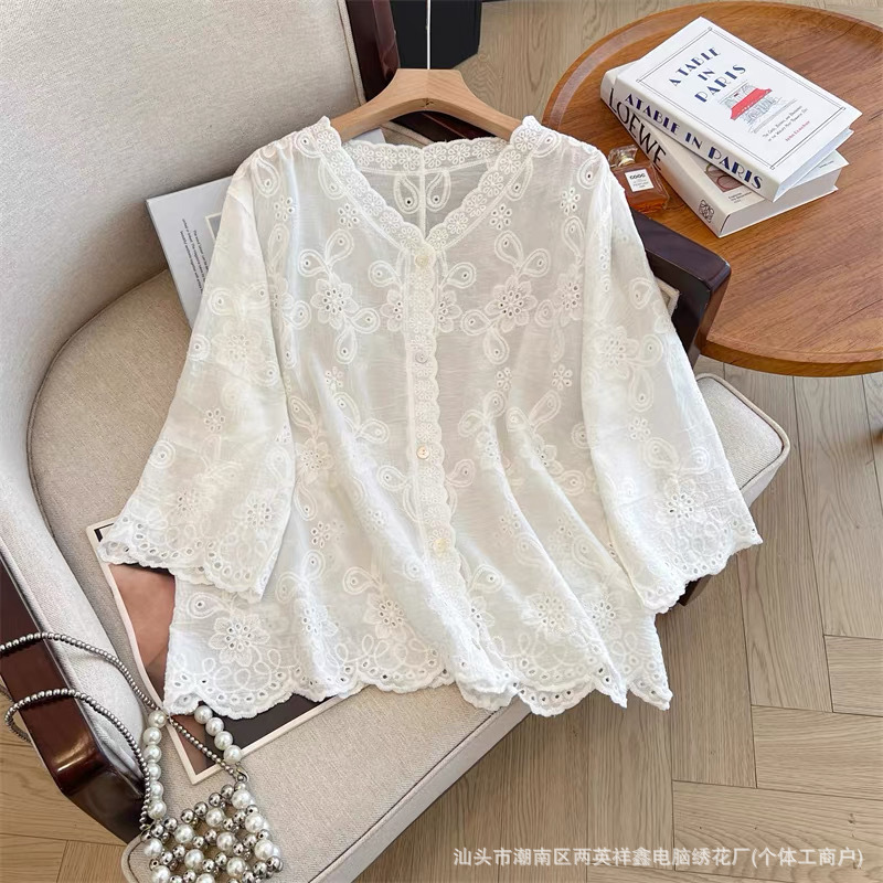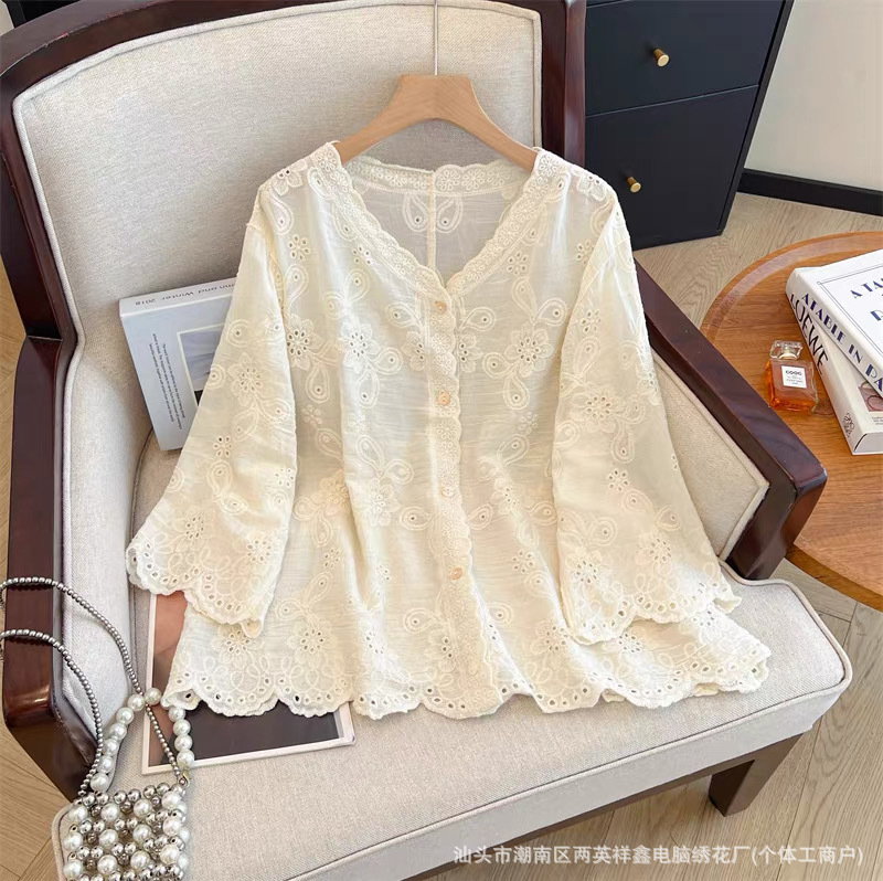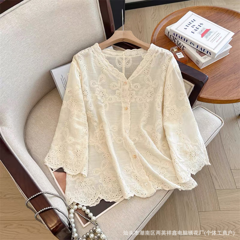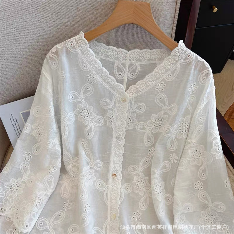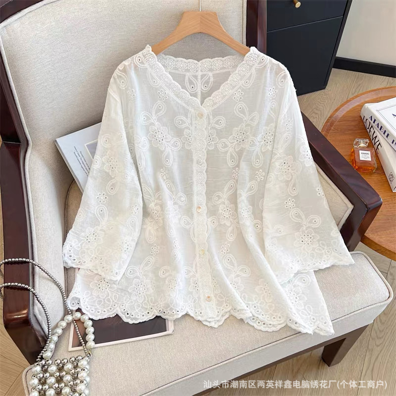 여성용 레이스 니트 자수 V 넥 코튼 린넨 셔츠 재킷 여름 대형 느슨한 경량 통기성 태양 보호 카디건스토어 가기