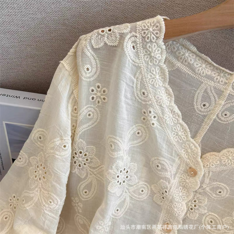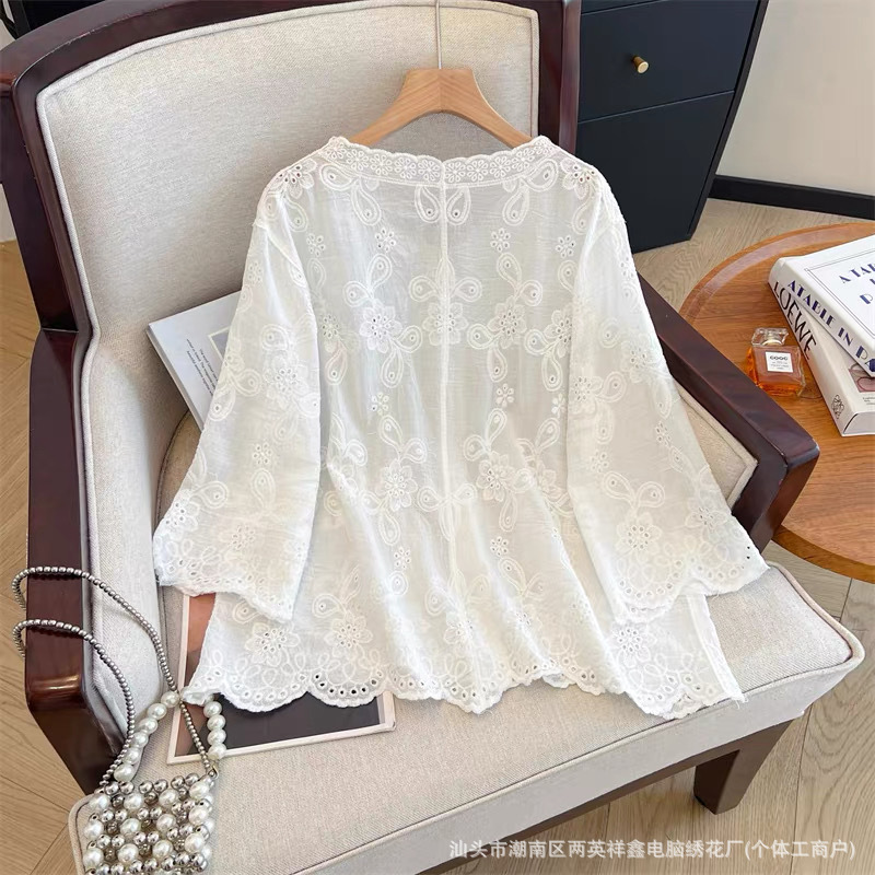 여성용 레이스 니트 자수 V 넥 코튼 린넨 셔츠 재킷 여름 대형 느슨한 경량 통기성 태양 보호 카디건