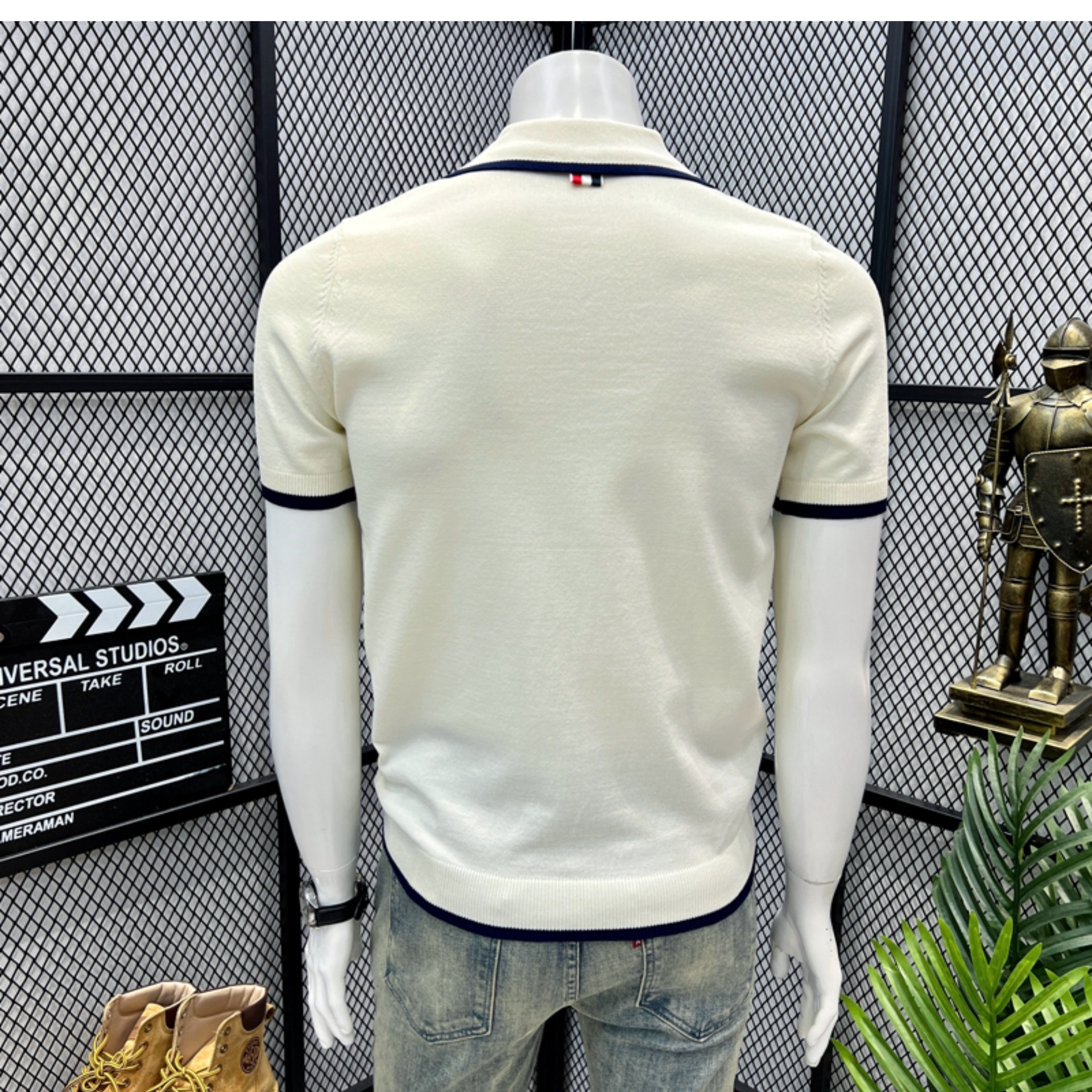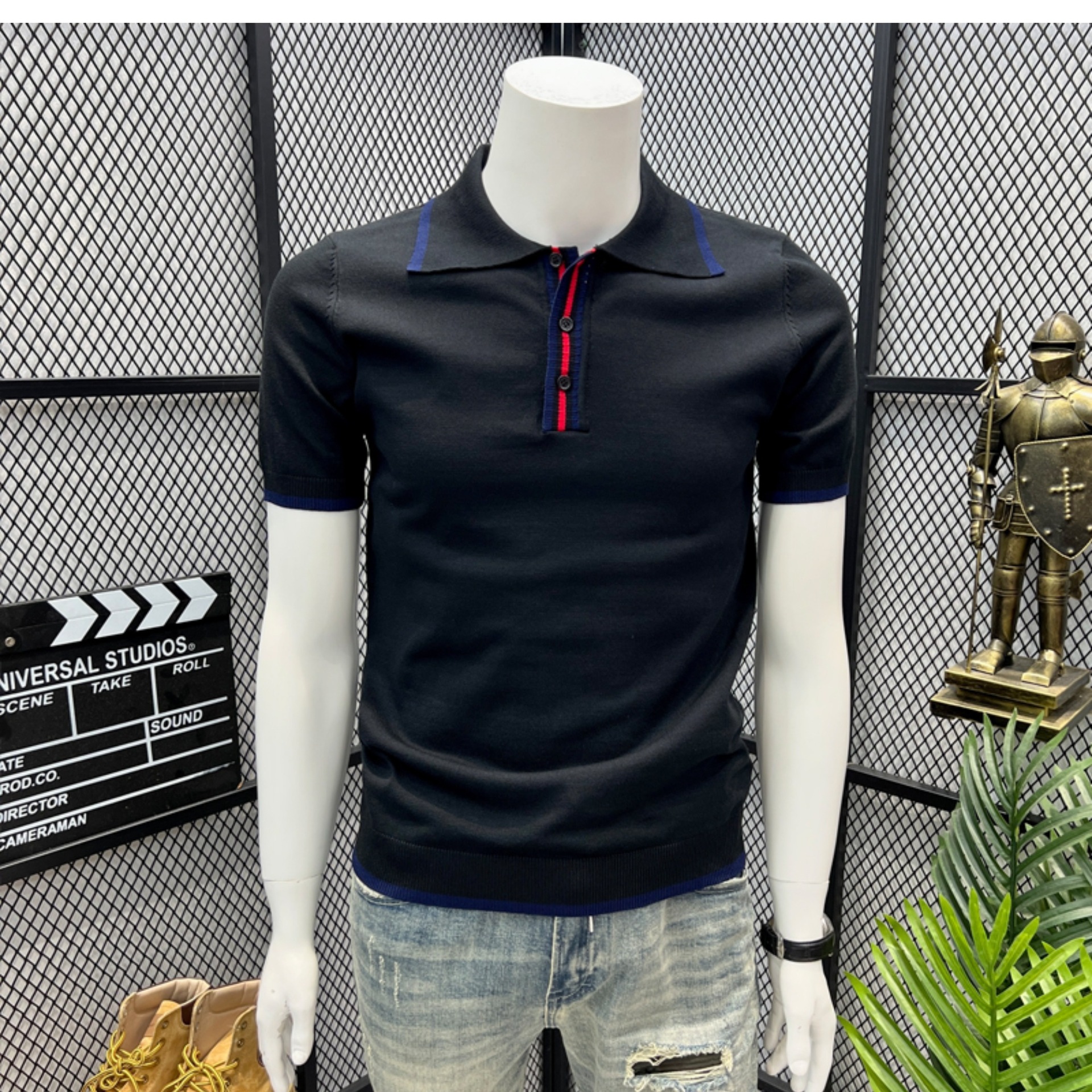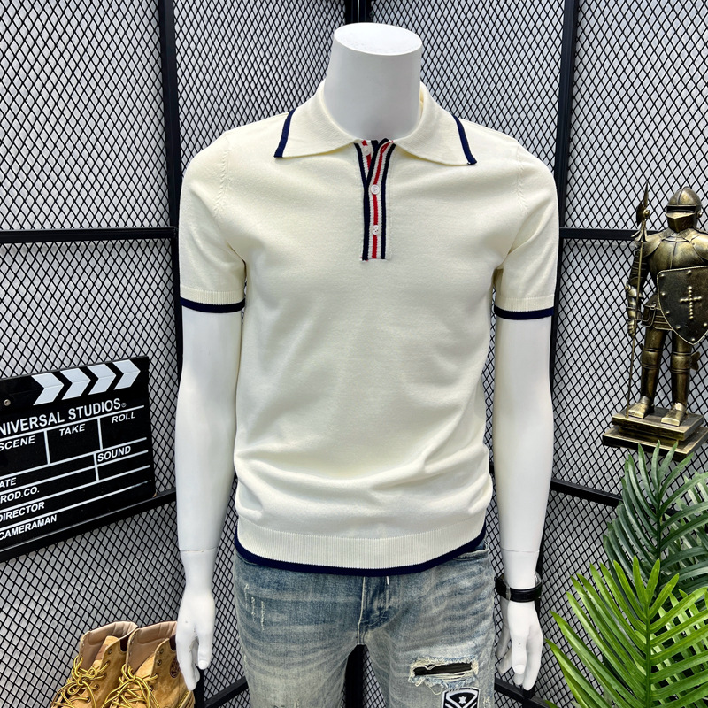 가벼운 럭셔리 스타일 대비 색상 라펠 스웨터 반팔 폴 셔츠 남성용 니트 패치워크 탑 통기성 폴로 셔츠스토어 가기