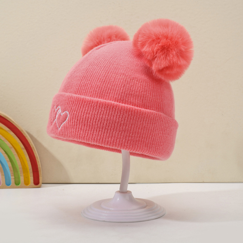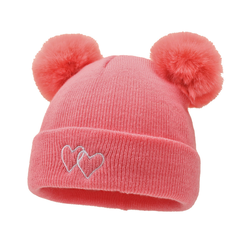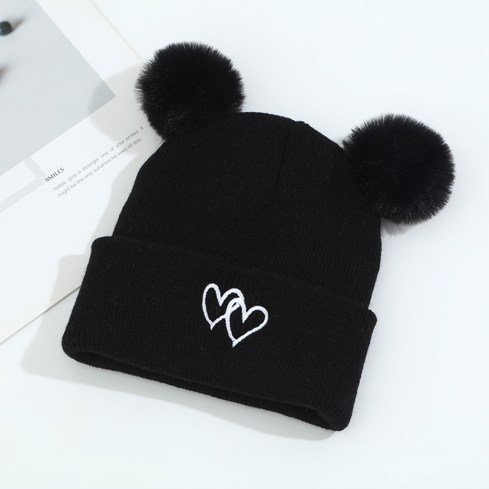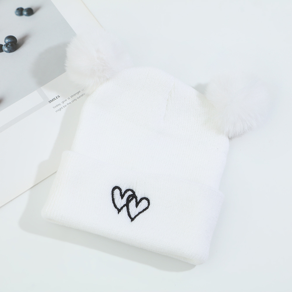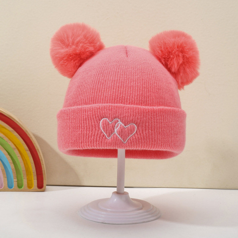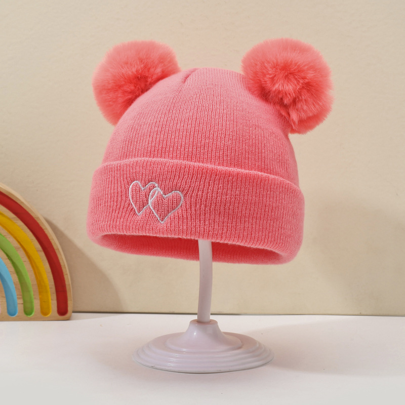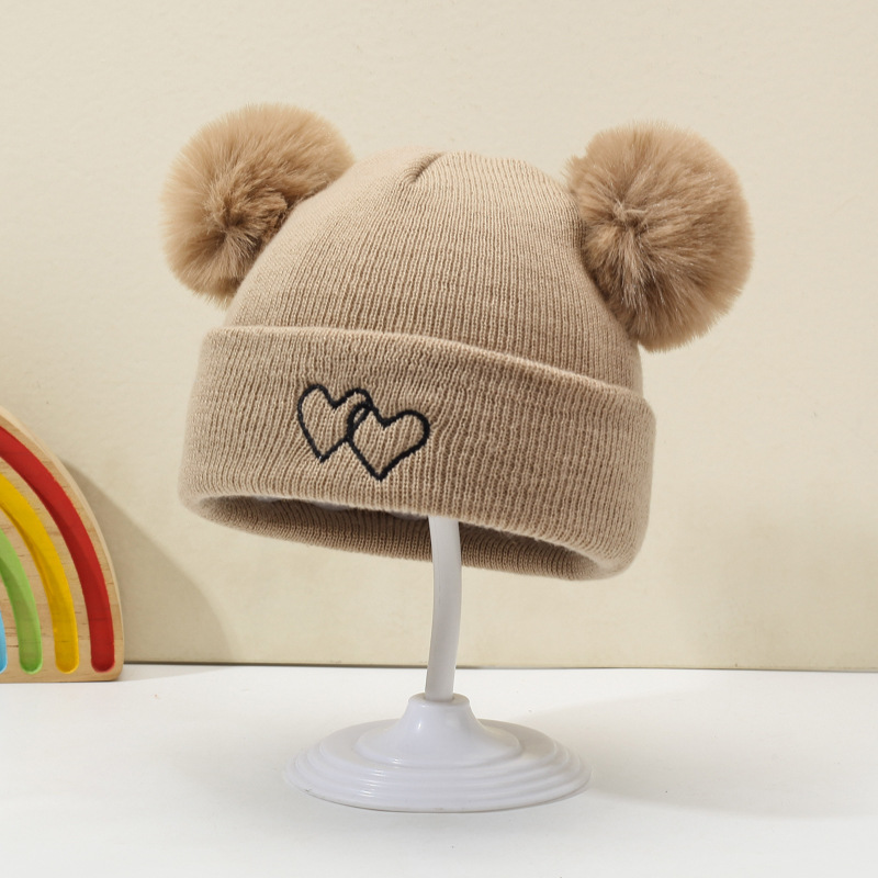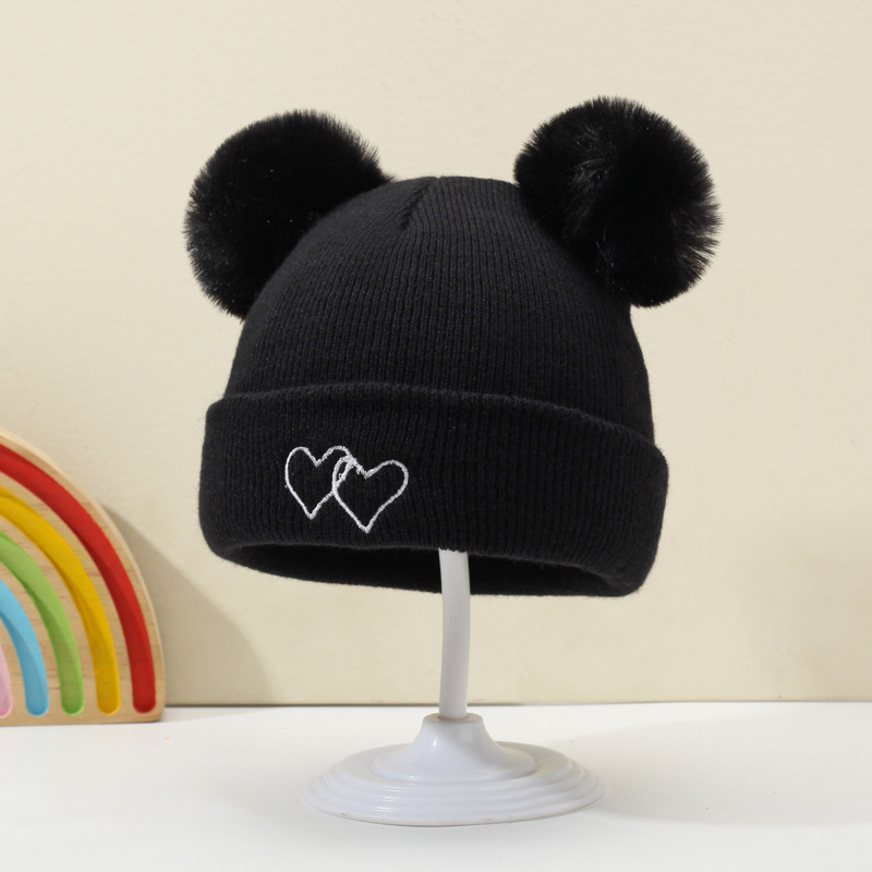 귀여운 아기 니트 모자, 더블 러브 자수, 더블 폼폼 모직 모자, 아기의 편안하고 피부 친화적인 따뜻하고 추운 모자스토어 가기