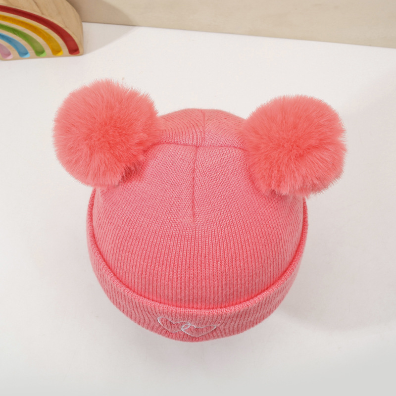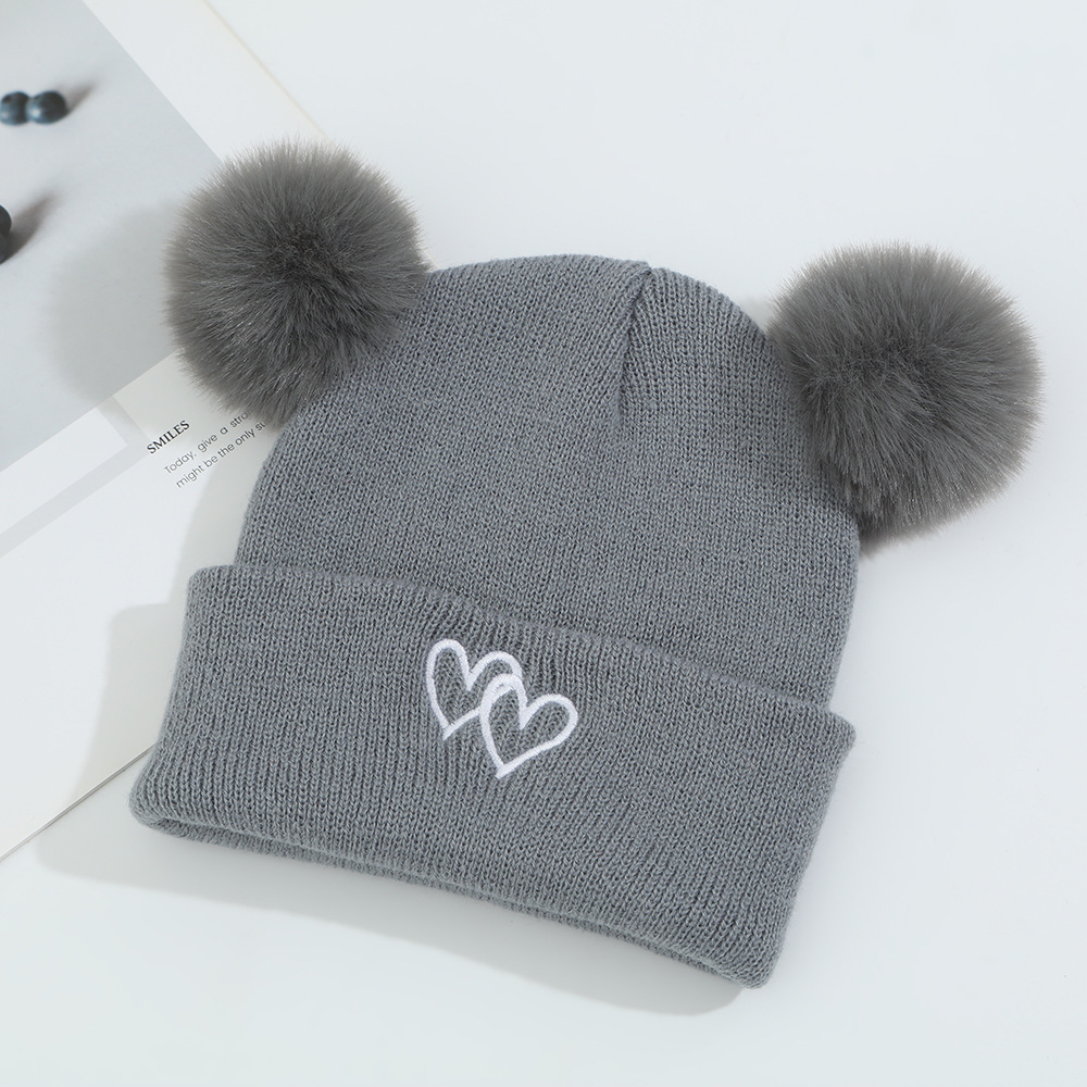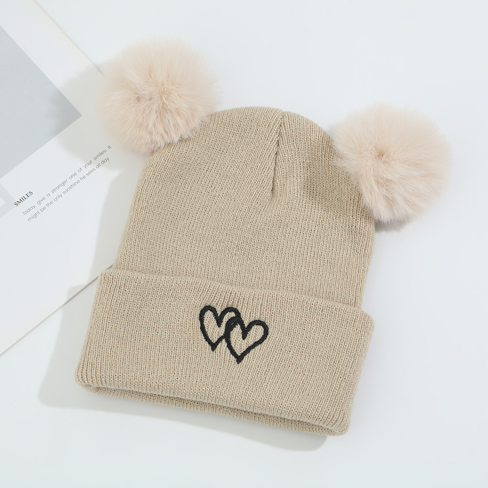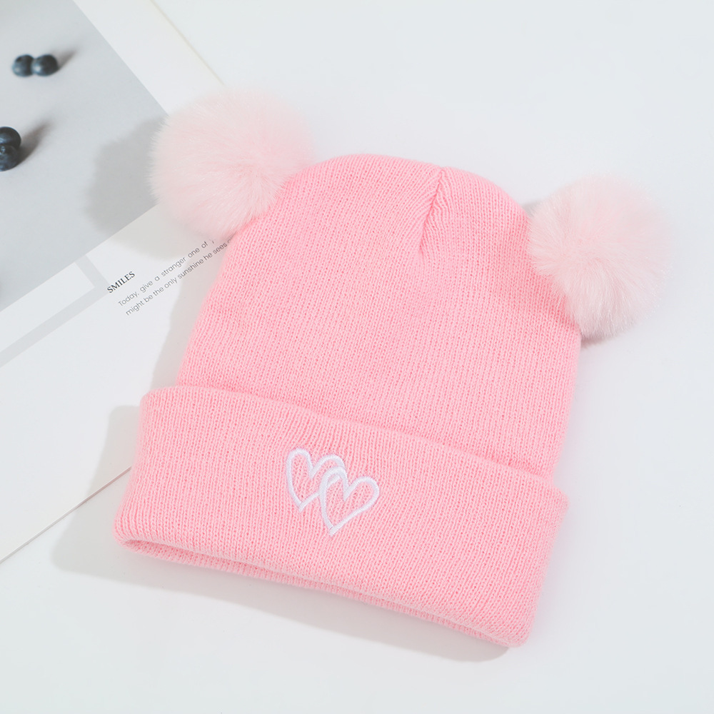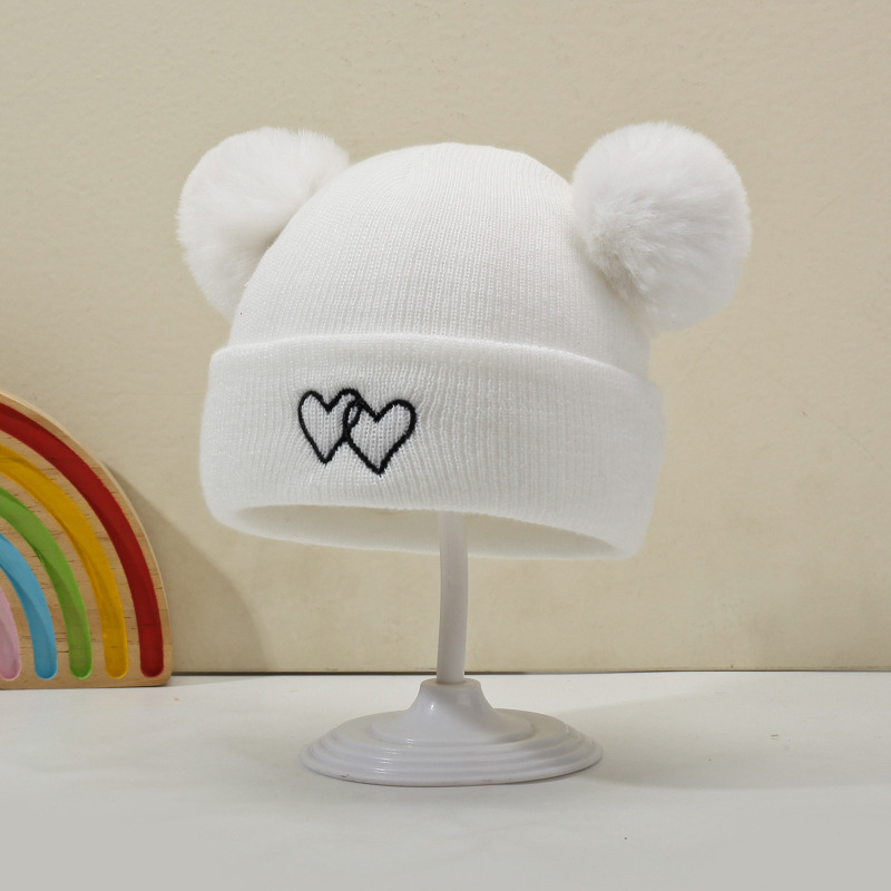 귀여운 아기 니트 모자, 더블 러브 자수, 더블 폼폼 모직 모자, 아기의 편안하고 피부 친화적인 따뜻하고 추운 모자