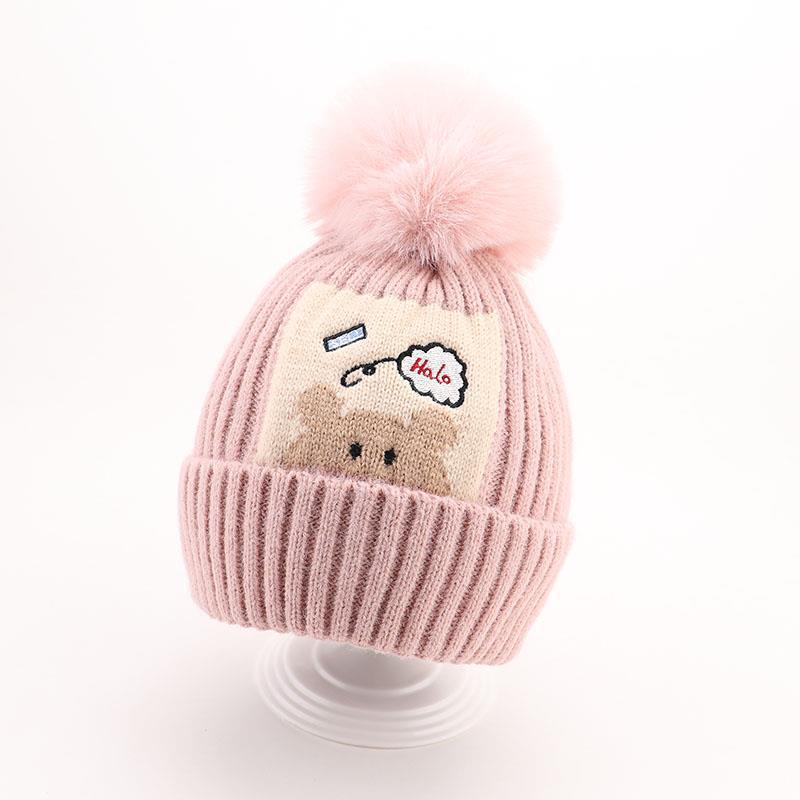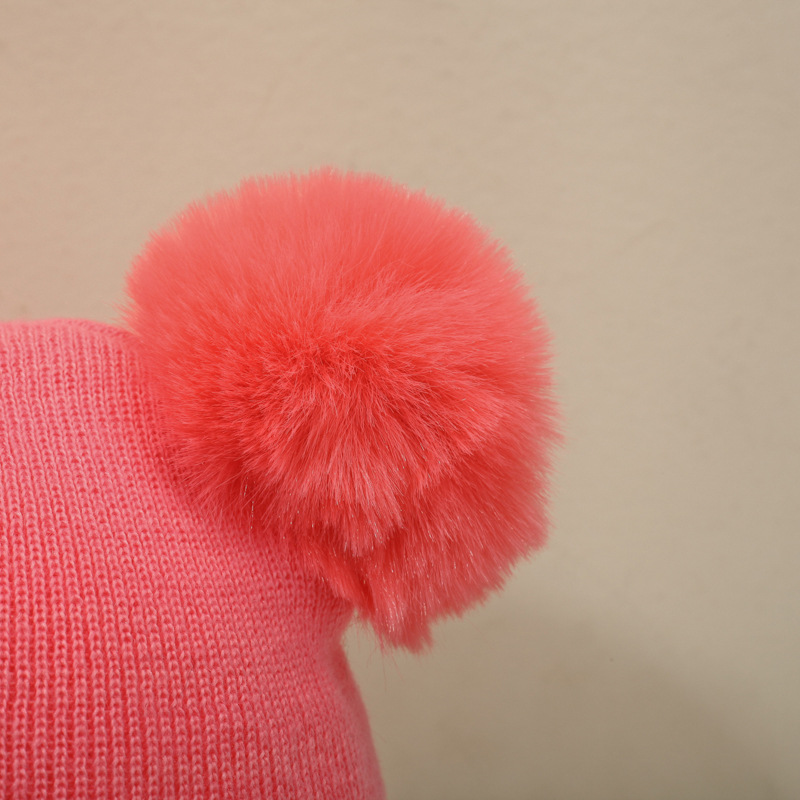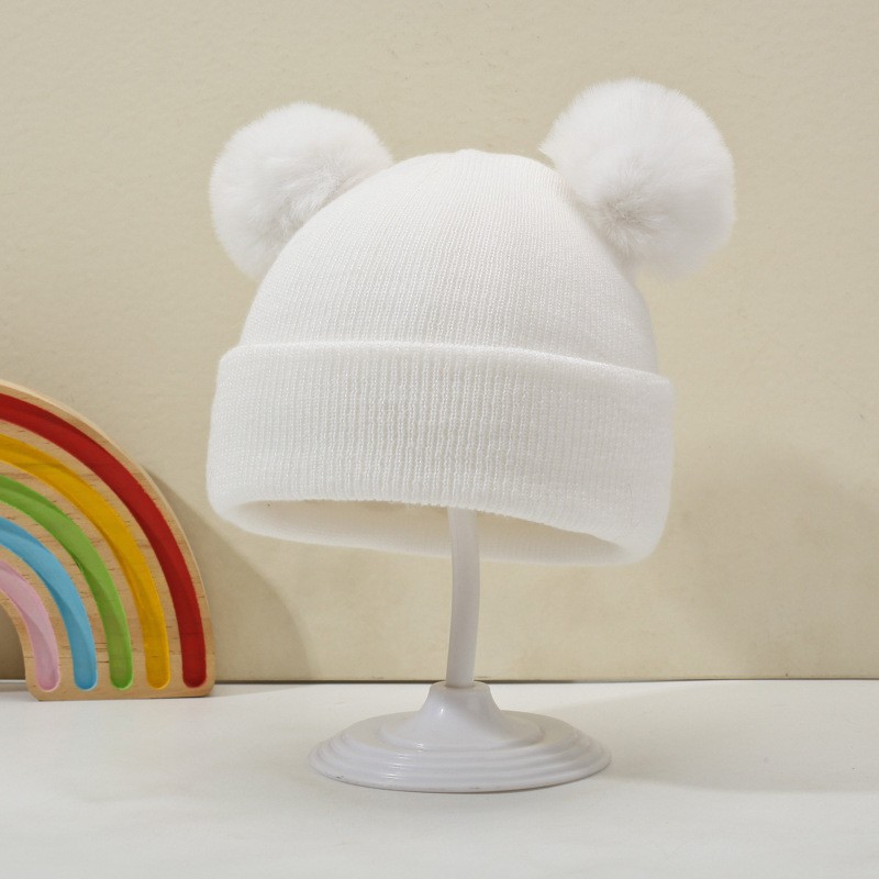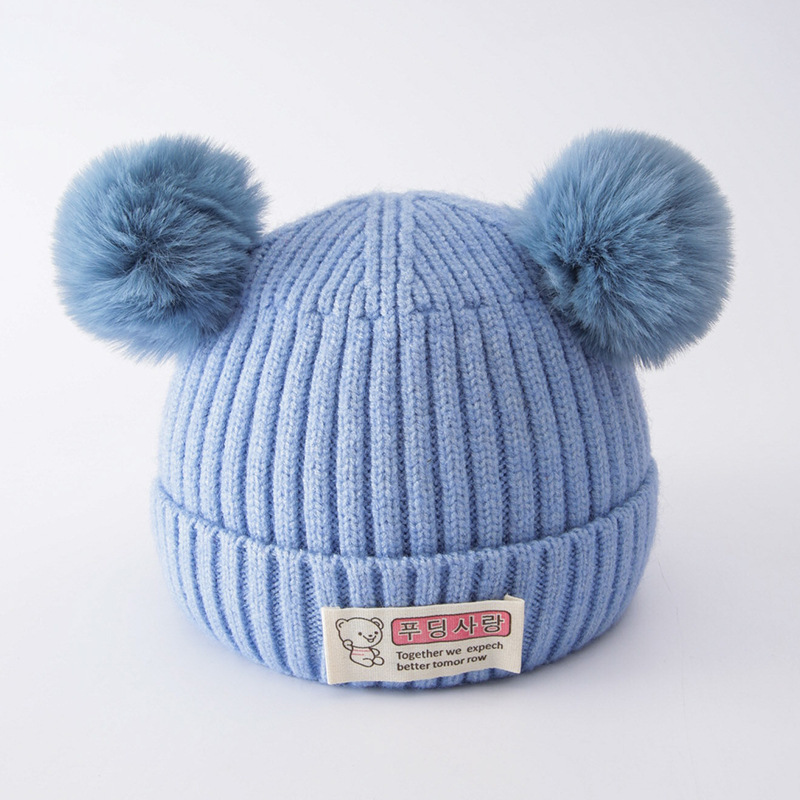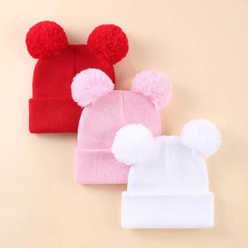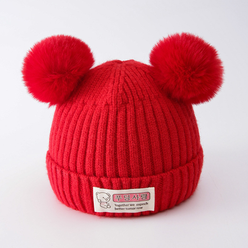 귀여운 아기 니트 모자, 더블 러브 자수, 더블 폼폼 모직 모자, 아기의 편안하고 피부 친화적인 따뜻하고 추운 모자