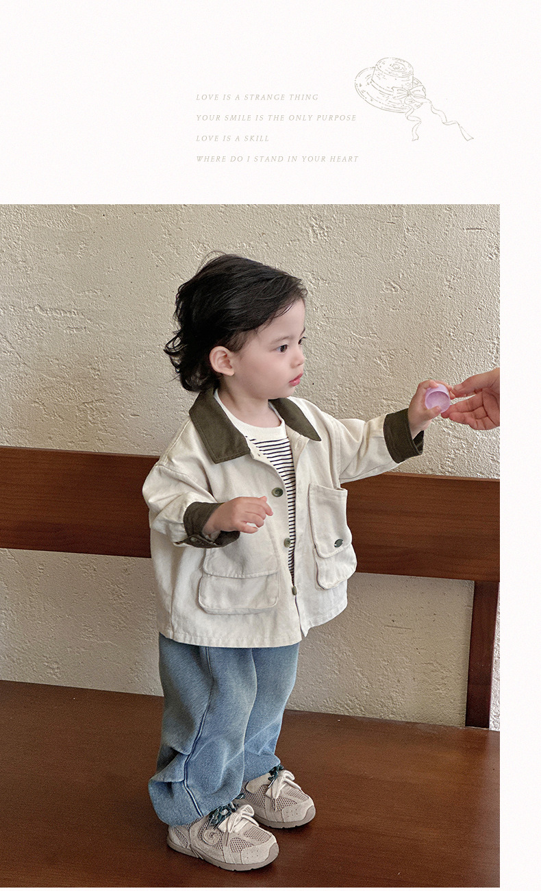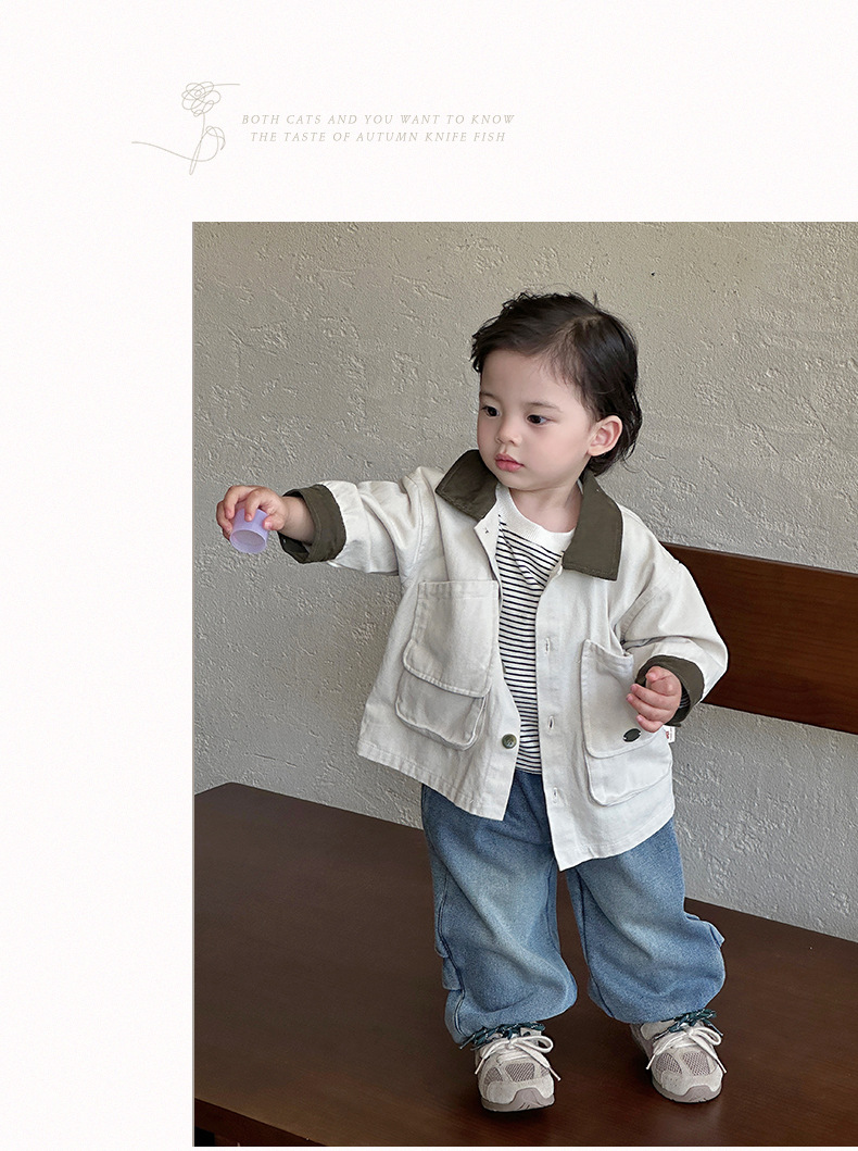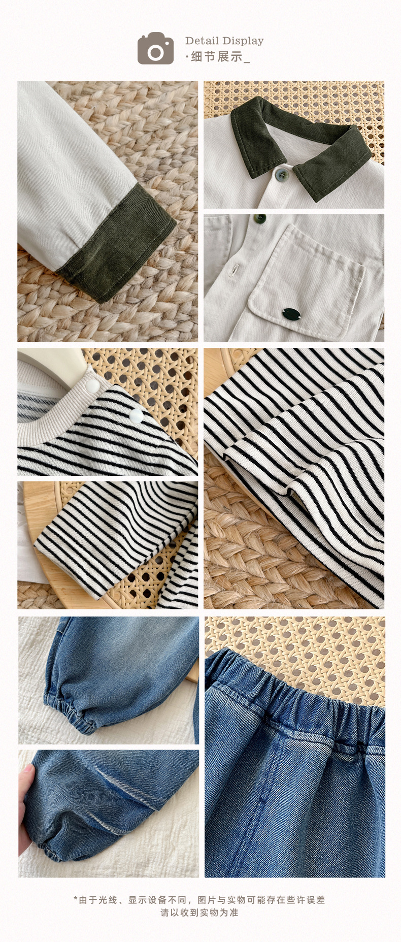 Youhe 아동복 2025 봄, 가을 정장 유아 소년 대형 포켓 코트 청바지 스트라이프 티셔츠 3 피스 세트 3