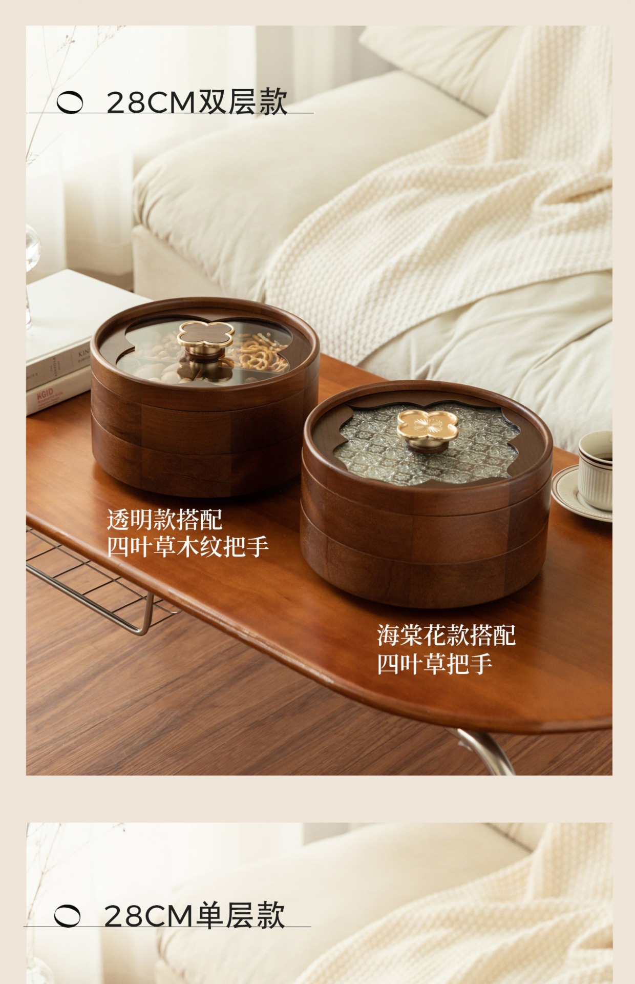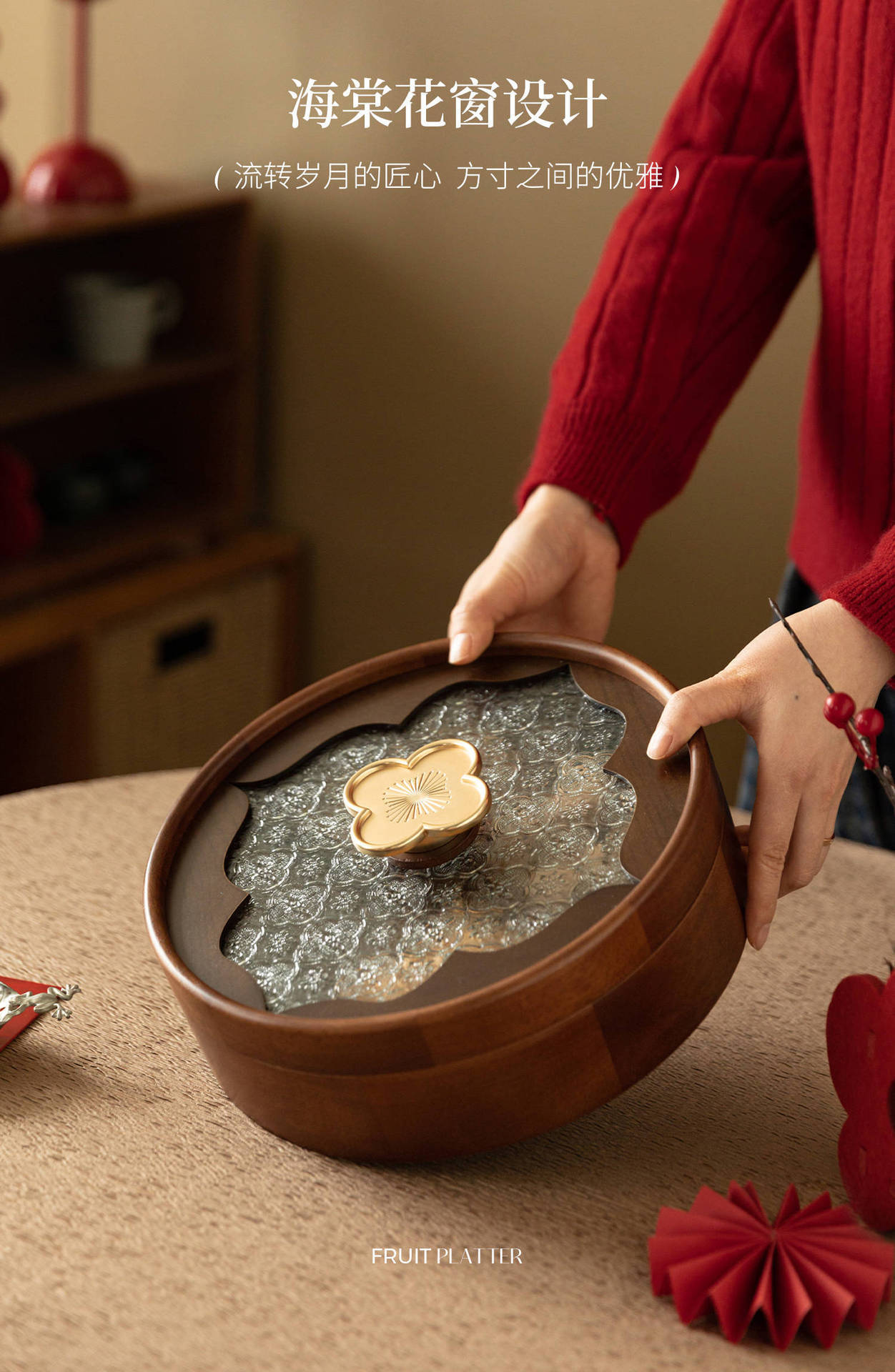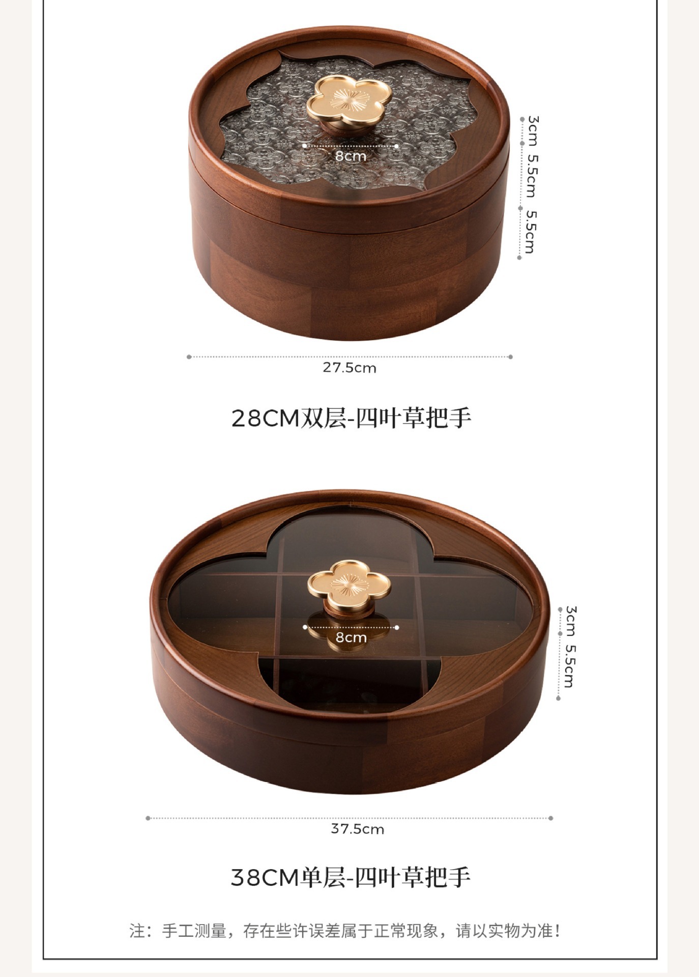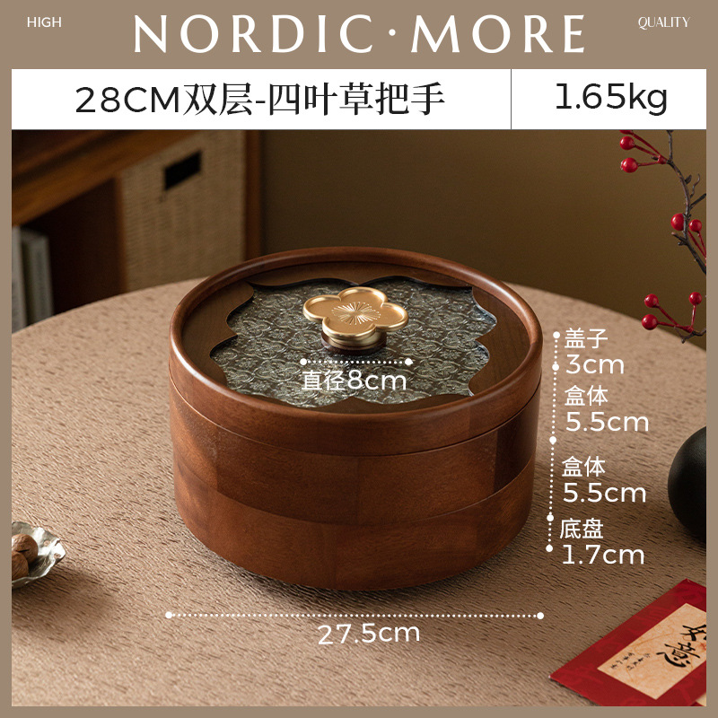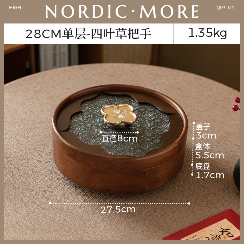• 더블 레이어 원형 투명 과일 접시 - 나뭇결 손잡이 - 28cm