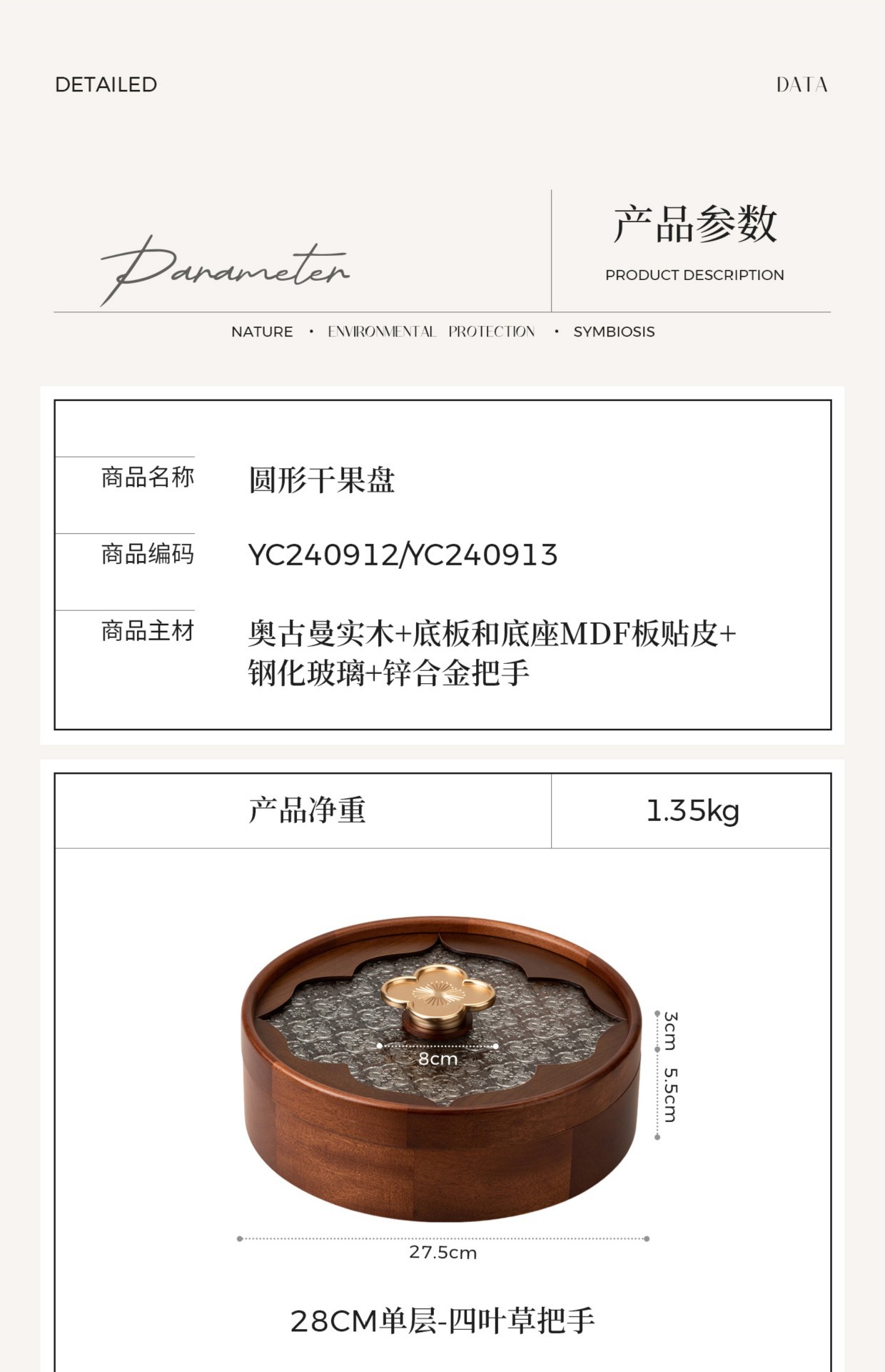 • 단층 원형 투명 과일 접시 - 나뭇결 손잡이 - 28cm